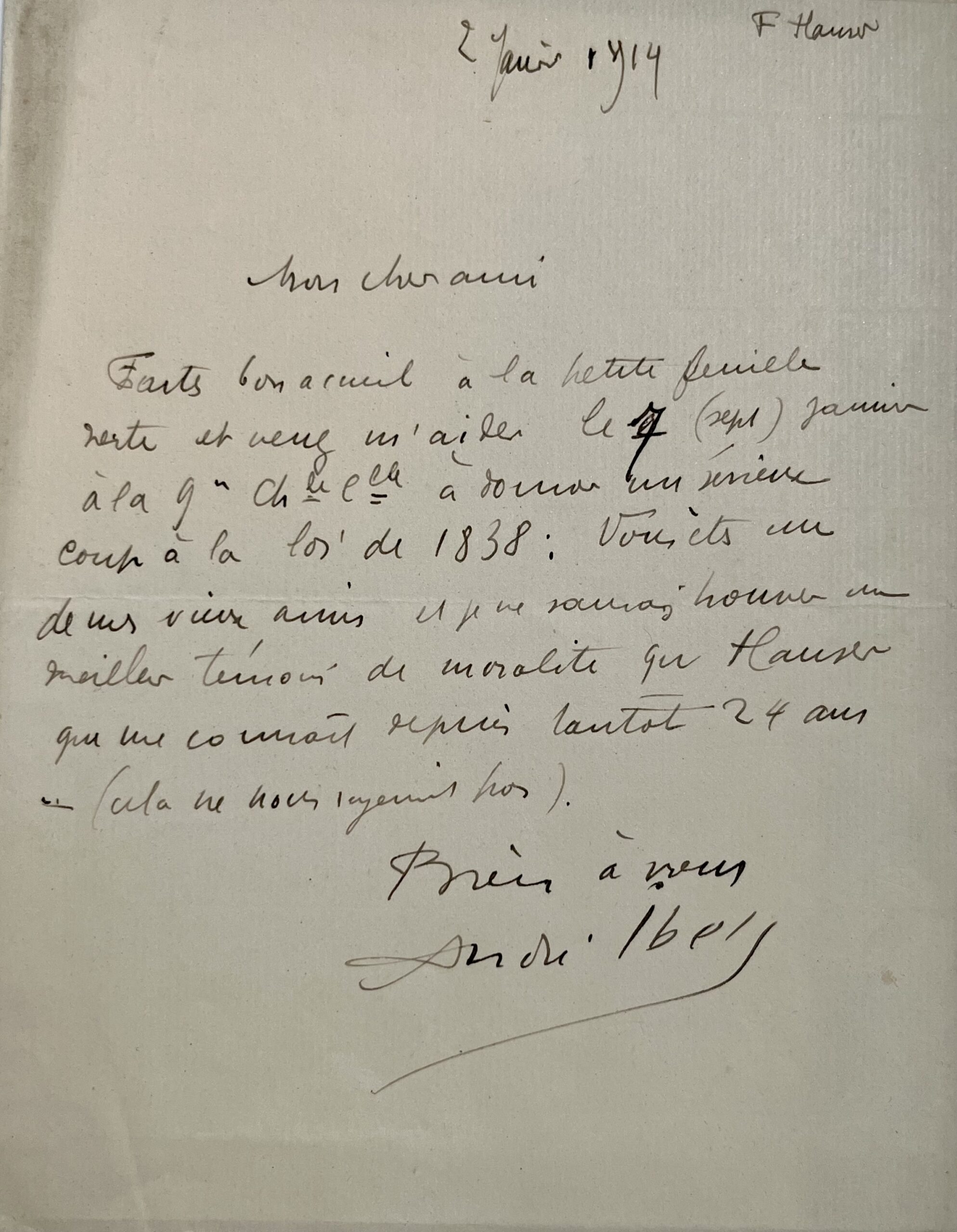 "Faites bon accueil à la petite feuille verte et venez m'aider le 7 (sept) janvier [...] à donner un sérieux coup à la loi de 1838. Vous êtes un de mes vieux amis et je ne saurais trouver un meilleur témoin de moralité que Hauser qui me connaît depuis tantôt 24 ans (cela ne nous rajeunit pas)".