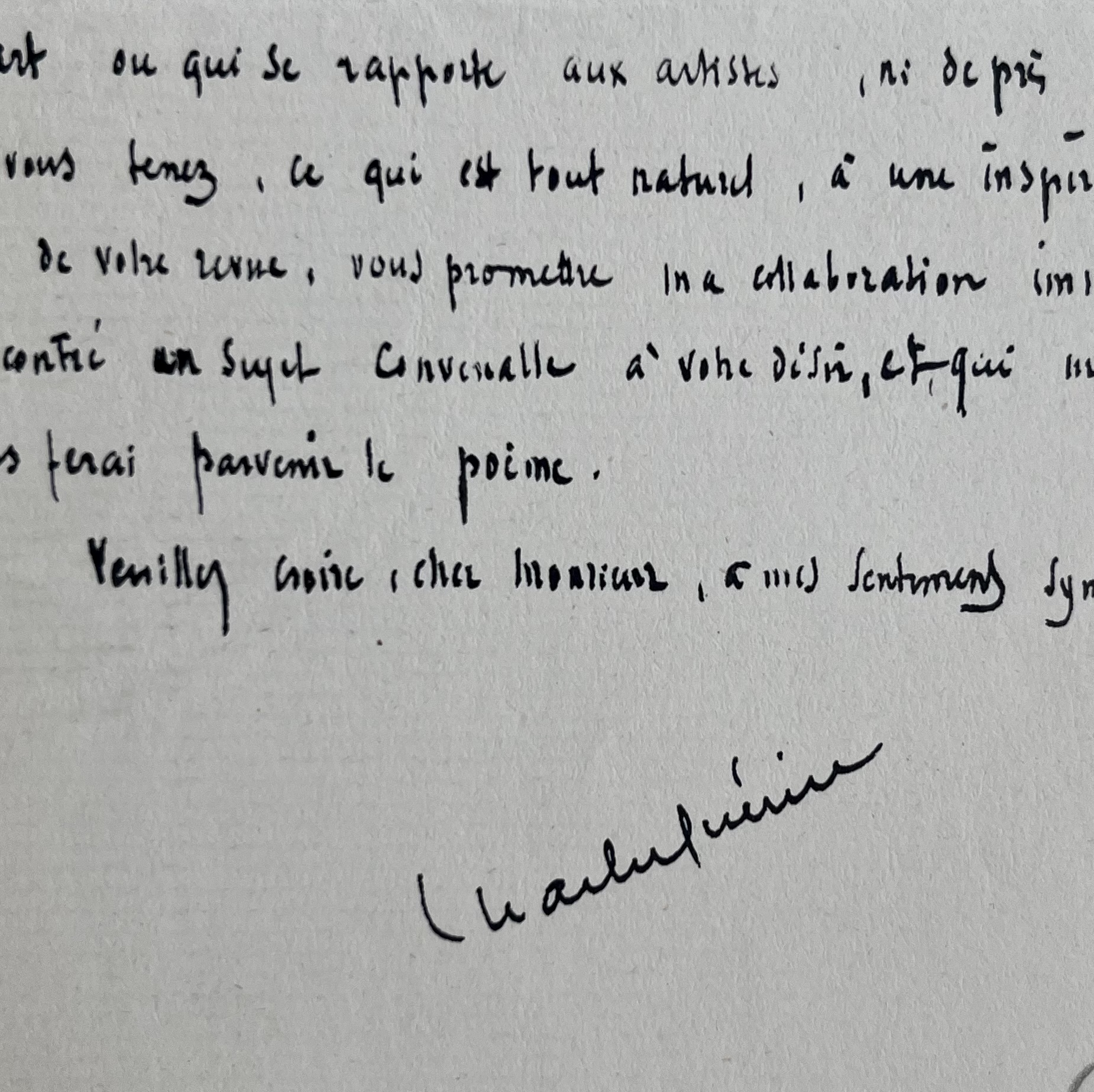 "Je vous remercie vivement de m'avoir demandé des vers pour les Arts de la vie, et ce sera pour moi un vrai plaisir de vous en envoyer. Mais dans le peu de poèmes inédits que j'ai en ce moment je n'en vois pas qui touche l'art ou qui se rapporte aux artistes, ni de près ni de loin. Je ne puis donc pas. Si vous tenez, ce qui est tout naturel, à une inspiration en accord avec le ton de votre revue, vous promettre ma collaboration immédiate, dès que j'aurai rencontré un sujet convenable a votre désir, et qui me dise quelque chose, je vous ferai parvenir le poème".