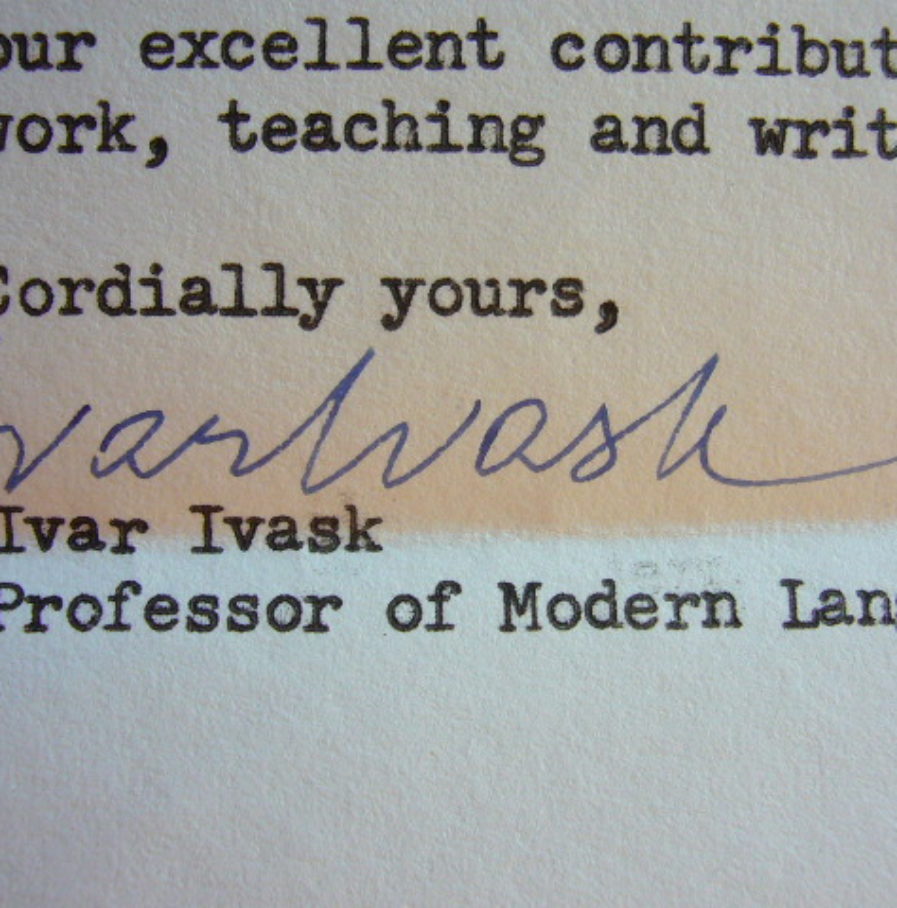 Ivar Vidrik Ivask (Riga, 1927/1992)Ivar Ivask évoque avec enthousiame le nouveau recueil poétique de Jorge Guillén [(1893/1984), poète espagnol], Homenaje, dans lequel il exalte les personnes phares du monde des arts et les sciences. "I wrote to the poet upon having read his Homenaje in page proof (a unique privilege)! It is not a scholarly, objective analysis of this third great book, rather my subjective reaction, a kind of "critique de l'identification" after a first and deeply moving encounter. I am not sure whether Homenaje does not even surpass Clamor (though not, of course, Cantico) on richness, variety. But this is measuring Guillén with Guillén - the highest possible standart [...]».