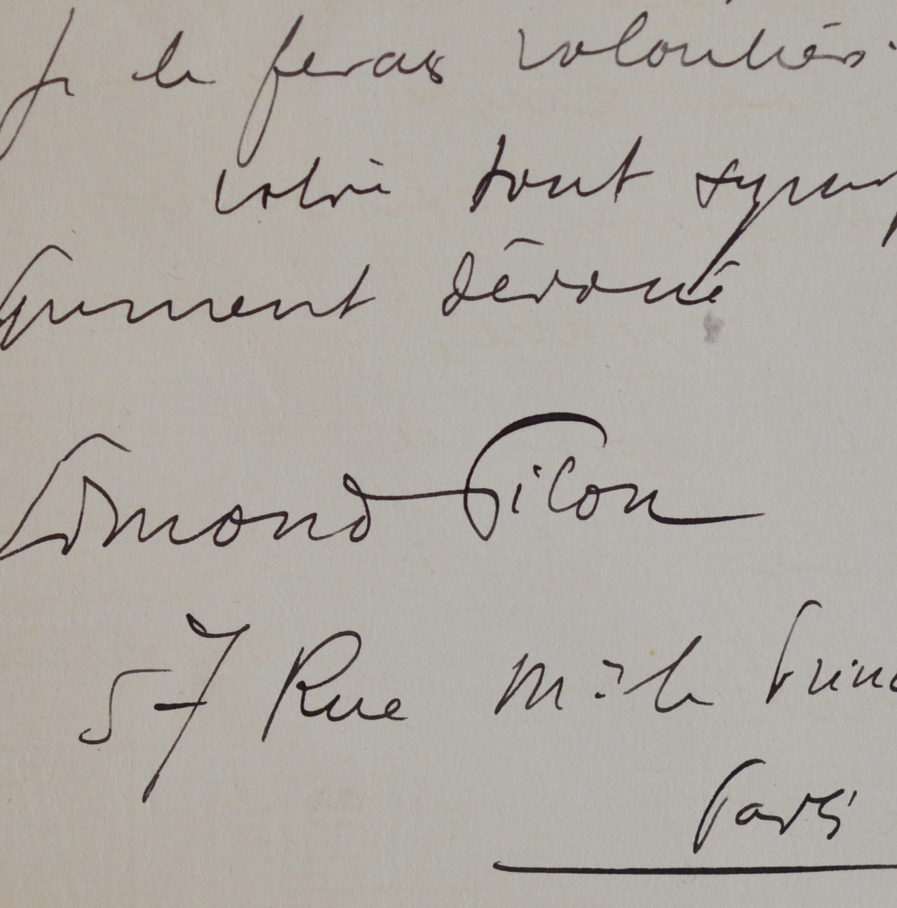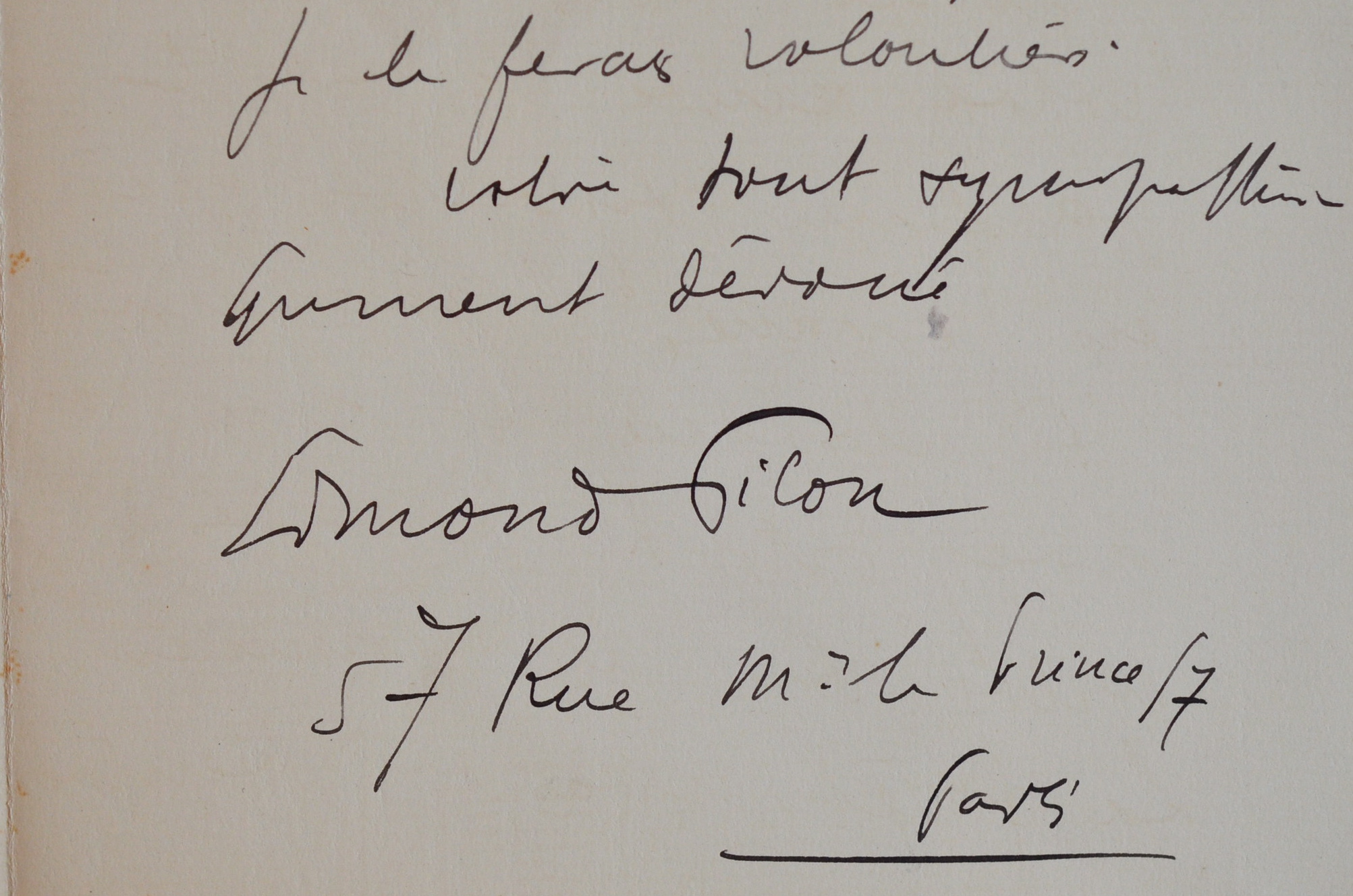 Edmond Pilon (Paris, 1874/1945)Belle lettre après la lecture de "La Forêt" roman de son correspondant publié en 1903 sur la forêt de Fontainebleau. "J'ai lu avec un intense plaisir le livre que vous m'avez adressé de Marlotte et où il semble que chante toute la forêt à l'heure splendide et lugubre d'automne. Je ne puis qu'être de l'avis de Rachilde et vous dire tout mon étonnement de la maîtrise que vous possédez dès le début, de l'excellence de vos peintures et de vos caractères. Le couple des Heutre, Vermand, Line, autre couple douloureux n'ont pas eu de meilleurs historiens de leurs douleurs et de leurs joies. J'aime les comparer depuis Magloire, la hachette de cette géante cathédrale d'arbres, et le Naïsse pleurard et vagabond, au grand coeur. Mais ce que j'aime, plus encore, c'est le parfum mystérieux qui en émane, l'emprise si absolue et que vous avez dite si bien des arbres sur les hommes. La forêt, avant Heutre ou Vermand, c'est le personnage central du livre, c'est la grande mystérieuse qui redonne des forces au corps et débilite l'esprit. La forêt c'est une déesse. Nos ancêtres, les premiers Celtes, lui dédiaient des autels [...]".