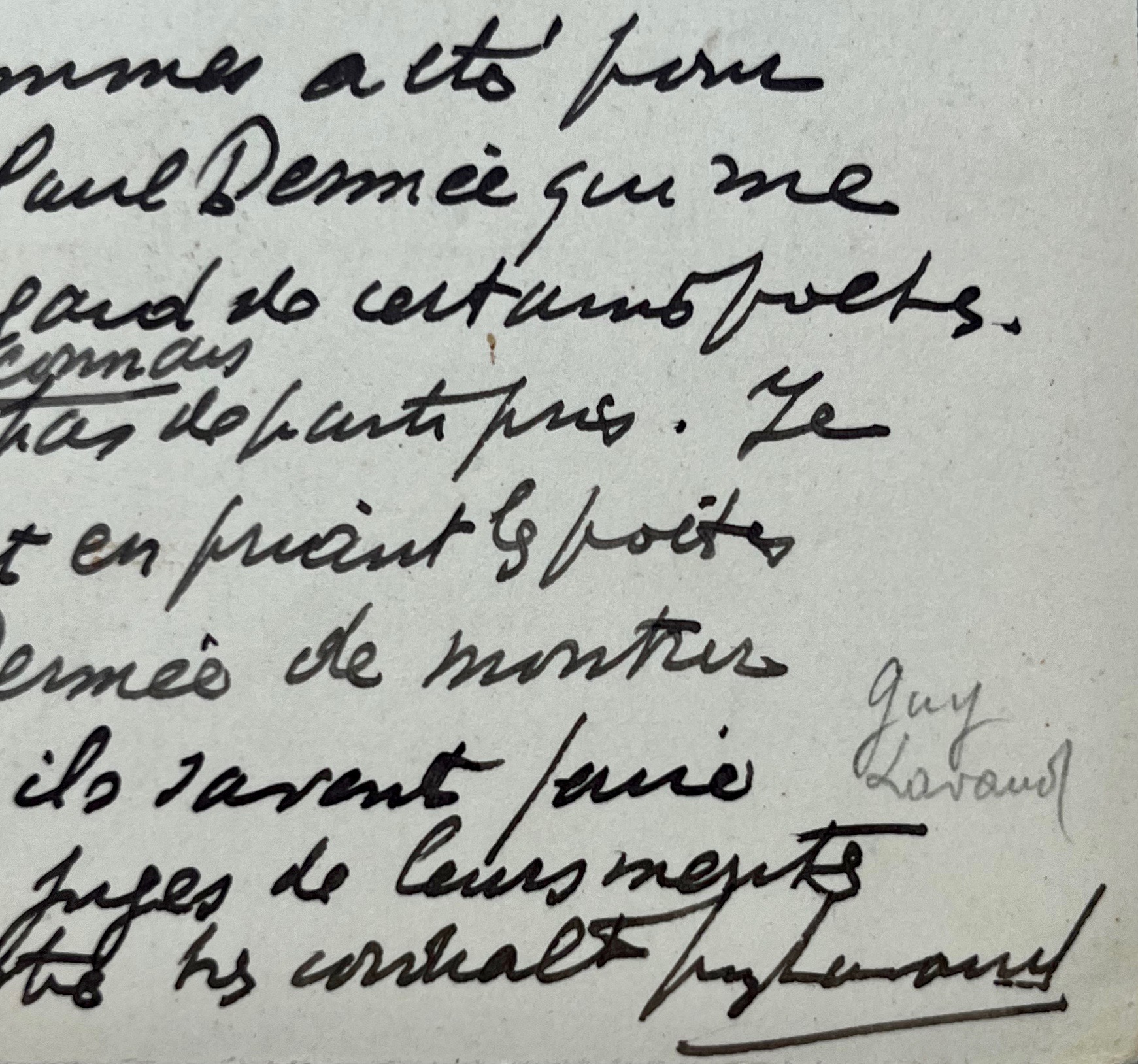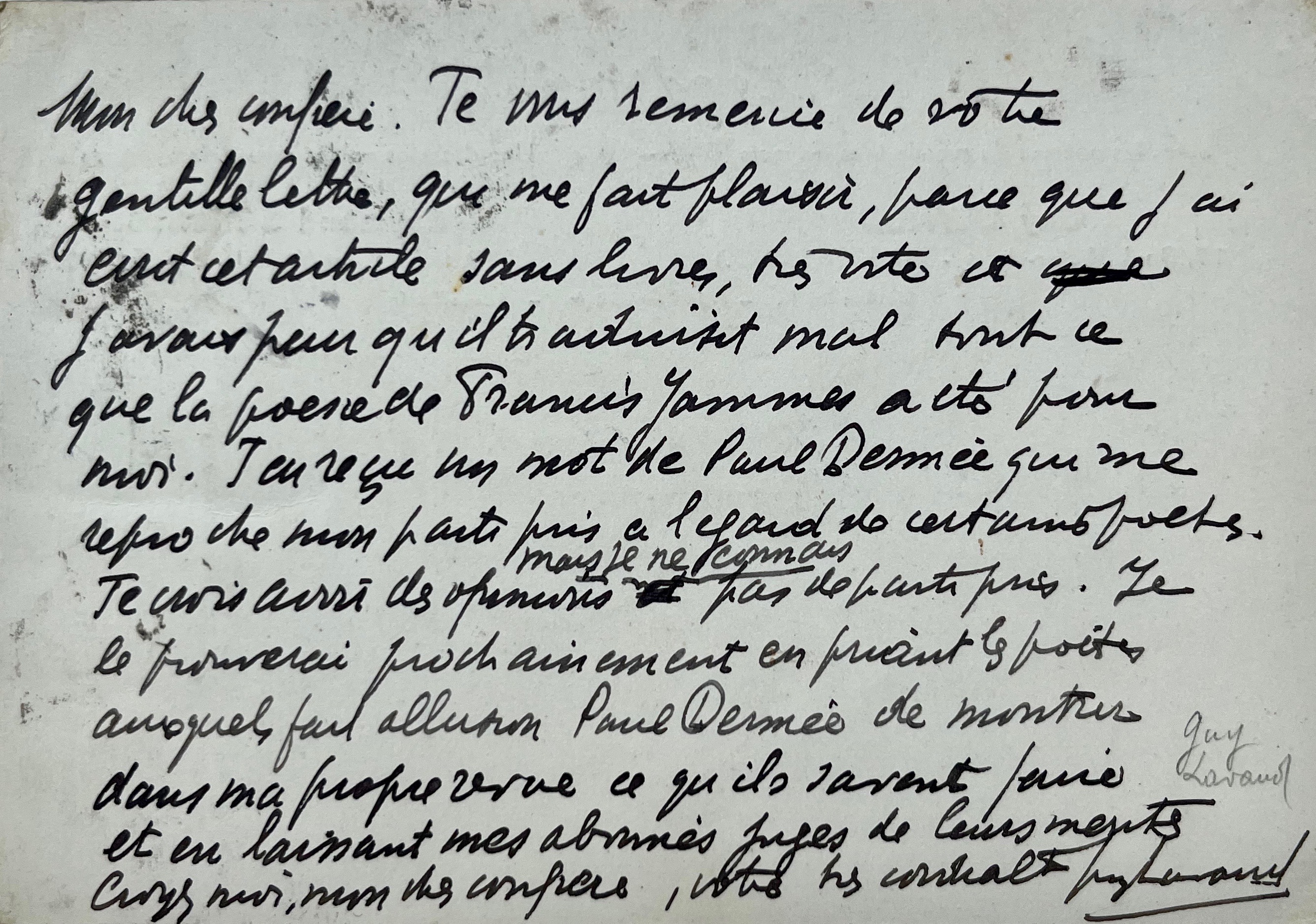 "Mon cher confrère. Je vous remercie de votre gentille lettre, qui me fait plaisir, parce que j'ai écrit cet article sans livres, très vite et j'avais peur qu'il traduisit mal tout ce que la poésie de Francis Jammes a été pour moi. J'ai reçu un mot de Paul Dermée [critique littéraire Belge] qui me reproche mon parti pris à l'égard de certains poètes. Je crois avoir des opinions mais je ne connais pas de parti pris. Je le prouverai prochainement en priant les poètes auxquels fait allusion Paul Dermée de montrer dans ma propre revue ce qu'ils savent faire et en laissant mes abonnés juges de leurs mérites [...]".