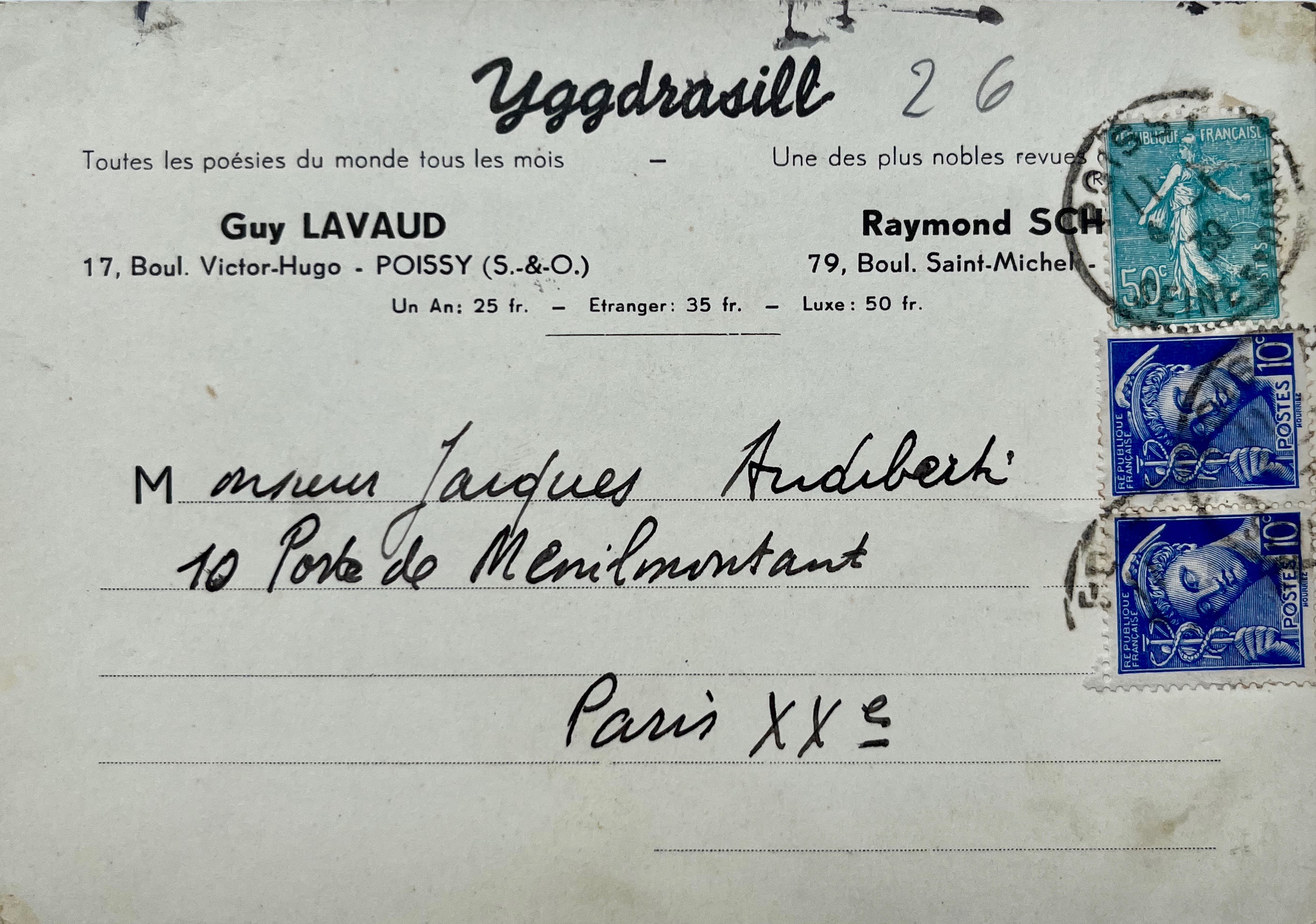 En-tête imprimé "Yggdrasil - Guy Lavaud - Raymond Schwab".