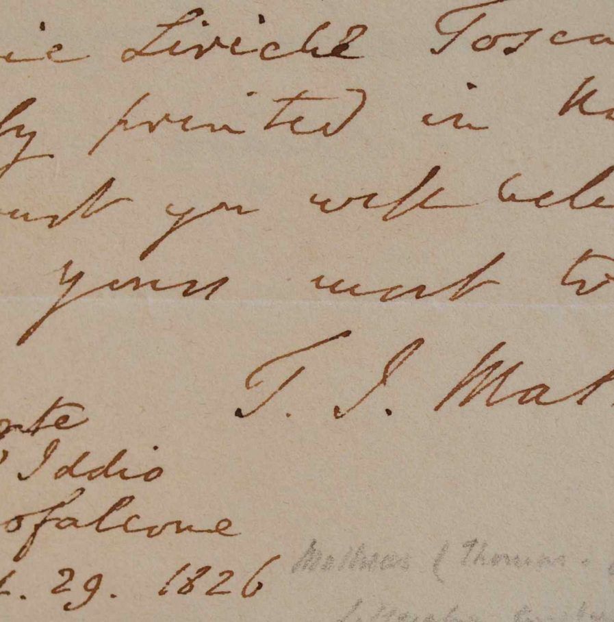 Le poète Thomas James Mathias envoie un exemplaire de son livre Poesie Liriche Toscane, un essai sur la poésie lyrique toscane paru en 1824 à Naples.