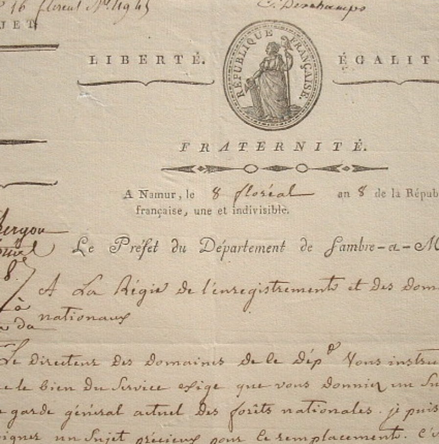 Emmanuel Pérès de La Gesse (Boulogne-sur-Gesse, 1752/1833)Pérès de La Gesse, qui fut le seul préfet du département conquis de Sambre-et-Meuse, en Belgique, souhaite qu'un nouveau garde général des forêts nationales soit nommé. «Je puis vous désigner un sujet précieux pour le remplacement. C'est le citoyen Lemaître qui réunit à beaucoup d'intelligence et à une activité peu ordinaire, des principes de probité qui ne se sont jamais démentis. Il a une parfaite connaissance des lieux, ayant été constamment attaché aux représentants du peuple qui furent délégués dans la ci-devant Belgique. Ce citoyen se trouve maintenant à Namur et il n'attend pour commencer ses fonctions que la preuve de confiance que je vous demande pour lui».