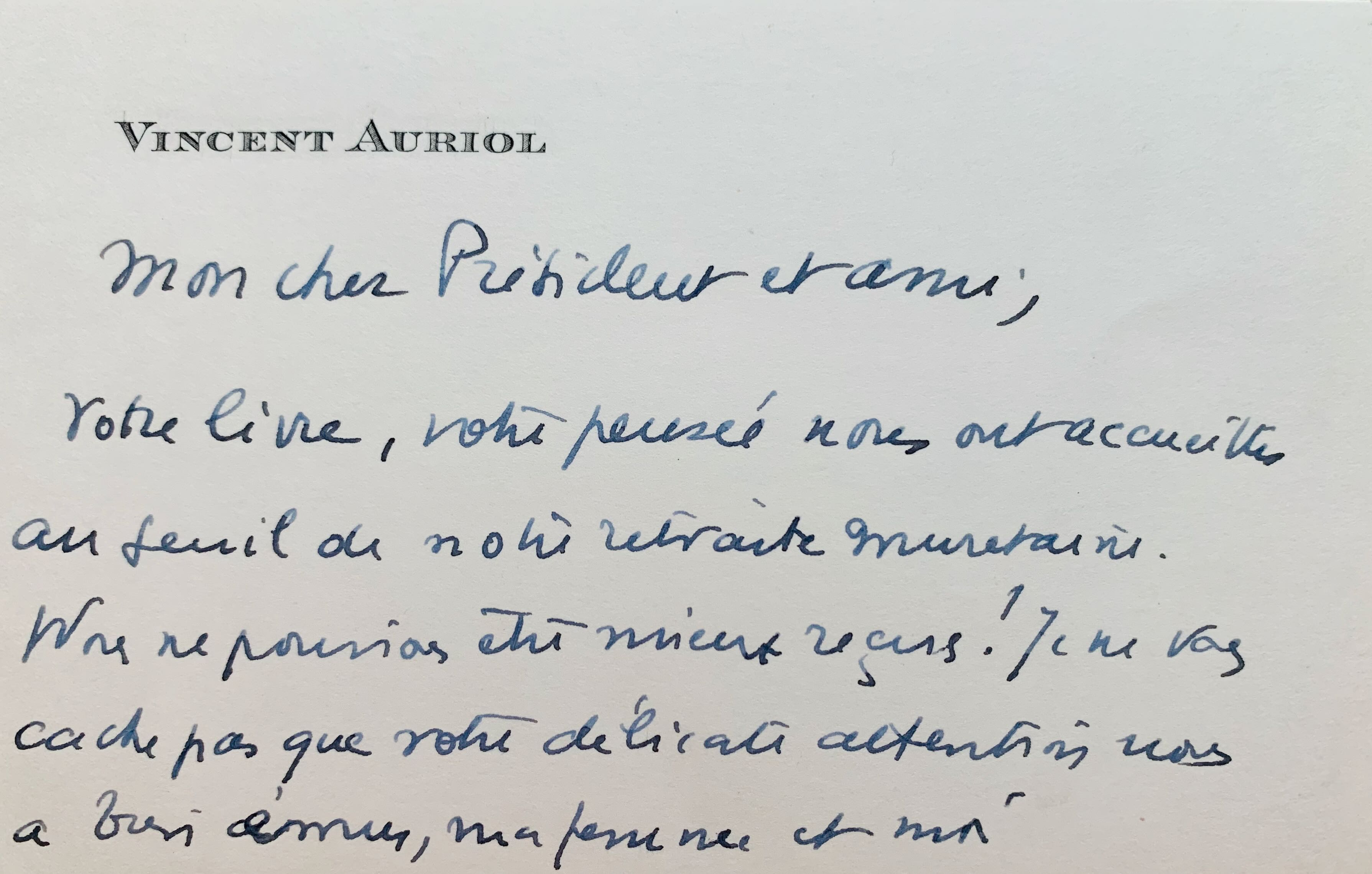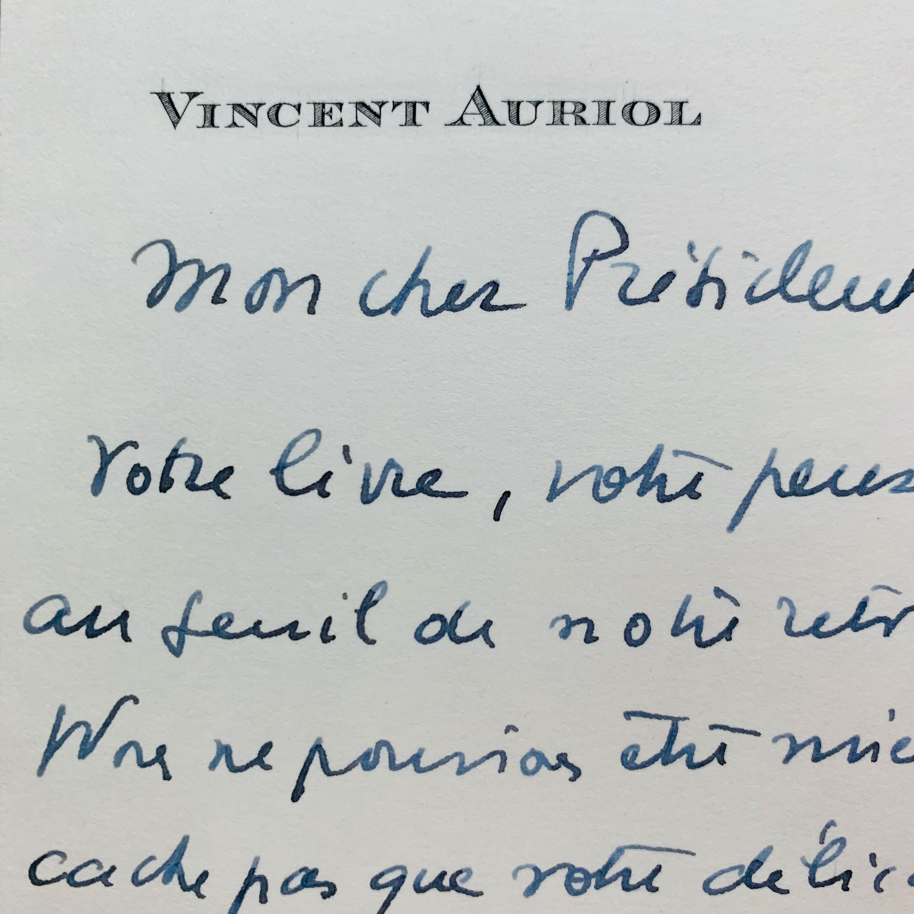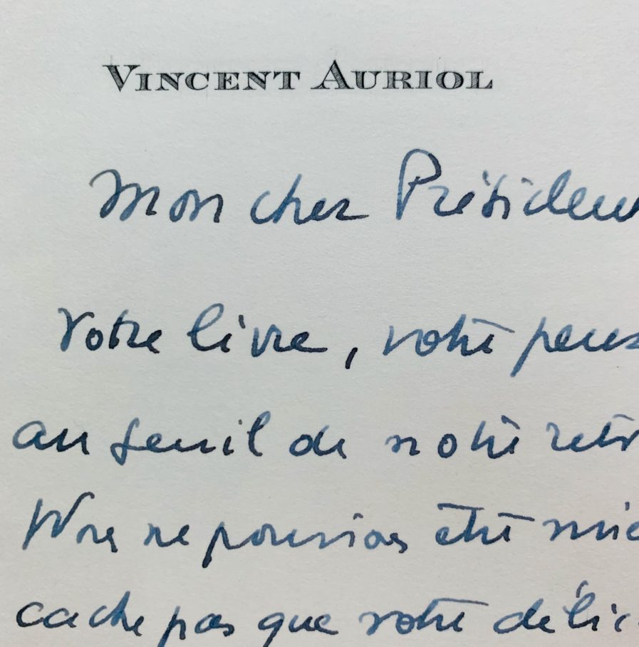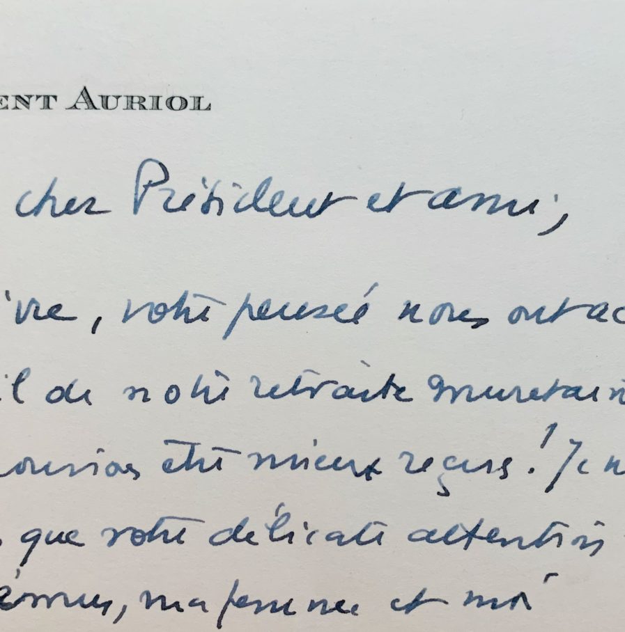 Alors qu'il vient tout juste terminer son mandat de président de la République (16 janvier 1954), Vincent Auriol répond à Pierre Brisson qui lui a adressé son dernier livre, Les Lunettes vertes (paru en 1953).