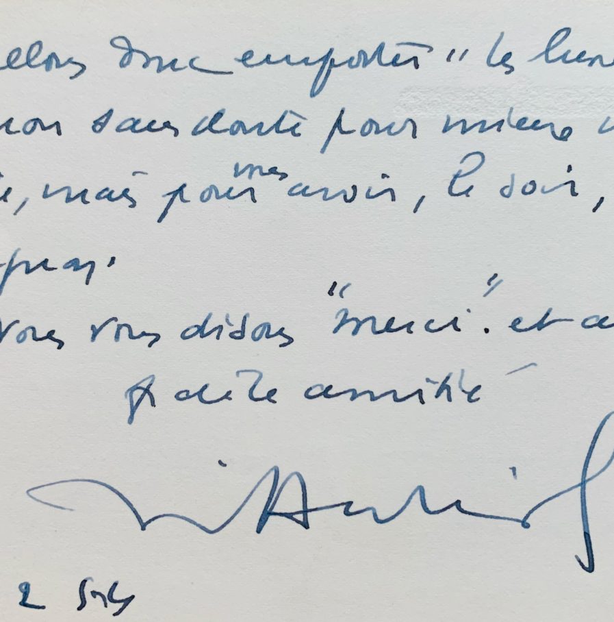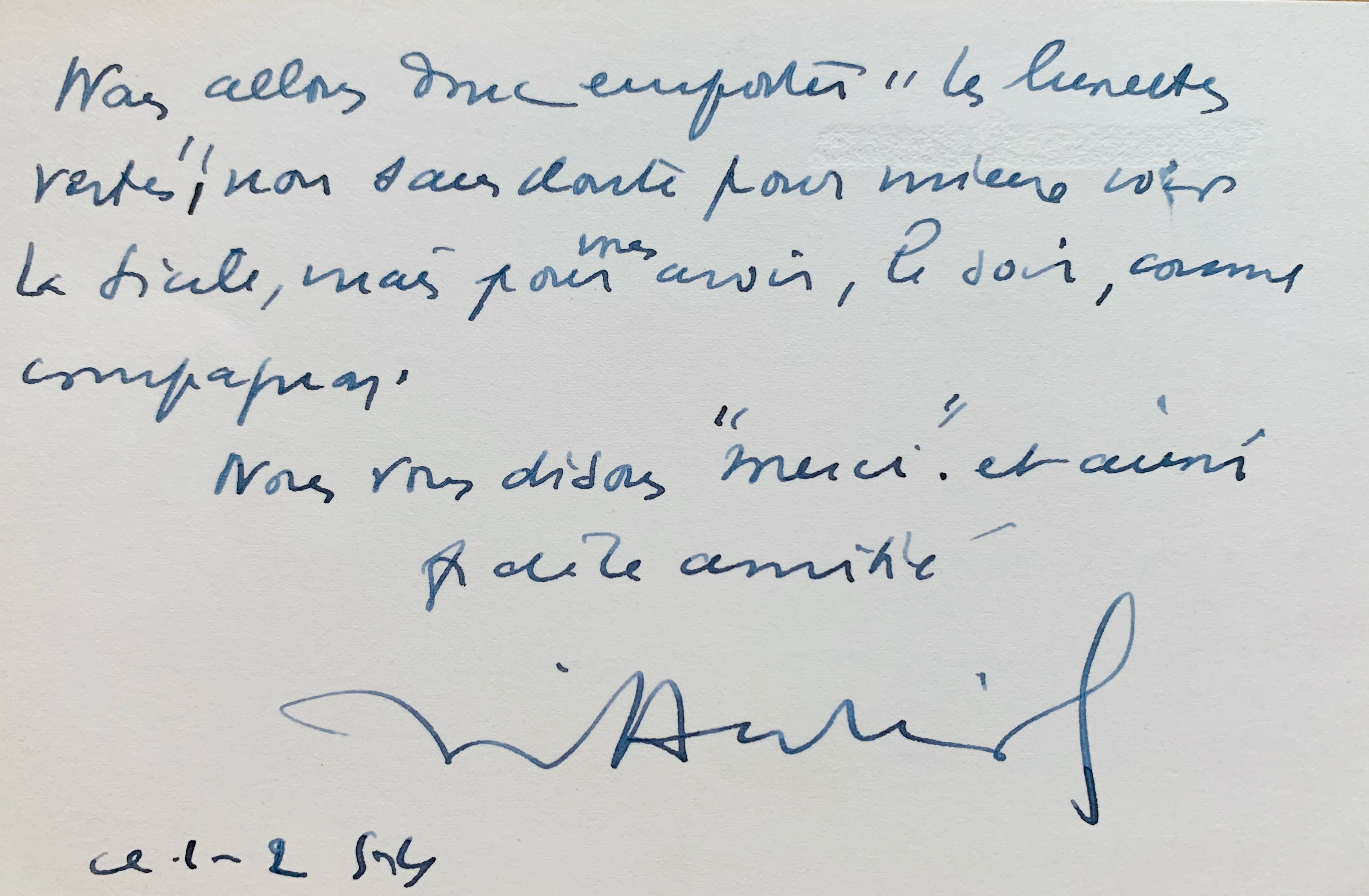 "Votre livre, votre pensée nous ont accueillis au seuil de notre retraite muretaise. Nous ne pouvions être mieux reçus! Je ne vous cache pas que votre délicate attention nous a bien émus, ma femme et moi. Nous allons donc emporter "Les Lunettes vertes" non sans doute pour mieux voir la Sicile, mais pour vous avoir, le soir, comme compagnon. Nous vous disons "merci" et aussi fidèle amitié".