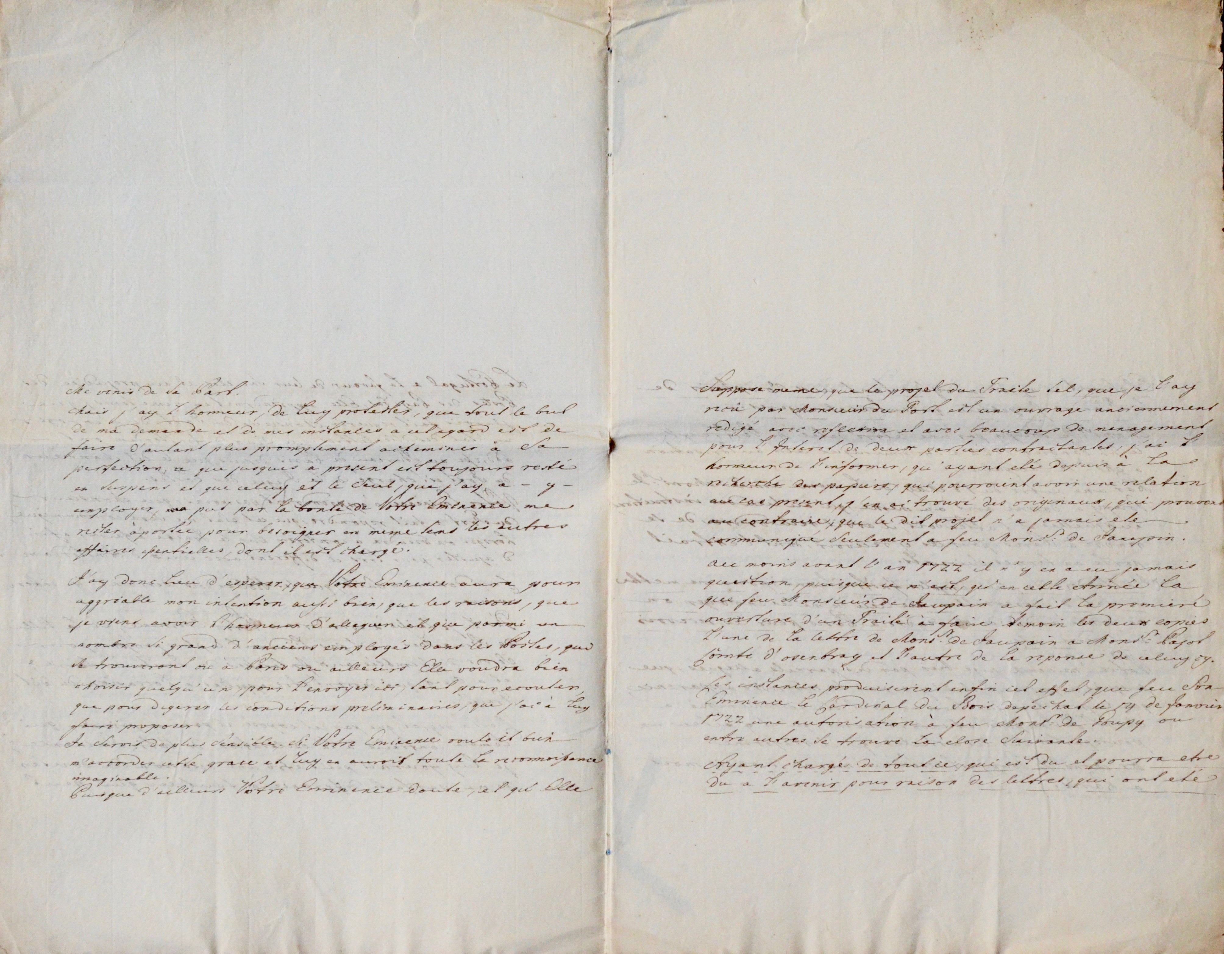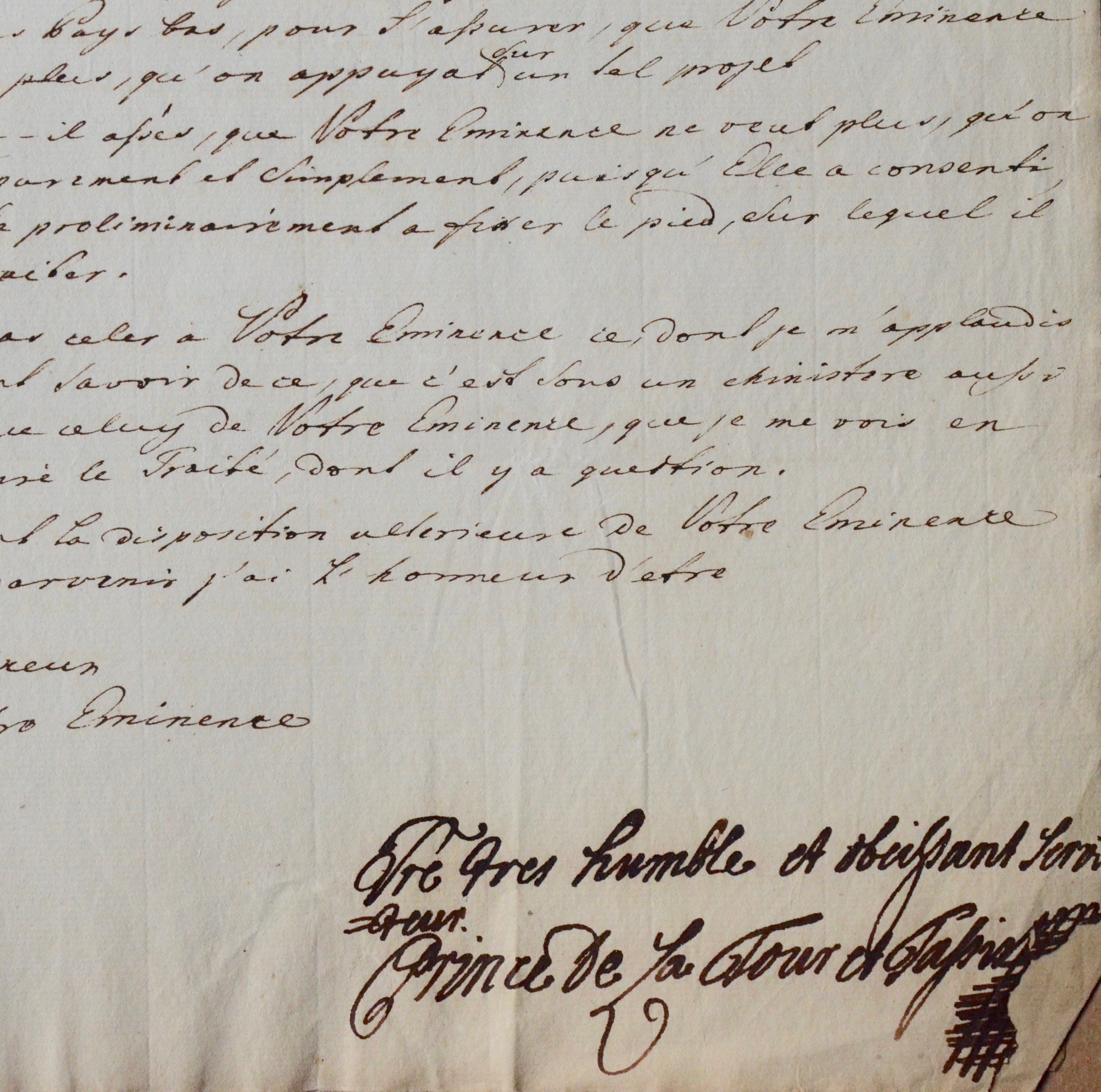"Votre Eminence m'a fait l'honneur de m'écrire en date du 27 du mois passé, que non seulement elle consentait et qu'elle approuvait qu'il fut traité des conditions préliminaires pour fixer un pied du traité à faire [...]".