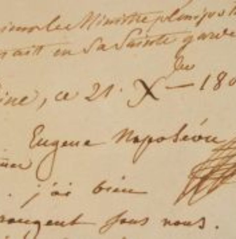 Eugène Beauharnais (de) (Paris, 1781/1824)Belle lettre d'Eugène de Beauharnais. Il adresse à son correspondant "4 lettres pour Sa Majesté l'Empereur et Roi et une pour Sa Majesté la Reine de Bavière. Je joins aussi plusieurs dépêches pour Munich et pour le quartier général de la Grande armée. Je les recommande à vos soins. Je vous remercie, monsieur le Ministre plénipotentiaire, de l'accueil aimable que vous avés bien voulu faire à la députation du Royaume d'Italie. Je suis infiniment sensible à cette nouvelle marque de vos sentimens pour Sa Majesté et pour moi [...]". Il ajoute cette intéressante note de sa main : "Je vous prie de me continuer vos nouvelles de l'Autriche. J'ai bien peur que les affaires s'arrangent sans nous. Nous mourrons ici d'impatience de faire quelque chose".