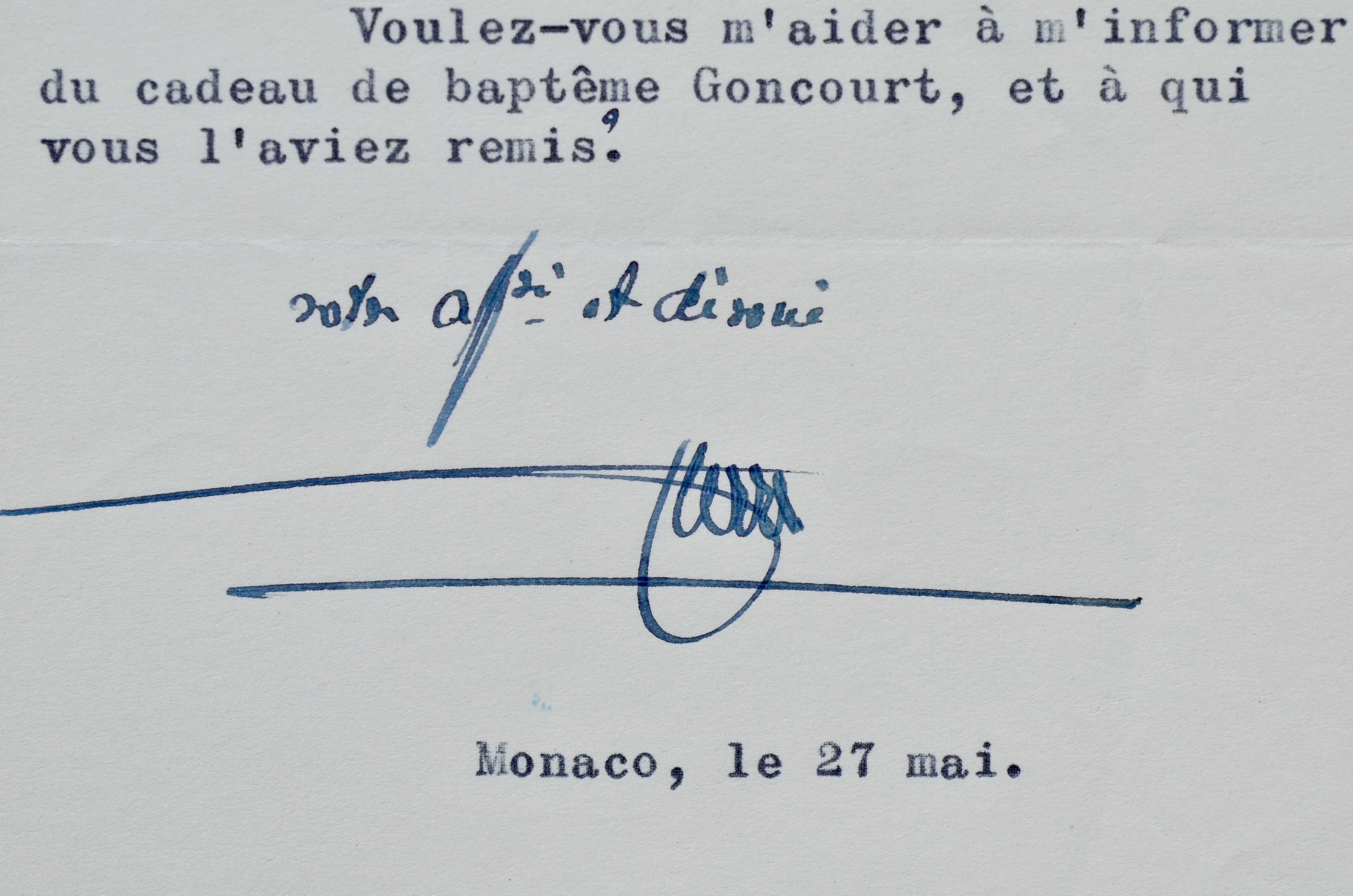 Enigmative missive du prince Pierre de Monaco. "Je vous remercie vivement de votre lettre. Votre mélancolie rejoint exactement la mienne au début de cette semaine si dangereuse. Voulez-vous m'aider à m'informer du cadeau de baptême Goncourt, et à qui vous l'aviez remis?"