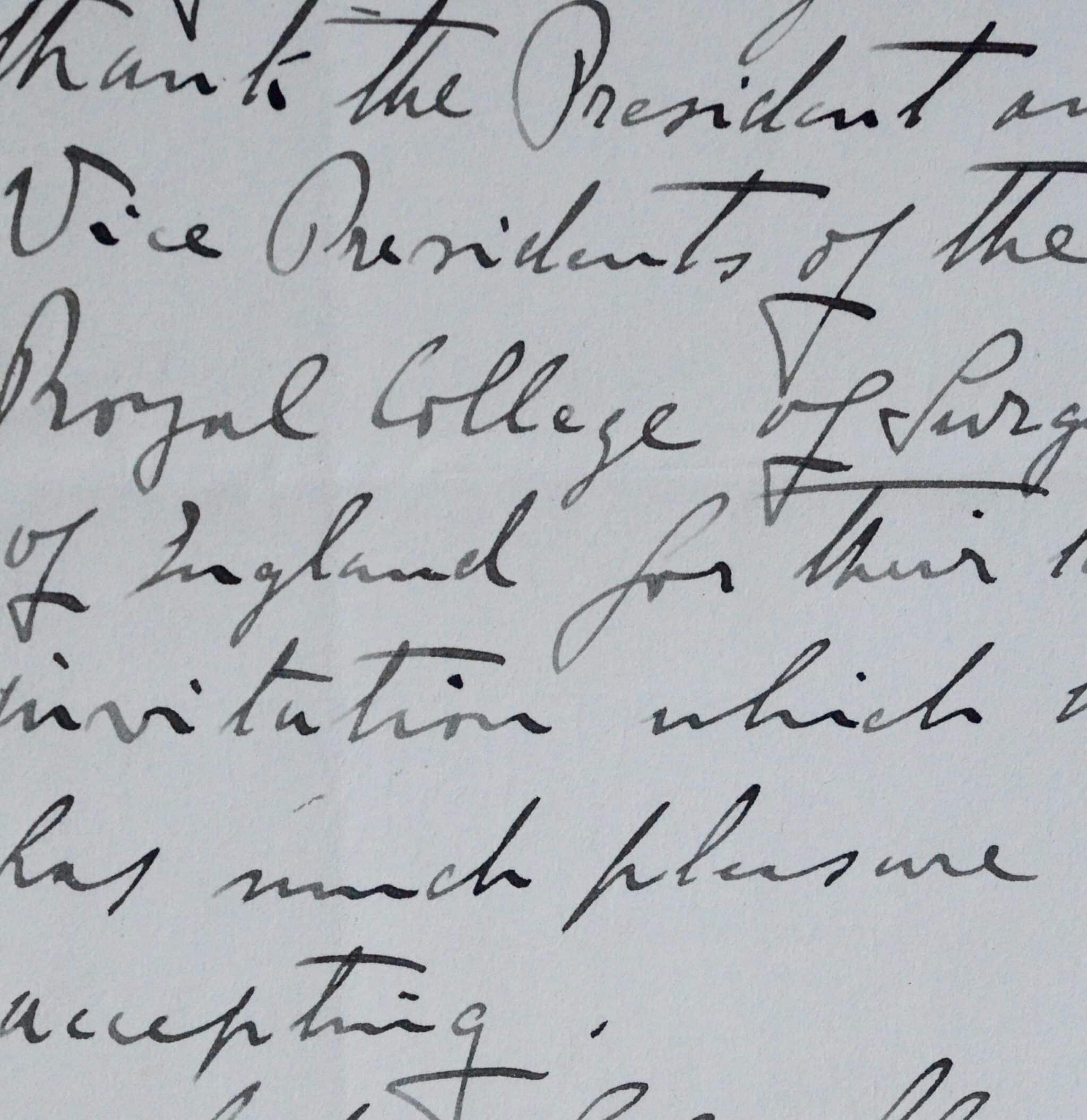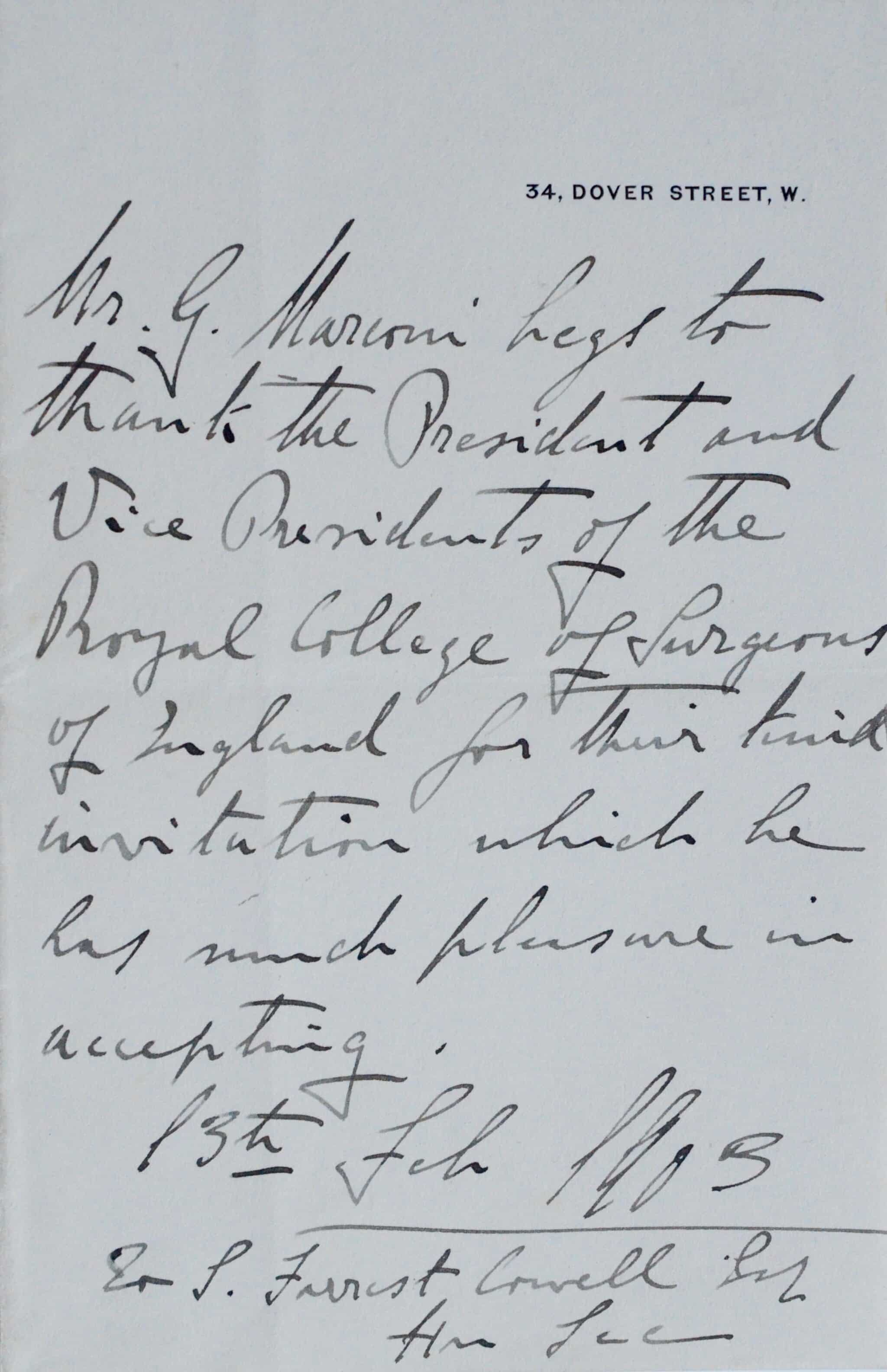 "Mr. G. Marconi begs to thank the President and vice Presidents of the Royal College of Surgeons of England for their kind invitation which he has much pleasure in accepting".
