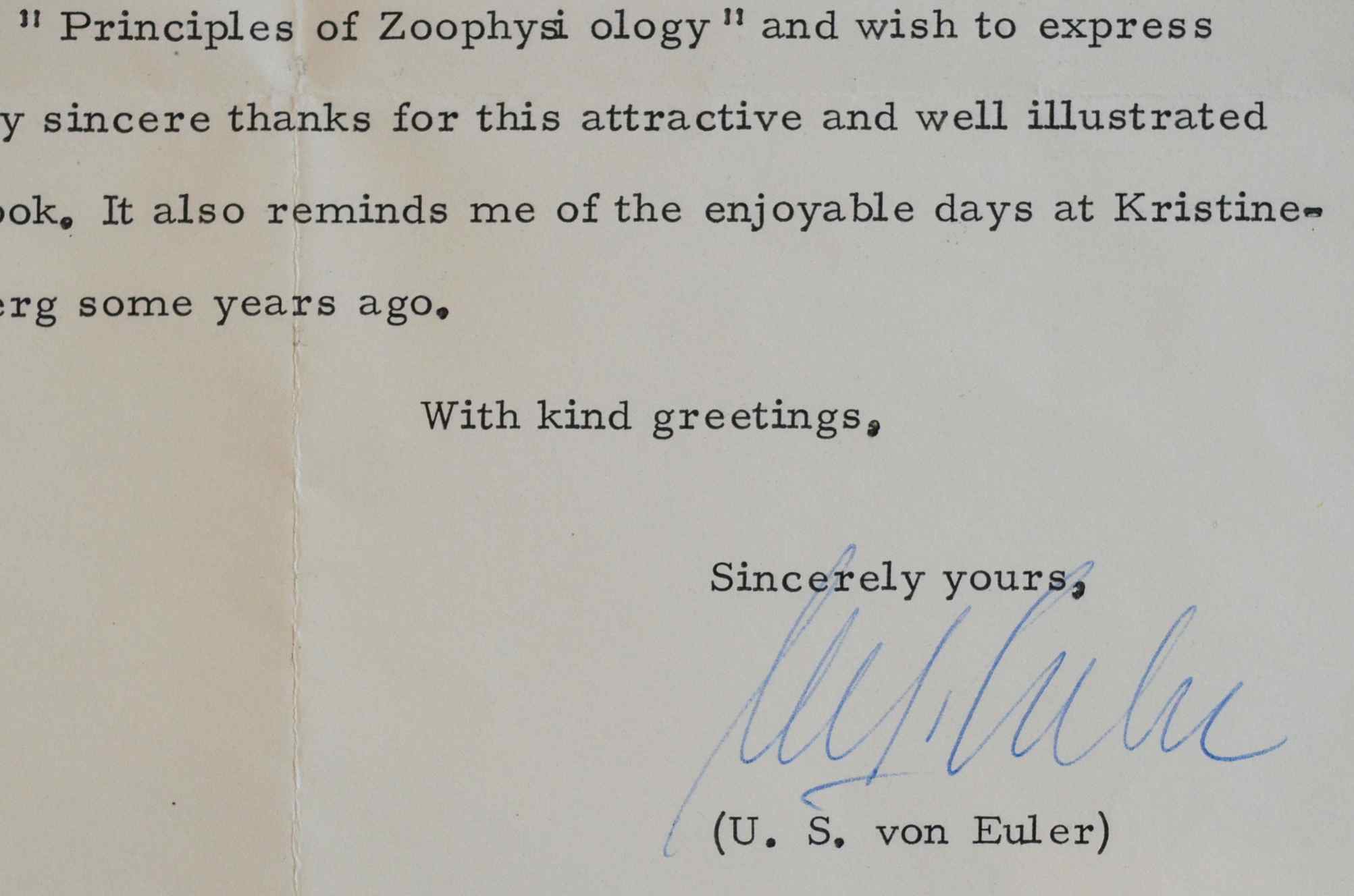 Ulf von Euler accuse réception d'un exemplaire de l'édition anglaise des Principes de zoophysiologie de Boris Rybak. "I wish to express my sincere thanks for this attractive and well illustrated book. It also reminds me of the enjoyable days at Kristineberg some years ago".