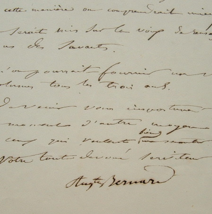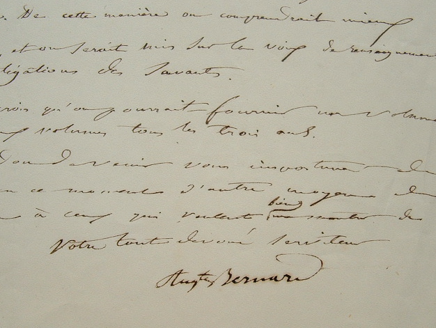 Auguste Bernard (Montbrison, 1811/1868)Auguste Bernard, qui vient de publier les Procès-verbaux des Etats généraux de 1593, dévoile son projet d'une vaste publication étendue à l'histoire des toutes les assemblées générales de l'ancien régime. Il explique son projet de "collection générale" pour que son correspondant puisse en entretenir les comités historiques. «Cette collection comprendrait toutes les assemblées d'état qui se sont tenues en France depuis 1302. J'y joindrais les assemblées des notables et autres grandes réunions publiques où il a été traité des intérêts nationaux, à l'exception des assemblées particulières du clergé ou de la noblesse. Ainsi composée, ma collection pourrait s'élever à 10 volumes, outre les deux déjà publiés, l'un sur les états de 1593, et l'autre sur ceux de 1483. Quant au mode de publication, je crois qu'il conviendrait de procéder du connu à l'inconnu, c'est à dire qu'il faudrait s'occuper d'abord des assemblées les plus rapprochées de nous, et remonter successivement jusqu'au commencement du XIVe siècle. De cette manière, on comprendrait mieux certaines circonstances insolites, et on serait mis sur la voix de renseignements échappés jusqu'ici aux investigations des savants. En procédant ainsi, je crois qu'on pourrait fournir un volume par an, ou au moins deux volumes tous les trois ans [...]».
