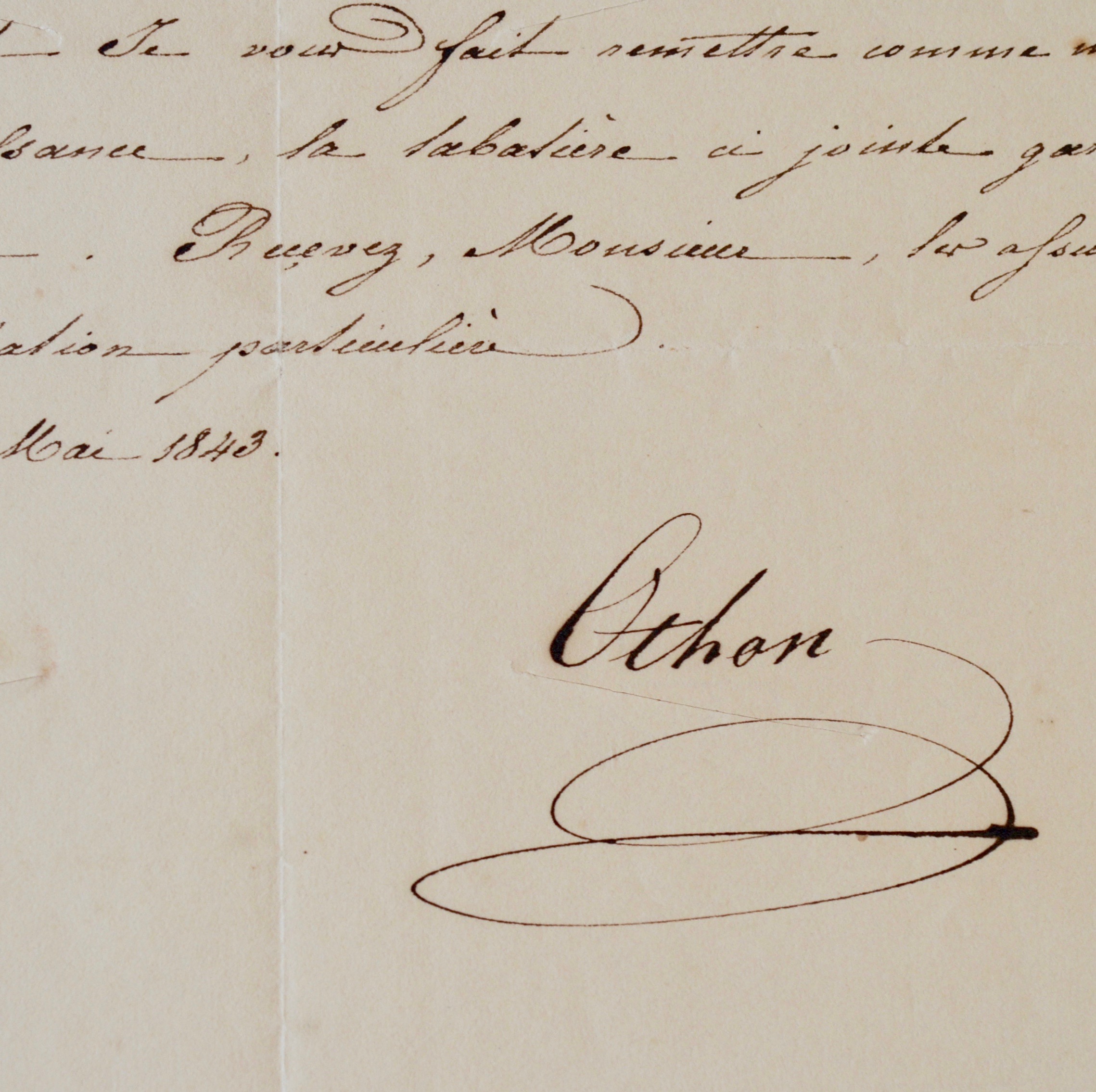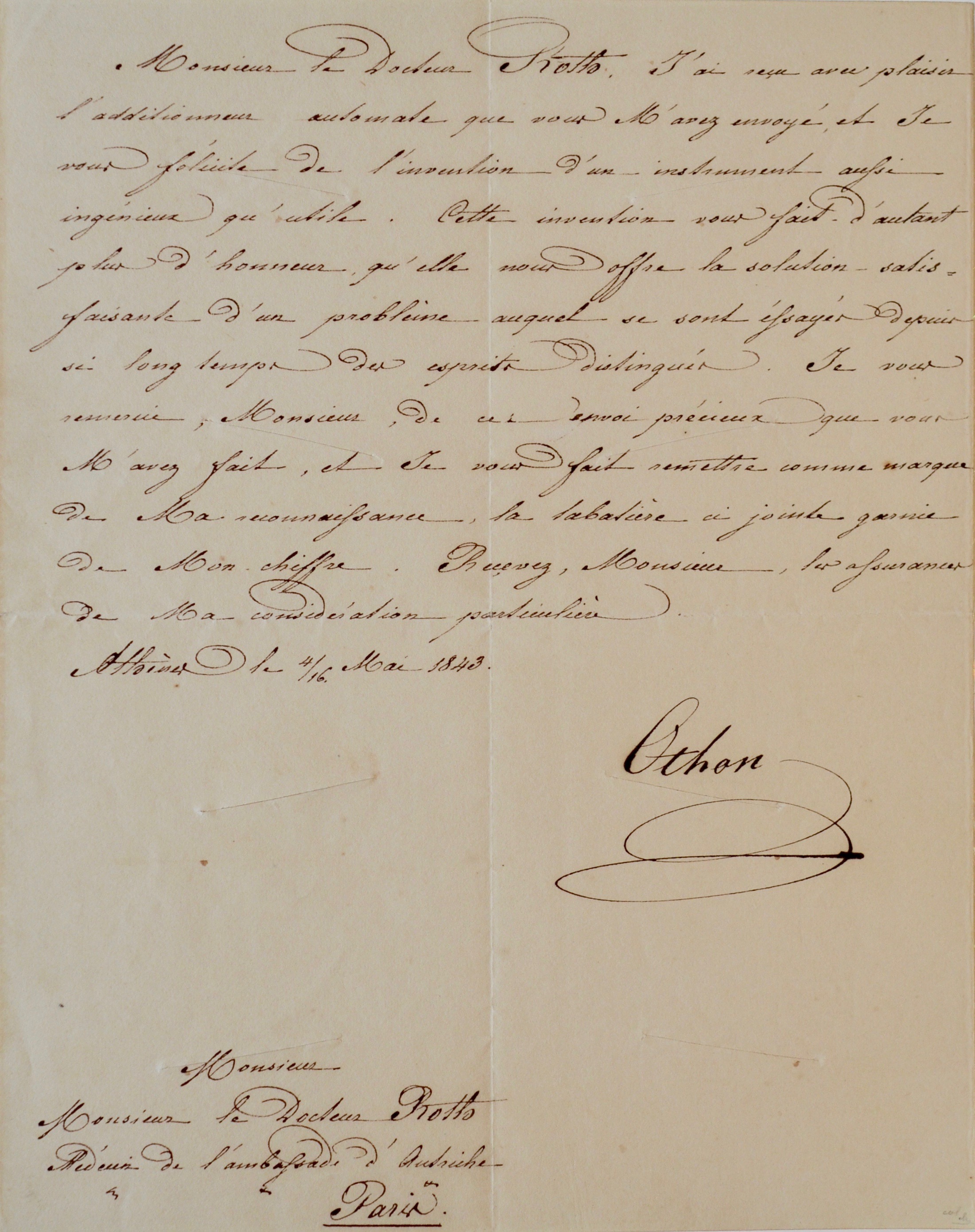 Par cette lettre, le roi Othon 1er, remercie le docteur Roth de son "additionneur automate", qui fut la première machine à calculer du XIXe [voir l'article de Guy Thuillier consacré à cette invention, dans la Revue administrative (1997) : La première machine à calculer au XIXe siècle : l'additionneur-automate du Docteur Roth]. "Je vous félicite de l'invention d'un instrument aussi ingénieux qu'utile. Cette invention vous fait d'autant plus d'honneur qu'elle nous offre la solution satisfaisante d'un problème auquel se sont essayés depuis si longtempsdes esprits distingués." Il lui envoie en retour une tabatière à son chiffre. [David-Didier Roth (1800/1885) mit au point cette machine, perfectionnement de celle de Pascal, et première machine à calculer produite en petite série, et dépôsa plusieurs brevets entre 1840 et 1842]. Rare document.