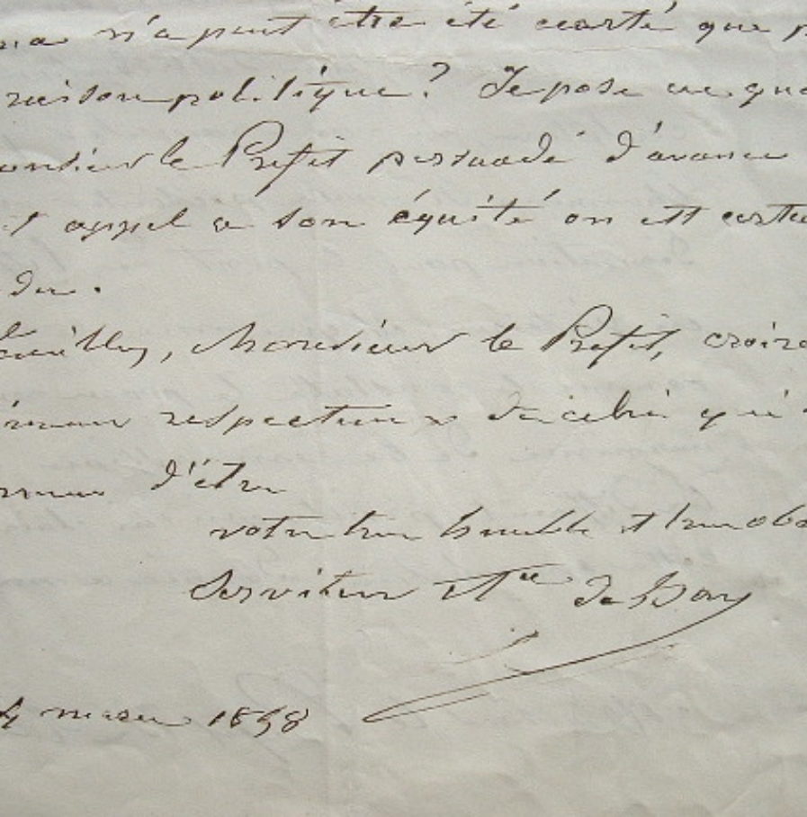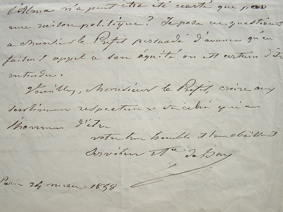 Auguste Debay (Nantes, 1804/1865)Auguste Debay sollicite une commande de la ville de Paris. «Permettez-moi, au moment où vous préparez une distribution de travaux de sculpture, de vous rappeler que j'ai eu l'honneur de vous présenter un projet de décoration pour le pont de l'Alma, consistant en Victoires ; et que mes compositions obtinrent, comme le constate le procès-verbal, l'assentiment unanime de la commission chargée d'examiner les différents projets qui lui étaient donnés ; cette approbation donnée à mes esquisses par l'élite des connaisseurs, est si honorable pour moi qu'elle devient forcément la meilleure des recommandations pour appuyer ma demande [...]». Il pense que si son projet a finalement été écarté, il ne l'a peut-être été que par des considérations politiques ; aussi demande-t-il une commande de la ville comme juste réparation.