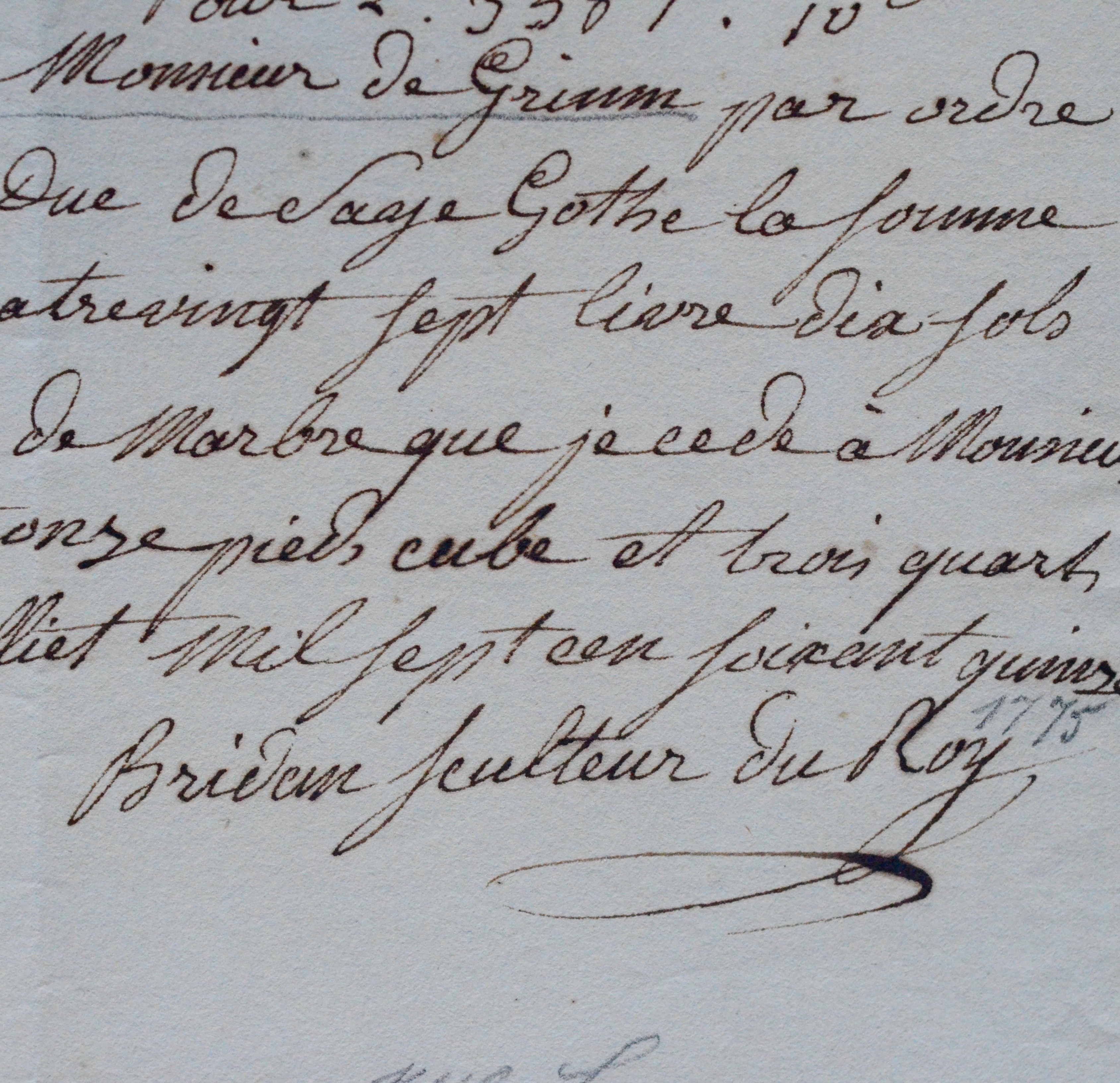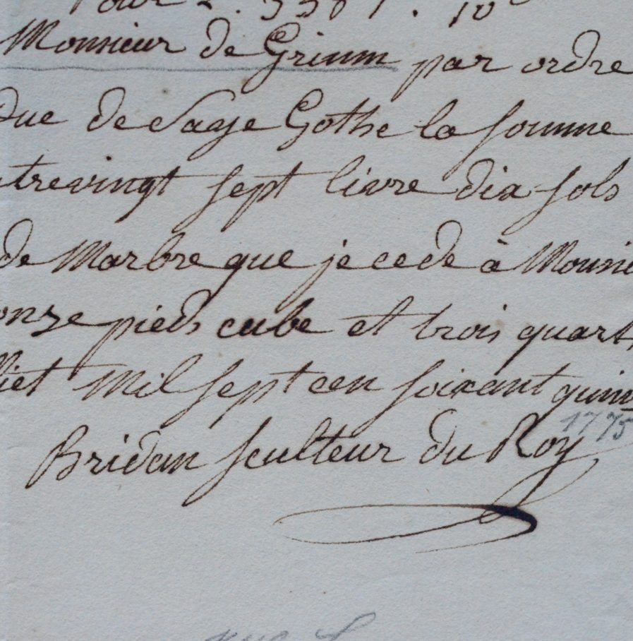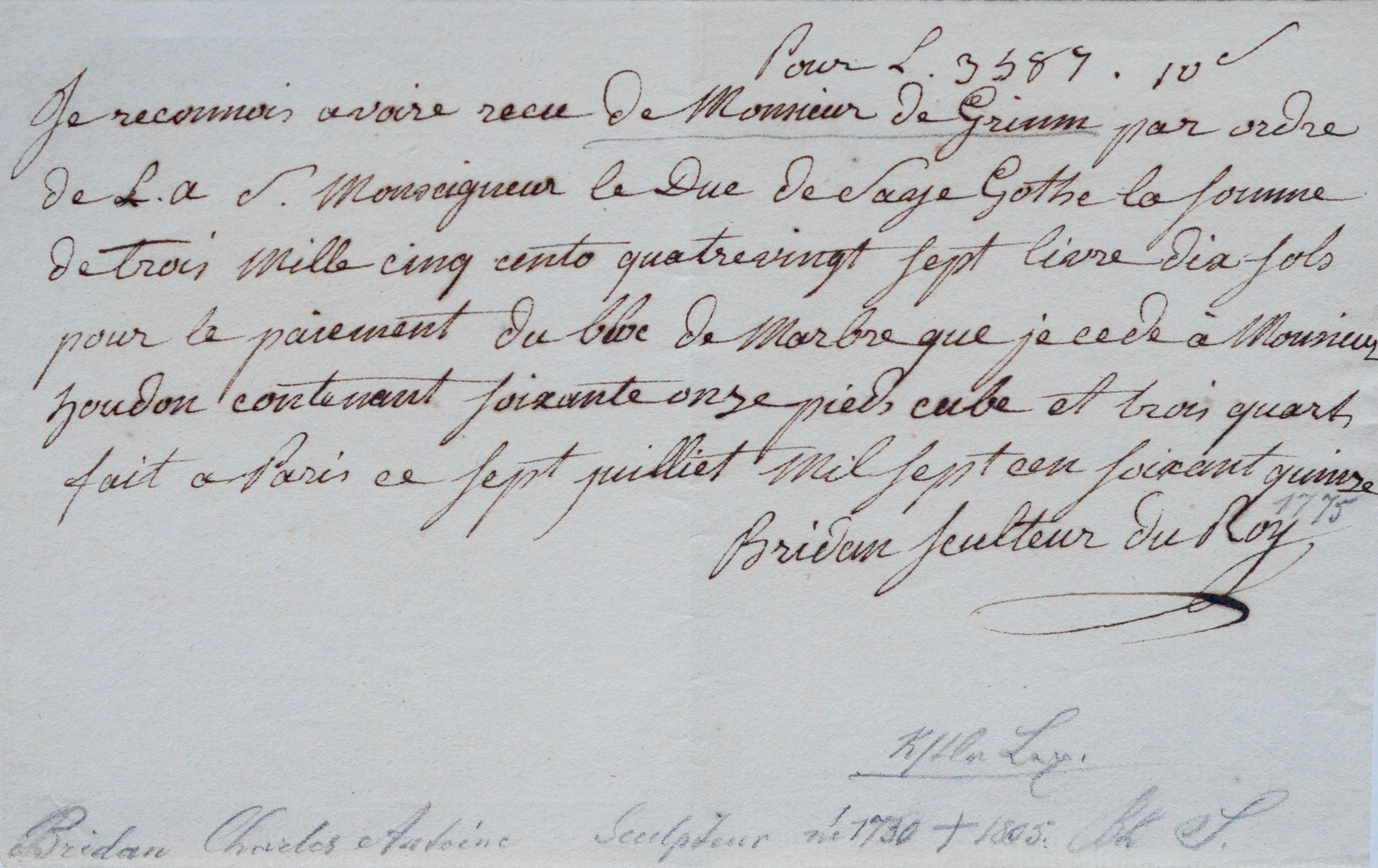 Rare reçu autographe signé de Charles-Antoine Bridan, sculpteur du Roi. "Je reconnois avoir reçu de monsieur [Friedrich Melchior] Grimm, par ordre de S.A.R. le duc de Sage Gothe [sic]" pour la somme de 3587 livres et 10 sols, en paiement "du bloc de marbre que je cède à Monsieur Houdon contenant soixante onze pieds cube et trois quarts [...]".