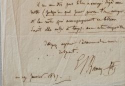 Etienne-Jules Ramey (Paris, 1796/1852)Dans une première lettre, le sculpteur Etienne-Jules Ramey s'informe pour le compte d'un ancien élève de la date de dépôt des oeuvres : « Un de mes amis ancien élève m'écrit de Bruxelles pour être informé de l'époque [...] la plus reculée pour la réception des tableaux au Musée. Dans mes souvenirs je crois que c'est jusque vers le 15 ou 16 février. » [Il s'agit du Salon officiel qui se tient à partir du 1er mars, au Louvre.] Dans la seconde lettre adressée à "monsieur et ancien ami", il explique qu'il n'a pu offrir son soutien à un jeune artiste, Prévost, lors du concours d'admission, probablement à l'École nationale supérieure des Beaux-Arts : « J'ai recherché et trouvé le dessin que j'avais vu et examiné avec soin lors de son exécution. Bien qu'il ait balancé avec d'autres, il n'a pu être admis. J'aurais voulu prenant la plume pour vous écrire, avoir à vous donner une solution différente. Mais je sais que vous ne douterez pas de mon zèle. Il faut que M. Prévost en étudiant la nature consulte souvent les grands maîtres, ceux qui surtout sont des dessinateurs élégants. Son travail était lourd et s'éloignait de la nature. »