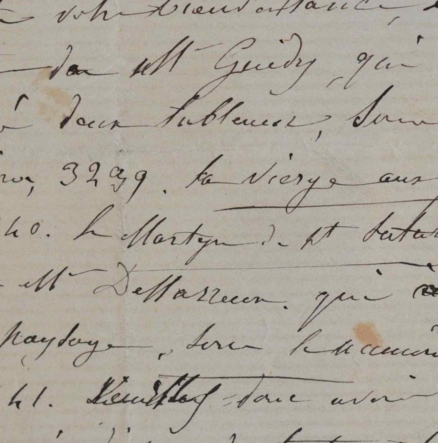 Par cette lettre à un confrère, probablement membre du Jury du Salon, le sculpteur François Jouffroy recommande M. Guédy, «qui a envoyé deux tableaux», une Vierge et le Martyre de St. Saturnin. Il recommande aussi un paysage de Dessarieu [ ?].