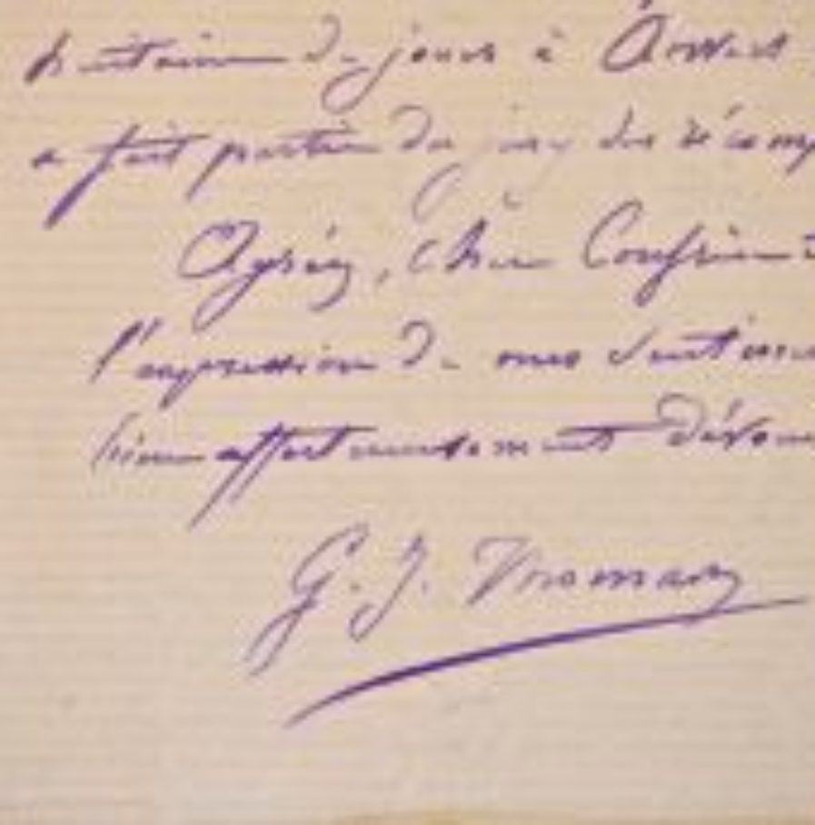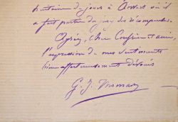 Gabriel Jules Thomas (Paris, 1823/1896)Dans cette intéressante lettre, le sculpteur Gabriel-Jules Thomas explique à son ami Charles Marionneau, peintre et historien de l'art, qu'il n'a pas parvenu à attribuer un portrait du Maréchal d'Ornano : « Je connais grand nombre de statues ainsi agenouillées sur des tombeaux qui offrent autant d'analogie avec celle [du cardinal René] de Birague que celle du Maréchal d'Ornano ; dans le grand manteau tombant des épaules, comme dans la manière dont il est jeté. Il me semble bien difficile dans ce cas de pouvoir déterminer si il vient de la même école. » Thomas indique également à son correspondant qu'il lui fera envoyer le discours du Monument de Barye dès qu'il sera publié. Il donne aussi des nouvelles de Gabriel Rispal, sculpteur, qui se prépare au Concours ainsi que de William Bouguereau, célère peintre académique : « Notre ami Bouguereau va toujours très bien il vient de passer une huitaine de jours à Anvers où il a fait partie du jury des récompenses. »