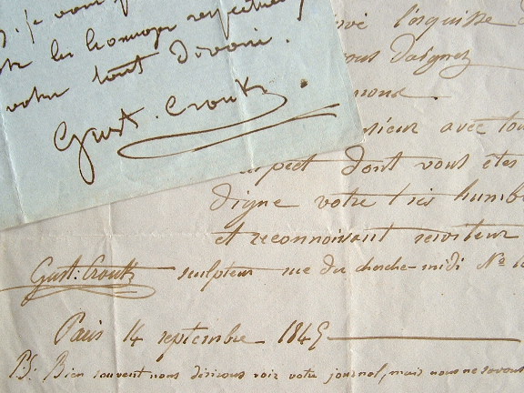 Gustave Crauk (Valenciennes, 1827/1905)Alors qu'il n'a que 18 ans, Gustave Crauk se fait l'interprête de son frère, le peintre Charles Alexandre Crauk (1819/1905), «qui vient d'envoyer son petit tableau de Wateau à Valenciennes [Watteau et Pater qui fut son premier envoi au Salon, en 1845]. Son intention est de l'exposer chez mons. Robert doreur rue St Géry, afin de chercher à le vendre pour pourvoir aux frais qu'il vient de faire pour son concours de Rome». Il demande à ce que Dinaux l'annonce dans son journal. «Mon frère a conservé une petite esquisse de ce tableau. Si vous daignez l'accepter, nous vous l'enverrons [...]». Dans une seconde lettre, il invite Dinaux à venir visiter son atelier, à Paris, rue de Vaugirard, «afin que j'aie le plaisir de vous montrer mes travaux».