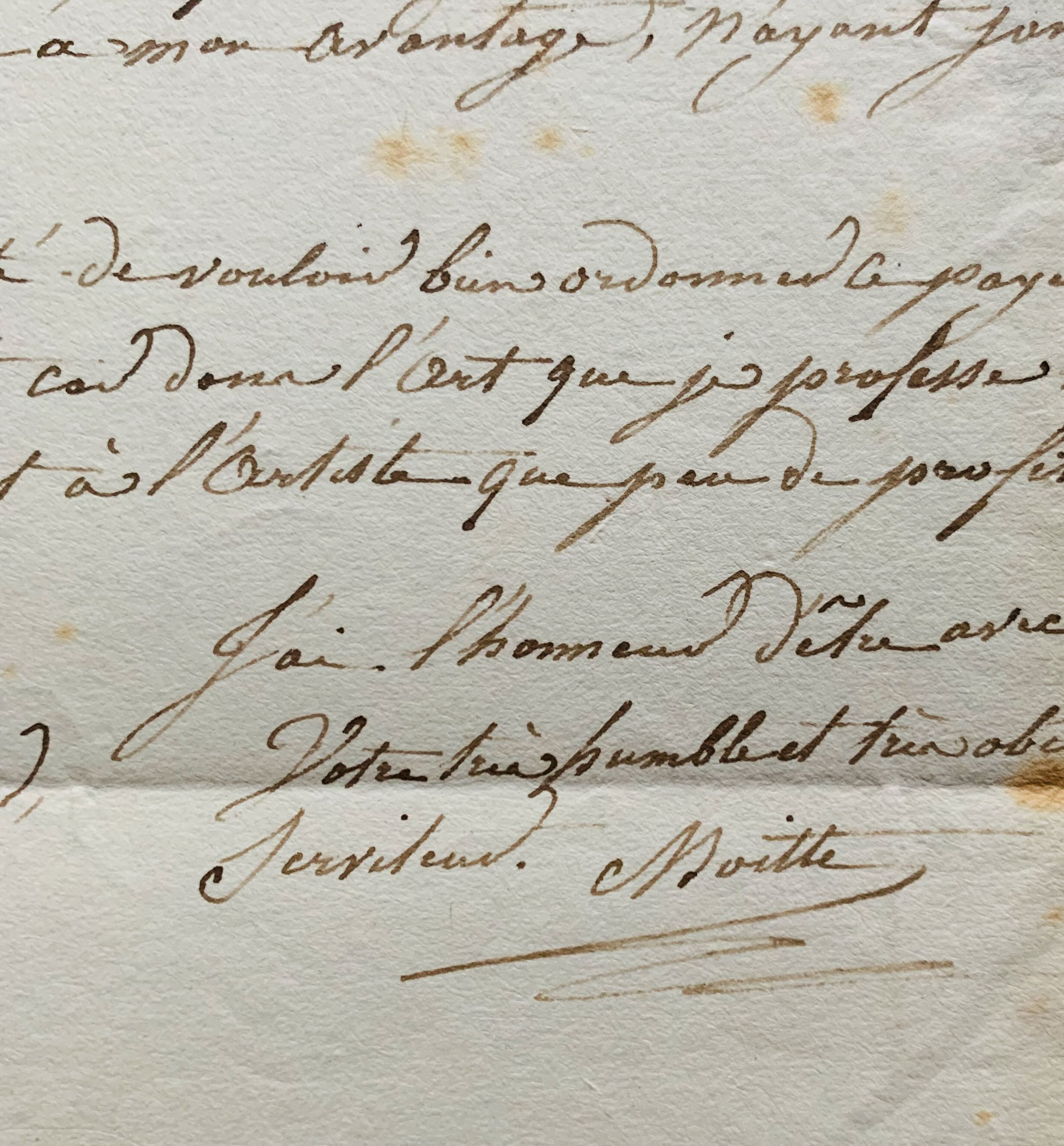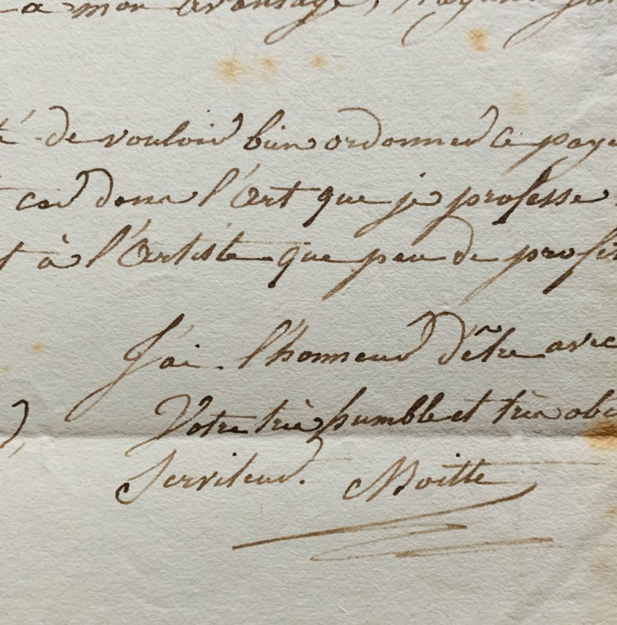 Lettre de Jean-Guillaume Moitte relative au paiement de son buste de Léonard de Vinci pour le Musée Napoléon (aujourd'hui au château de Fontainebleau).
