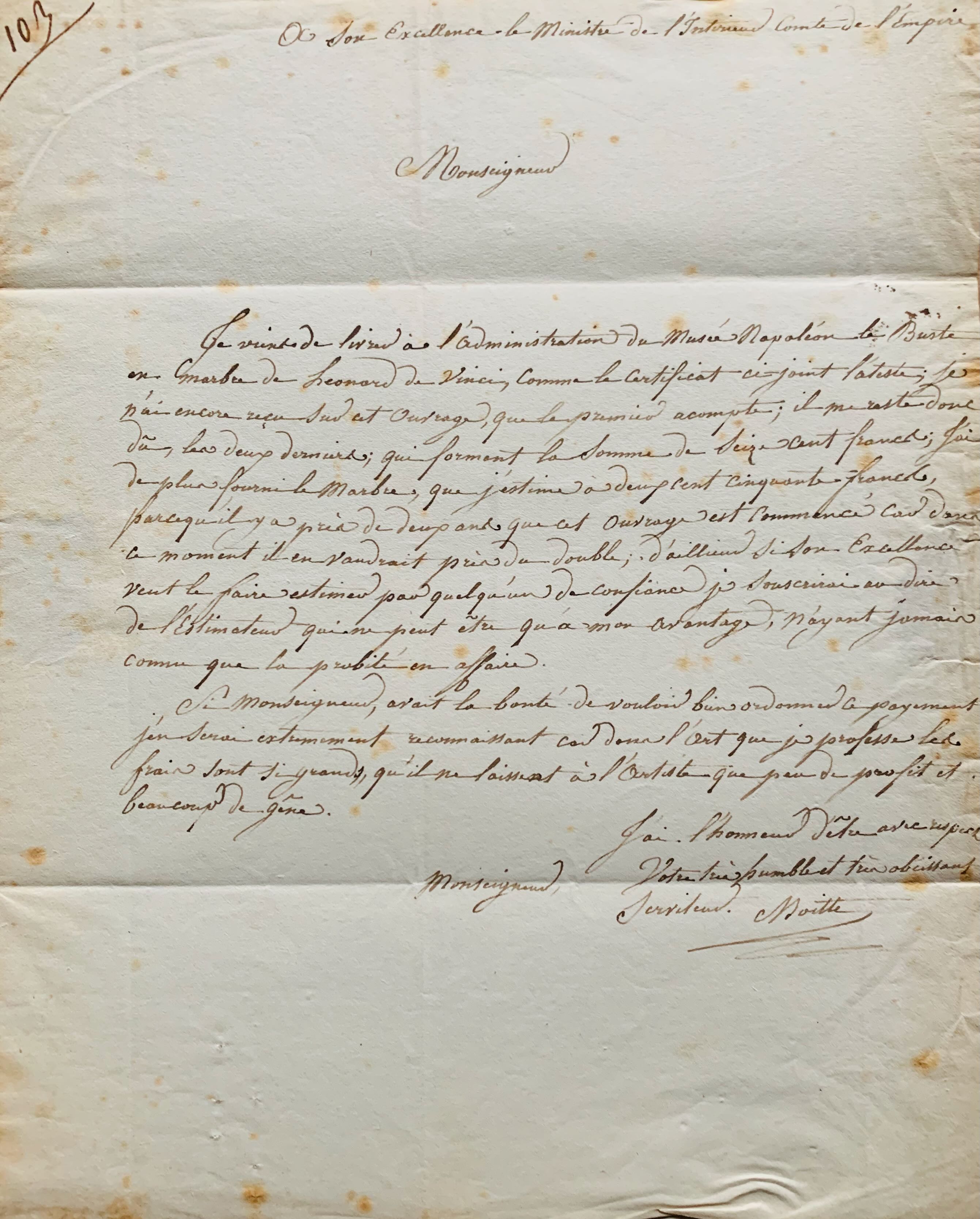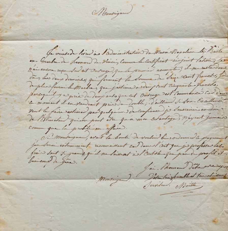 « Je viens de livrer à l’administration du Musée Napoléon, le buste en marbre de Léonard de Vinci […] ; je n’ai encore reçu sur cet ouvrage, que le premier acompte ; il me reste donc dû, les deux derniers, qui forment la somme de seize cents francs. J’ai de plus fourni le marbre, que j’estime à deux cent cinquante francs, car il y a près de deux ans que cet ouvrage est commencé car dans ce moment il en vaudrait près du double […] ».
