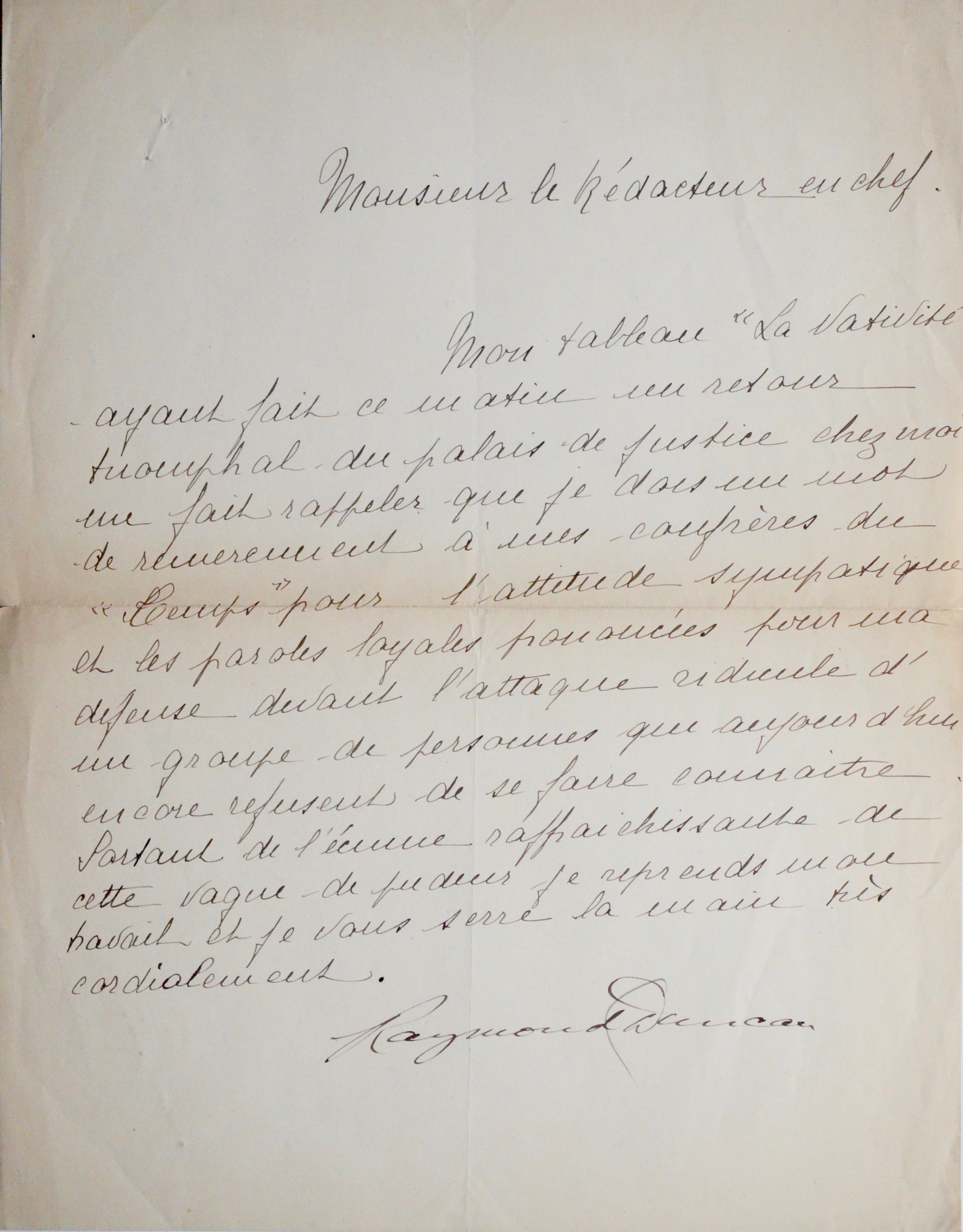 "Mon tableau "La Nativité" ayant fait ce matin un retour triomphal du Palais de Justice chez moi me fait rappeler que je dois un mot de remerciement à mes confrères du "Temps" pour l'attitude sympathique et les paroles loyales prononcées pour ma défense devant l'attaque ridicule d'un groupe de personnes qui aujourd'hui encore refusent de se faire connaître. Sortant de l'écume rafraîchissante de cette vague de pudeur je reprends mon travail et je vous serre la main [...]".