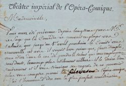 Lettre signée par le secrétaire du Théâtre Impérial de l'Opéra-Comique, Rézicourt [le tragédien François Geffroy-Lepoitevin, dit] informant Mlle Clémence, élève de l'Opéra-Comique, que la Comédie ne pourrait employer ses talents que jusqu'au 1er avril. "Le Comité vous renouvelle cet avis. Il voyait avec peine que, faute d'emploi, vous étiez dans le cas de perdre le talent que vous employerez, sans doute, beaucoup plus utilement ailleurs [...]".