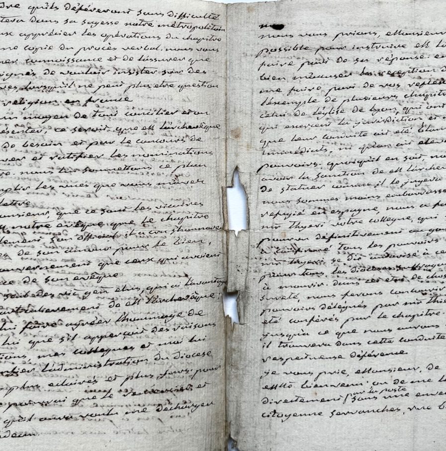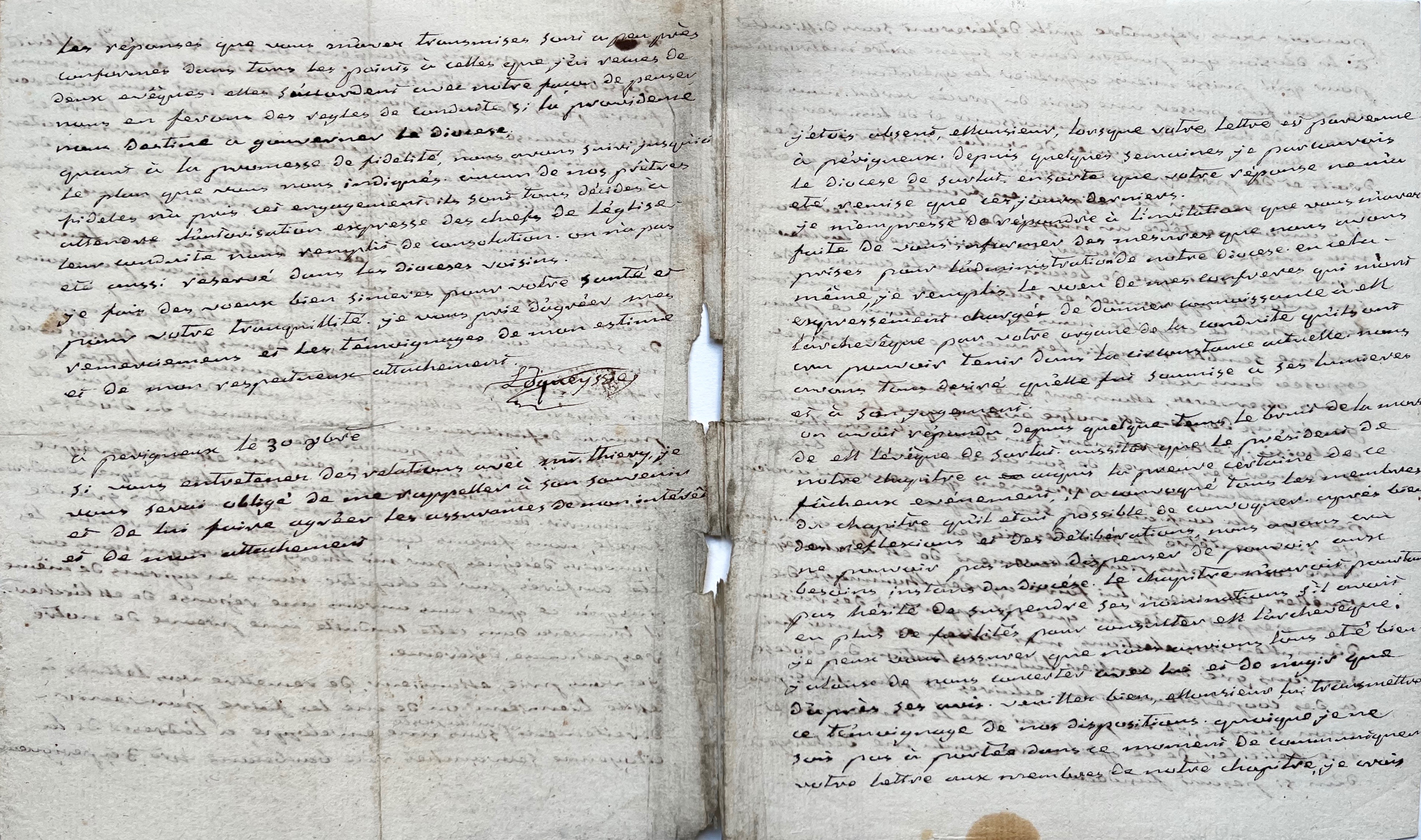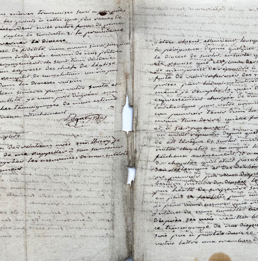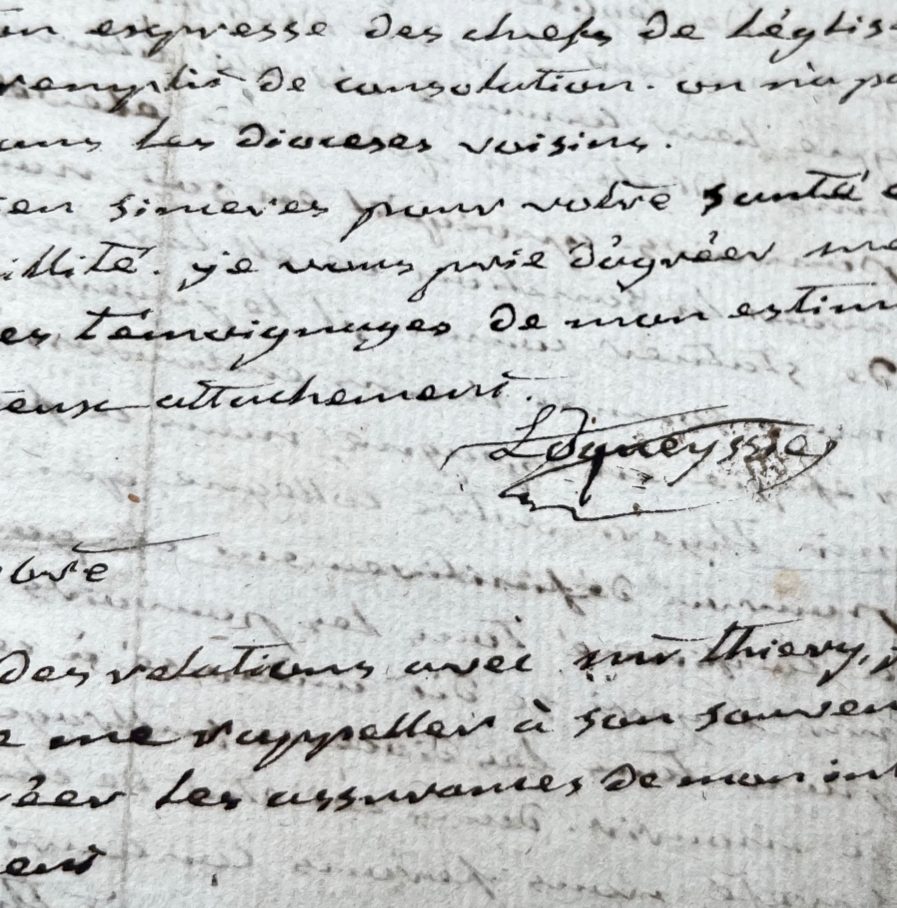 « Je m’empresse de répondre à l’invitation que vous m’avez faite de vous informer des mesures que nous avons prises pour l’administration de notre diocèse. En cela je remplis le vœu de mes confrères qui m’ont expressément chargé de donner connaissance à M. L’archevêque par votre organe de la conduite qu’ils ont cru pouvoir tenir dans la circonstance actuelle [...] ».