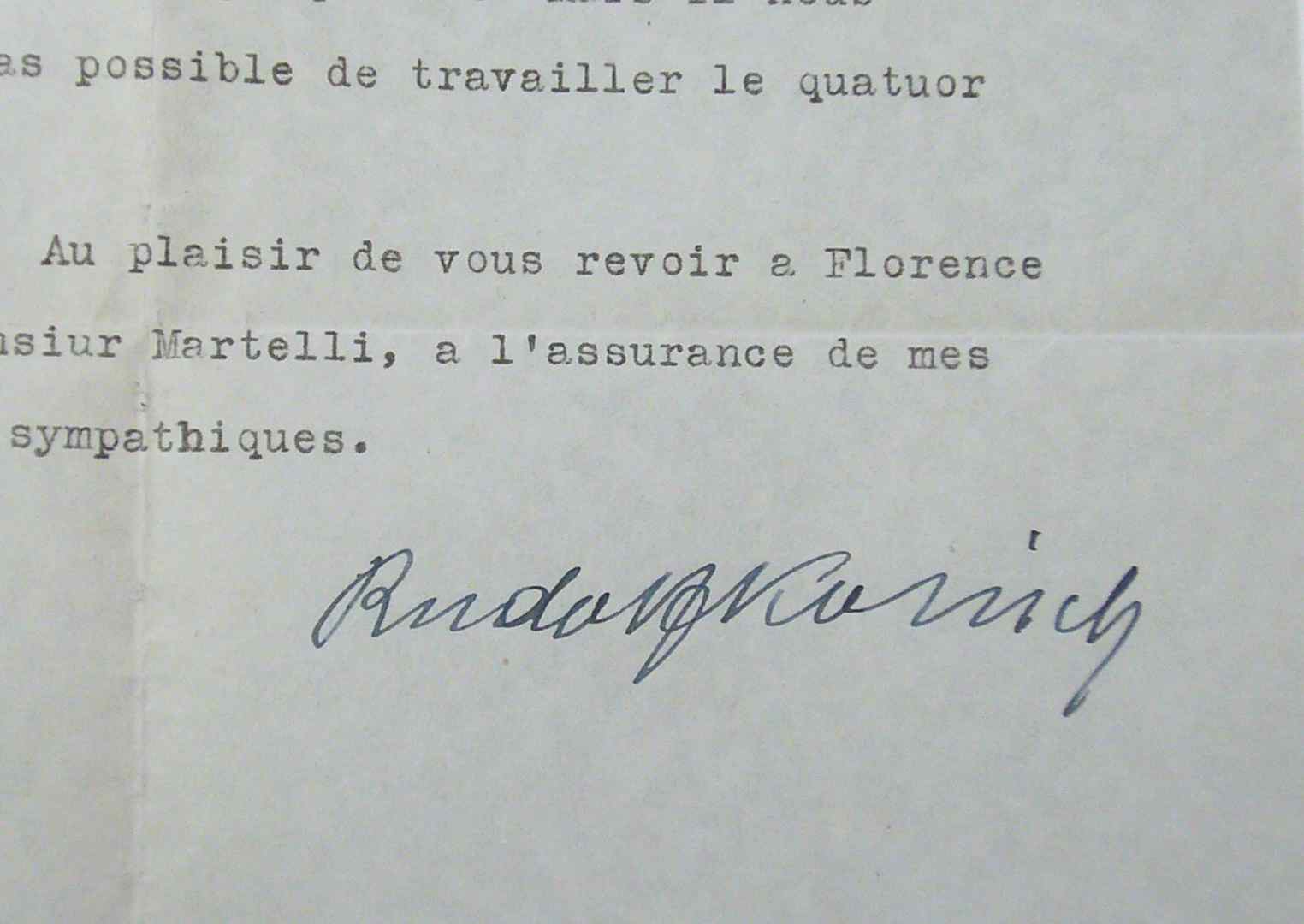 "Je vous accuse réception de la partition et du matériel de votre quatuor. Nous aurons largement le temps de le mettre au point à Florence, où nous arrivons dès le début du festival. Comme nous avons des concerts presque tous les jours jusqu'au 27 mars, il ne nous est d'ailleurs pas possible de travailler le quatuor avant Pâques [...]".