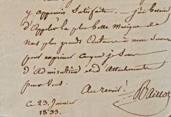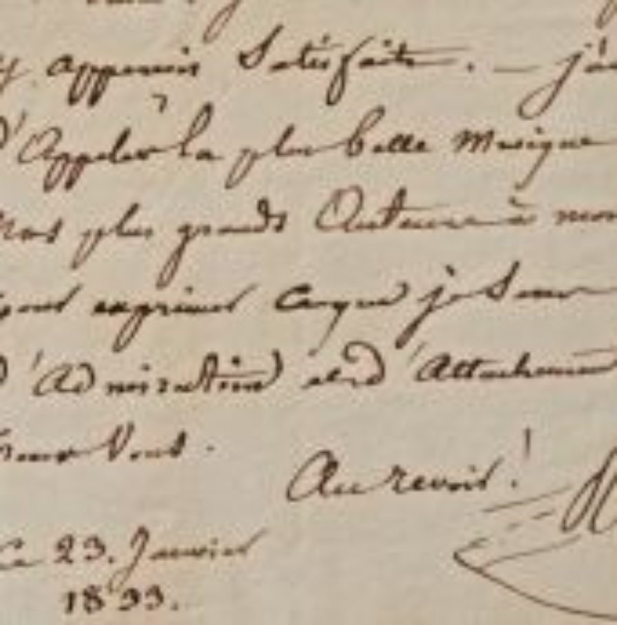 "Voici un billet pour ma soirée de mardi 29 janvier [1833] à la salle St Jean. Je serai heureux si je vous y aperçois satisfait. J'ai besoin d'appeler la plus belle musique de nos plus grands auteurs à mon secours pour exprimer ce que je sens d'admiration et d'attachement pour vous".
