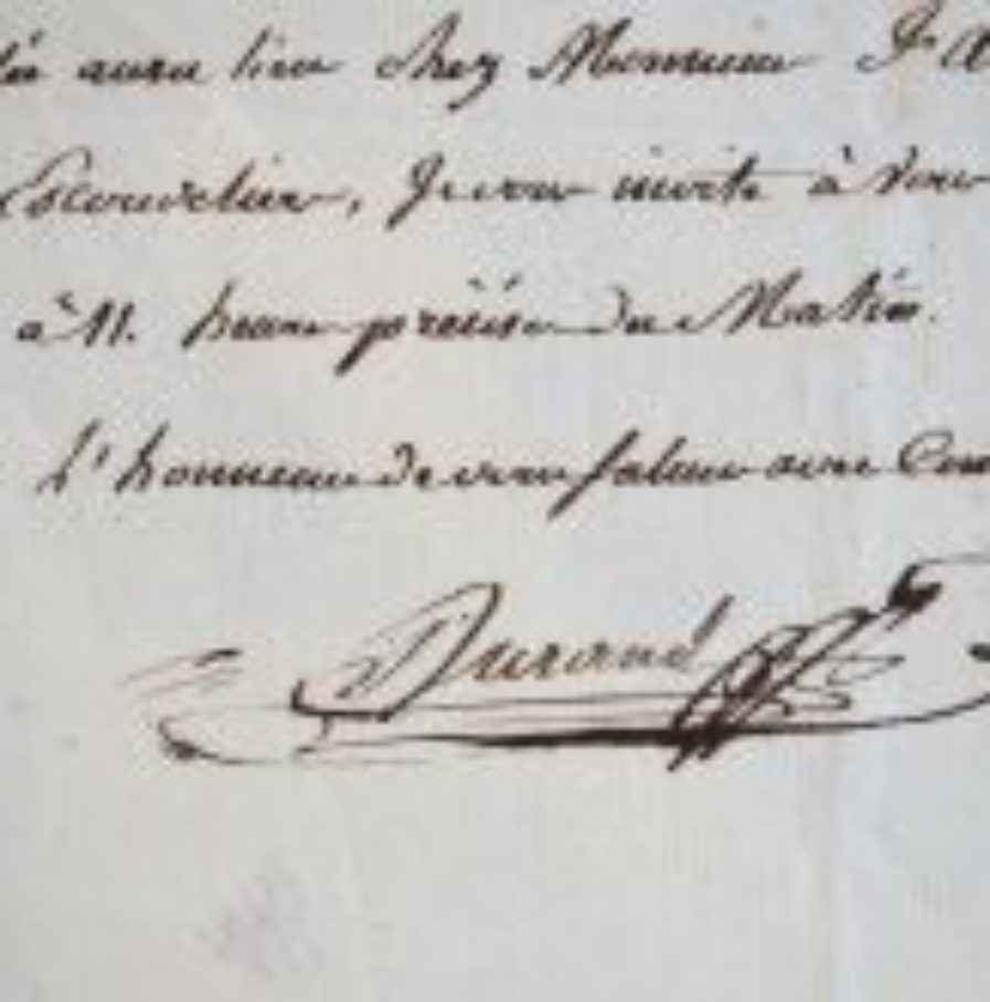 Rare lettre du voyageur Jean-Baptiste Léonard Durand, l'un des premiers à explorer en profondeur le Sénégal qui, à la fin de sa vie, s'était établi dans l'Espagne occupée. «Secrétaire rapporteur et garde des archives de la commission des sciences et arts», il informe son correspondant, qui est aussi secrétaire adjoint : «les travaux de la commission doivent commencer demain mercredi. L'assemblée aura lieu chez M. Fabre, président [...]».