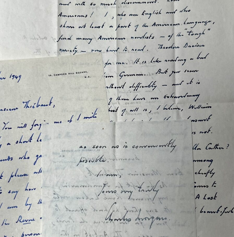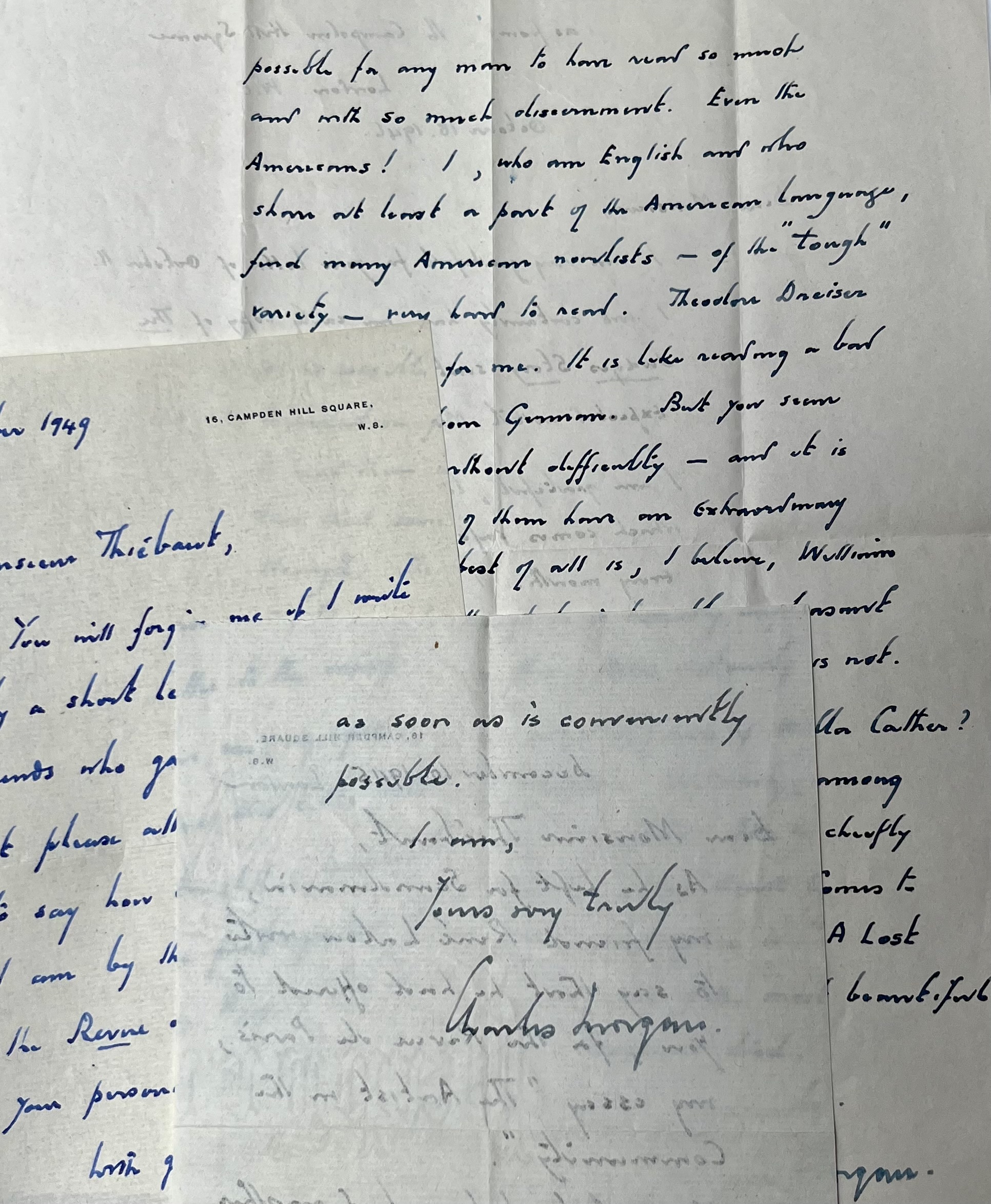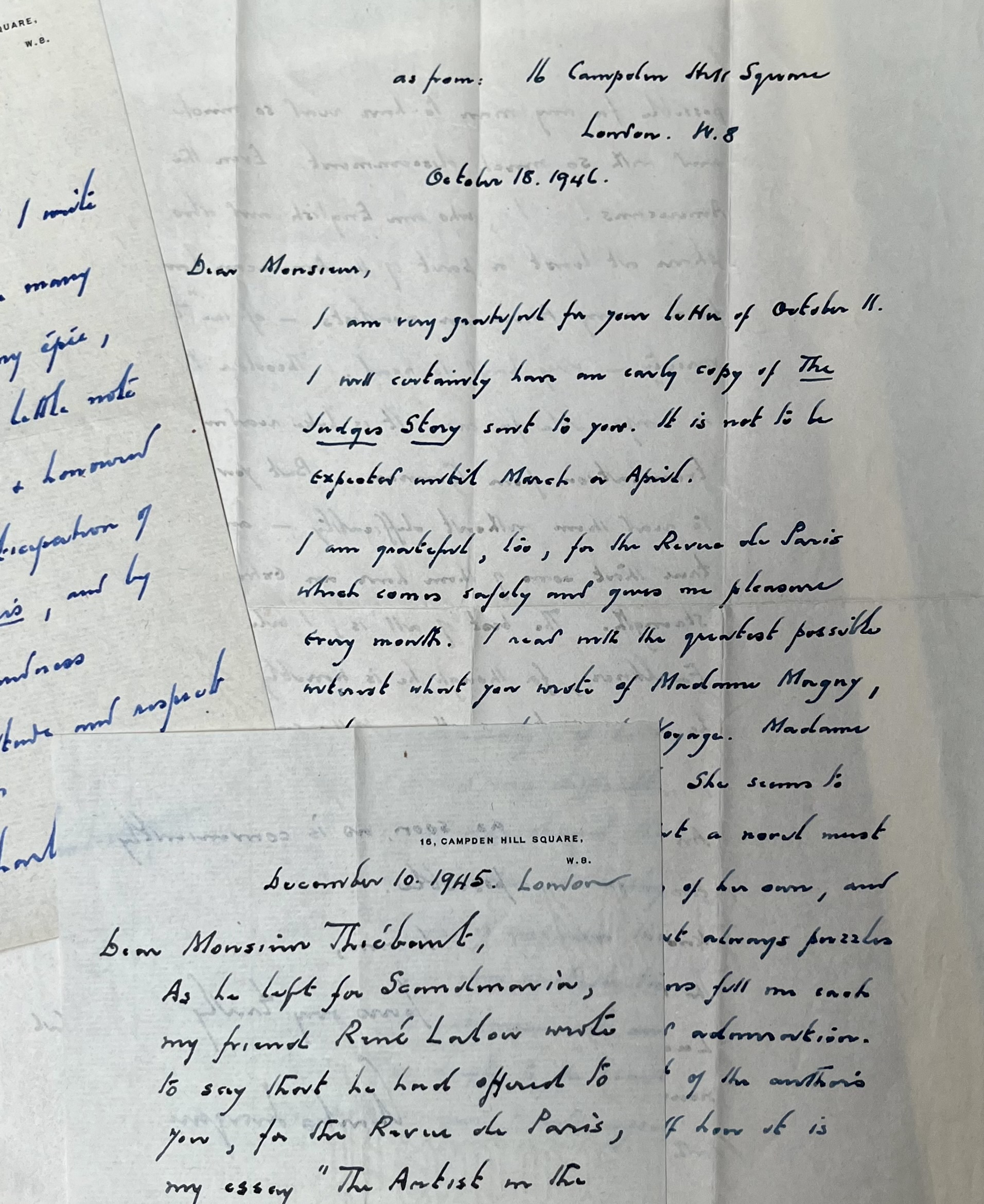 3 lettres de Charles Morgan à propos de publications dans la Revue de Paris. « As he left for Scandinavia, my friend René Lalou [son éditeur parisien] wrote to say that he had offered to you, for the Revue de Paris, my essay « The Artist in the Community ». Meanwhile I have had another offer for this essay and I am anxious to reply, though I would prefer that it should appear in the Revue de Paris [...]. I will certainly have an early copy of The Judge's Strory sent to you. It is not to be expected until march or april [...] ».