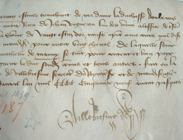 Mathelin de Manny, «escuier tranchant» de Mme la duchesse d'Orléans et de Milan, confesse avoir reçu de Jehan Vigneron, trésorier de monseigneur le duc [Charles d'Orléans], la somme de vingt écus d'or «pour avoir ung cheval». La pièce est signée par Guillaume de Villebresine, secrétaire. [L'écuyer tranchant avait la charge de couper les viandes à la table d'un prince ou d'un grand seigneur].
