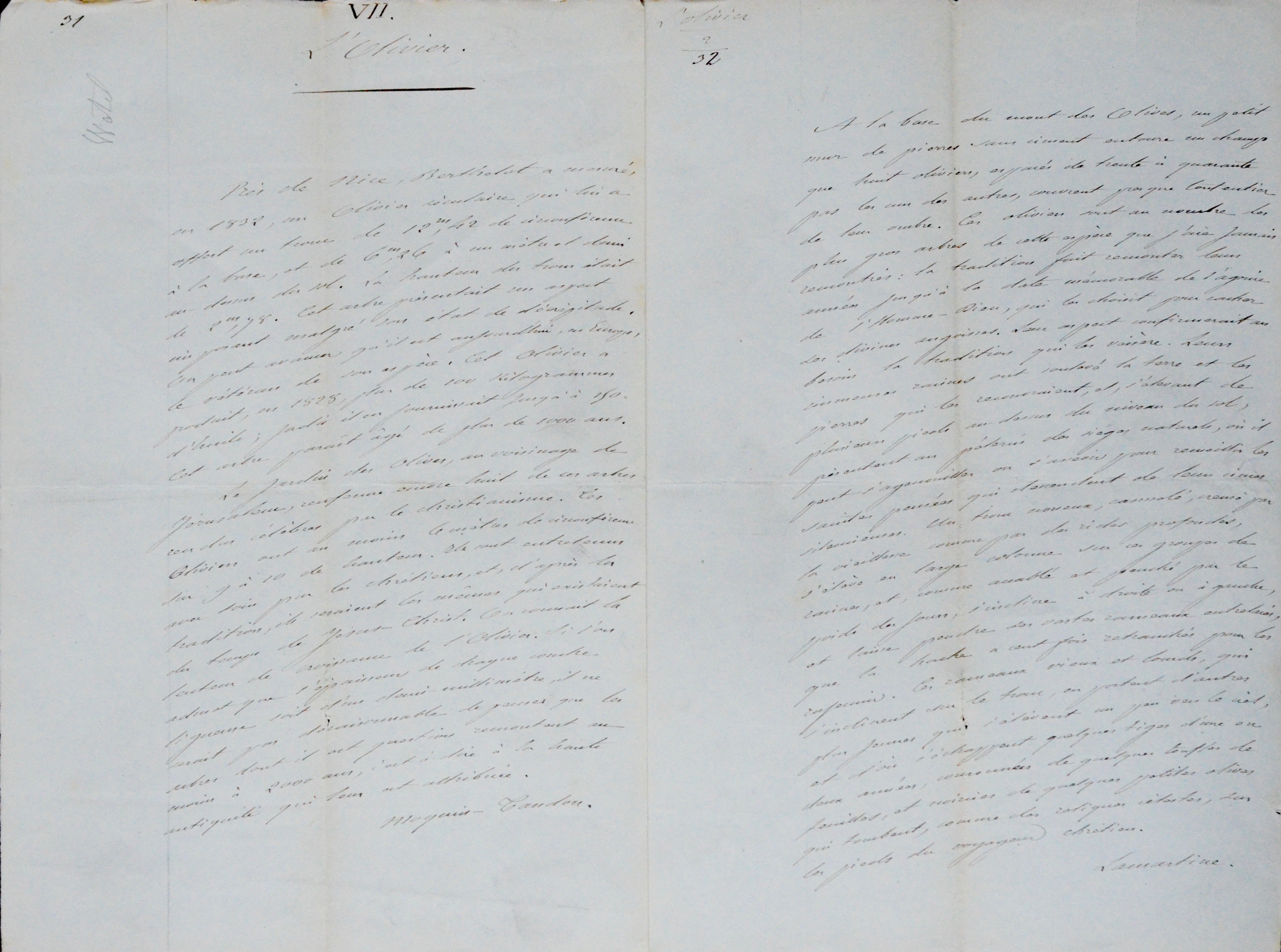 Manuscrit autographe de Jean-Henri Fabre, intitulé L'Olivier. S.l.n.d. [1872-1873], paginé de 31 à 32, constitué de deux parties consacrées à l'olivier.