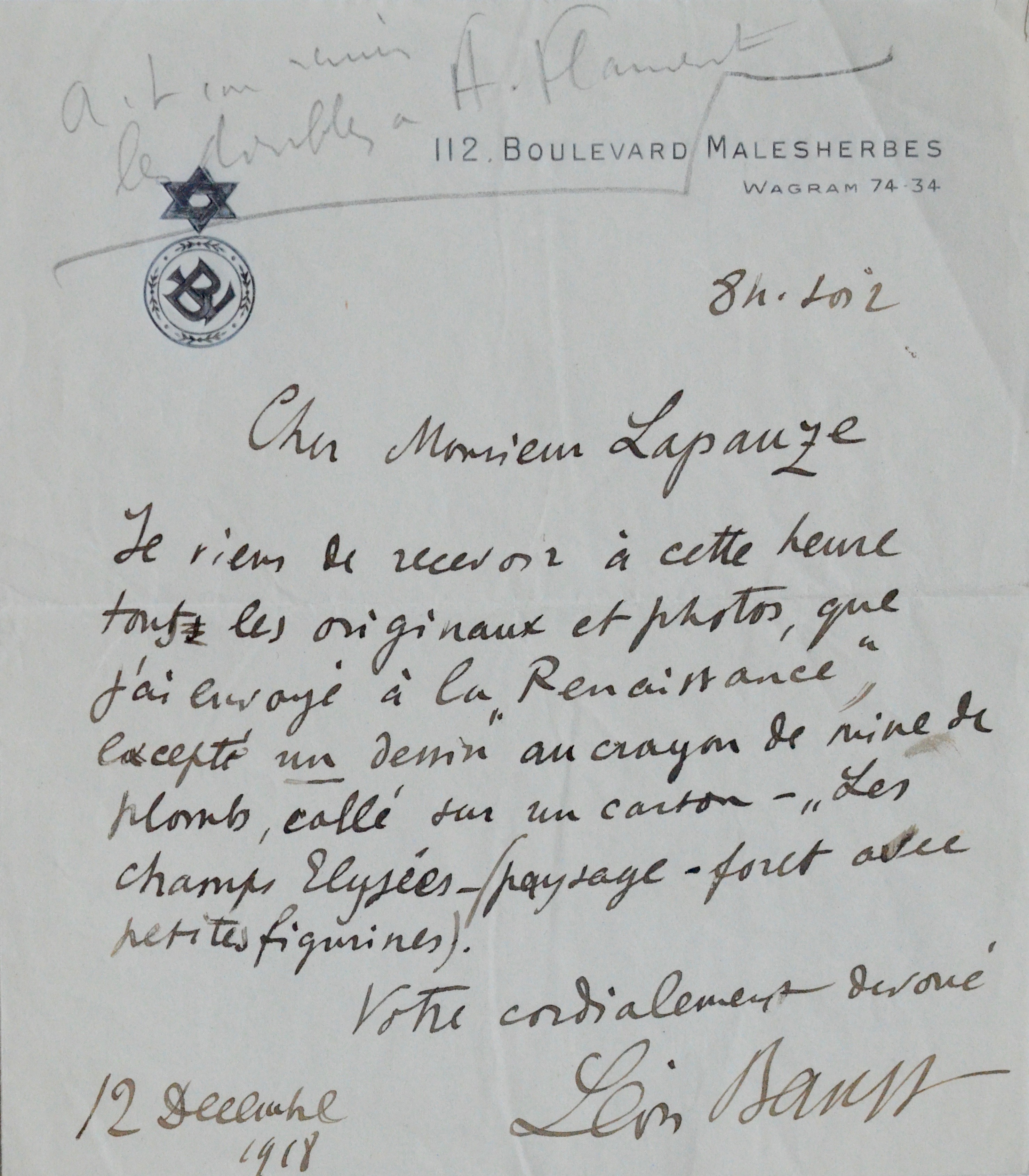 Bakst annonce avoir bien reçu "tous les originaux et photos que j'ai envoyé à la "Renaissance" excepté un dessin au crayon de mine de plomb collé sur carton - "Les Champs Elysées - (paysage - forêt avec petites figurines)".