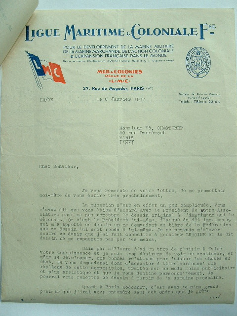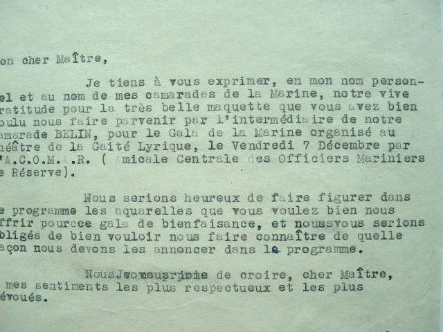 Lettres relatives à son travail de peintre et de dessinateur, pour la Marine. Il fournit une aquarelle, un dessin et trois estampes pour des illustrations, dont un recueil de Chansons de marins et le programme du gala de la Marine organisé le 7 décembre 1945 au Théâtre de la Gaité Lyrique.