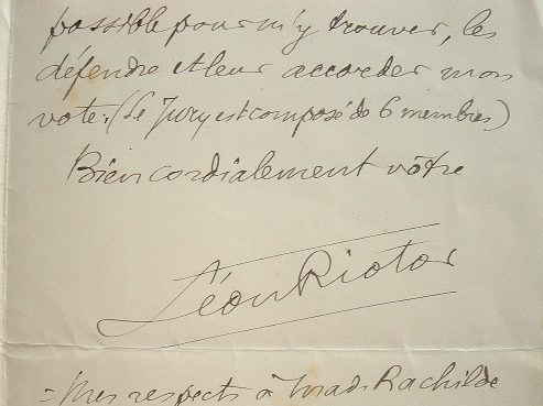 Alfred Vallette (Paris, 1858/1935)Léon Riotor se met à la disposition d'Alfred Vallette et de son ami Emile Despax [(Dax, 1881/1915), jeune poète mort au front en janvier 1915, qui a publié deux recueils de poèmes au Mercure de France]. «Ses poèmes ne sont pas malheureusement dans les trente et quelques que je suis chargé d'annoter, et dans les mains de qui sont ils ? Ce n'est guère facile à savoir, mais s'ils sont bien, et ils le sont, leur sort viendra probablement en discussion, et je ferai tout mon possible pour m'y trouver, les défendre et leur accorder mon vote». Il précise que le jury est cependant composé de 6 membres, et adresse ses salutations à Rachilde. Au dos, Vallette renvoit la lettre : «Cher monsieur, Voici la réponse de Riotor. A vous cordialement. A. Vallette».