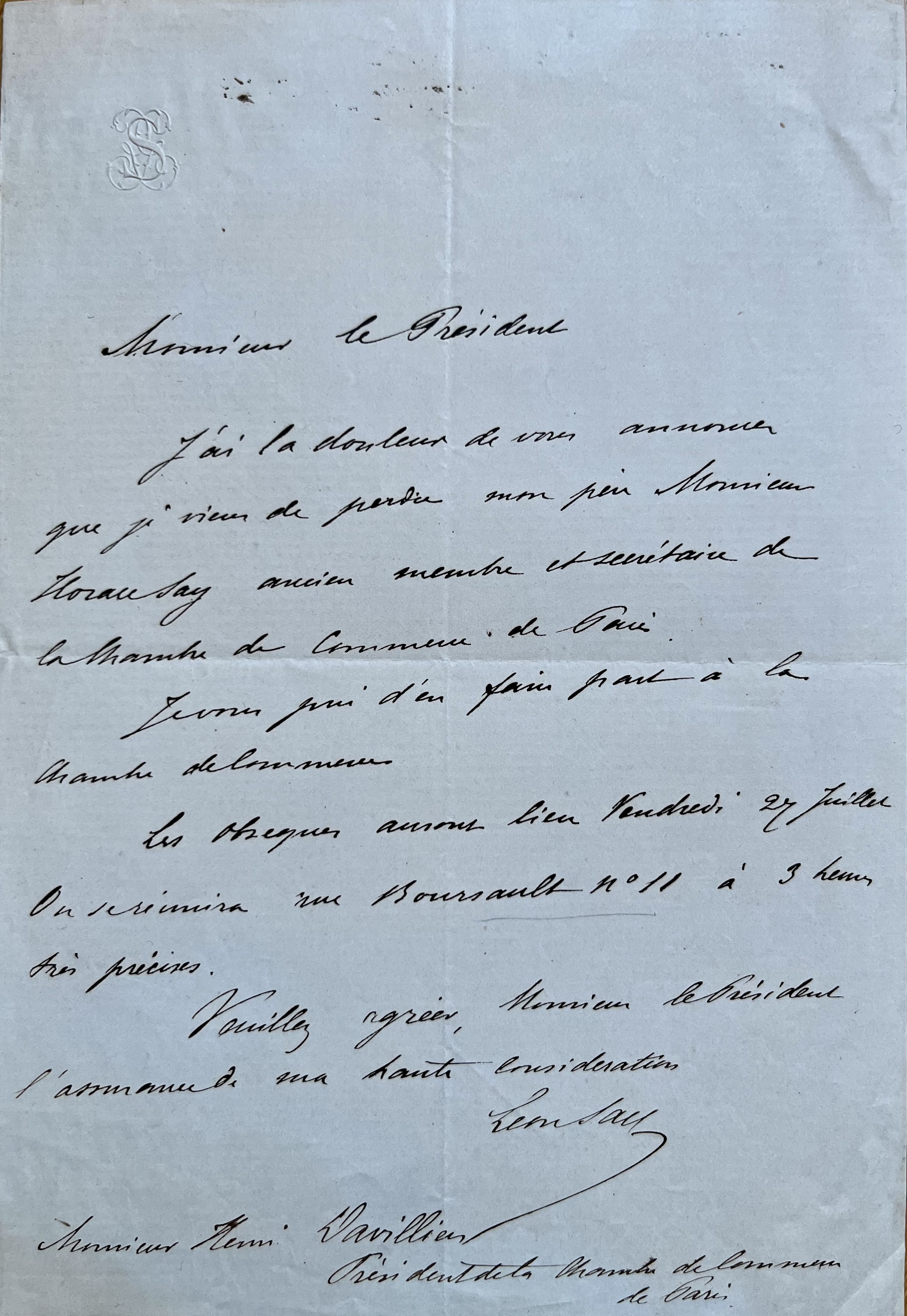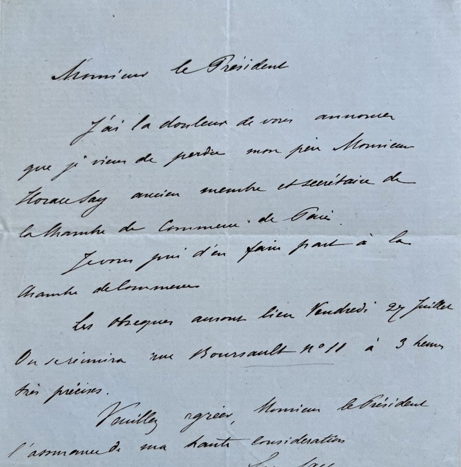 "J'ai la douleur de vous annoncer que je viens de perdre mon père Monsieur Horace Say ancien membre et secrétaire de la Chambre de Commerce de Paris. Je vous prie d'en faire part à la Chambre [...]".