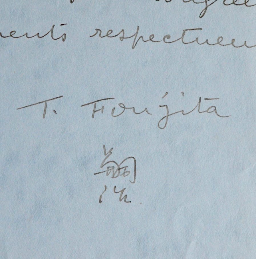 Léonard Foujita recommande une jeune femme, Mlle Bellamy "qui se destine à la Tragédie" et passe son examen le jeudi suivant, au Conservatoire. "Je sais combien votre influence est grande c’est pourquoi je me décide à cette démarche auprès de vous [...]"