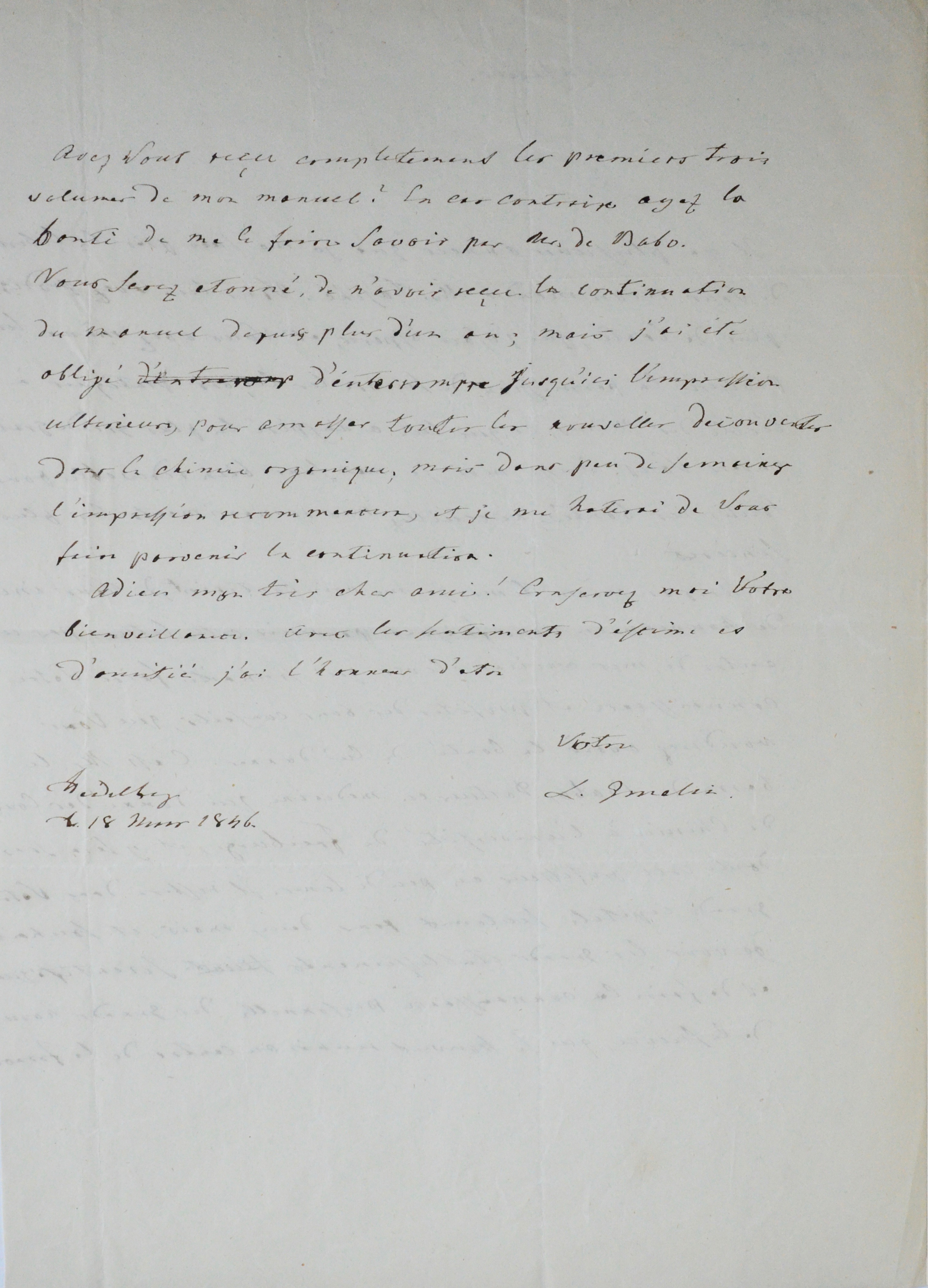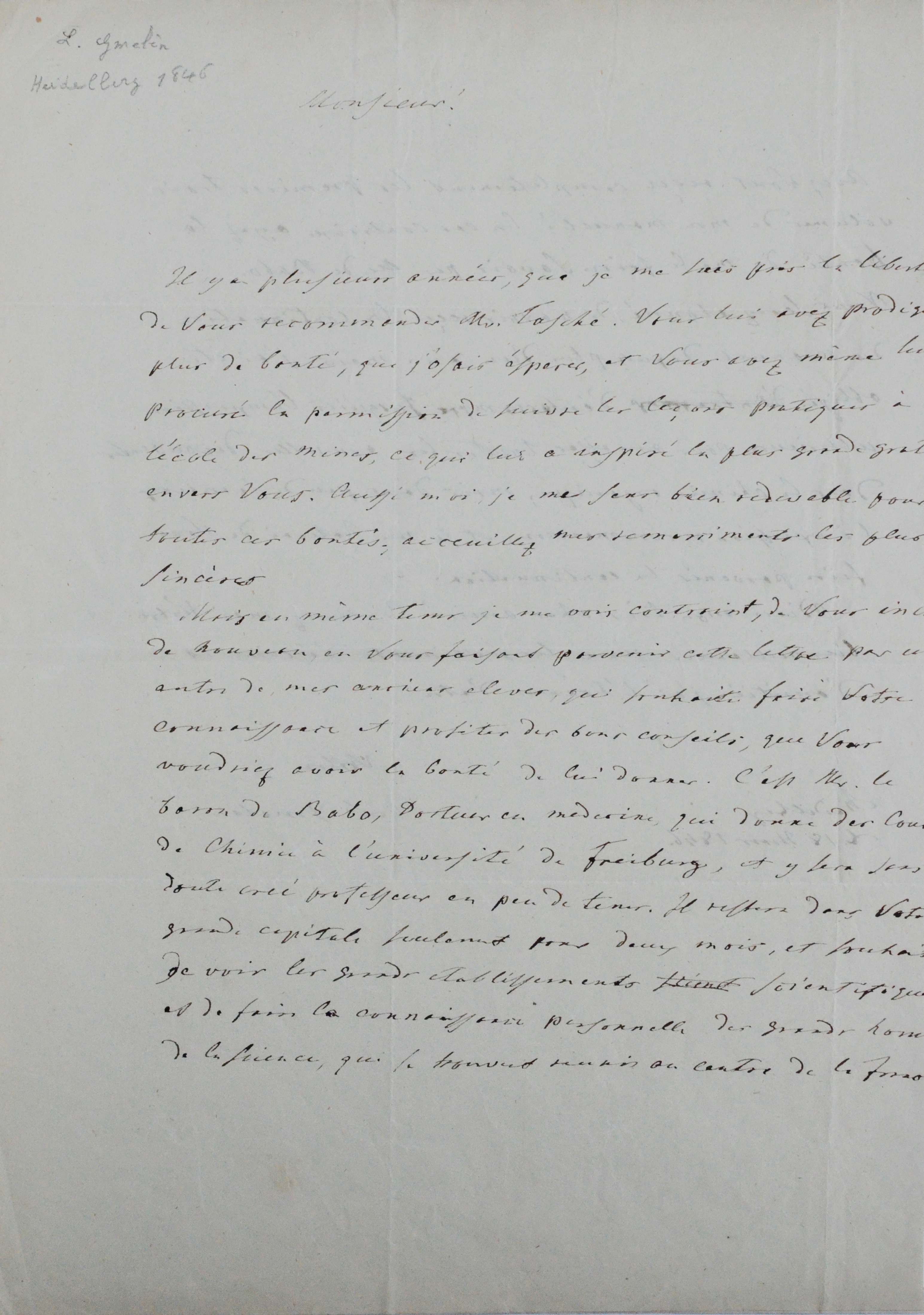 Leopold Gmelin (Göttingen, 1788/1853)Belle lettre de Leopold Gmelin à Pierre Berthier, alors professeur à l'École des Mines.