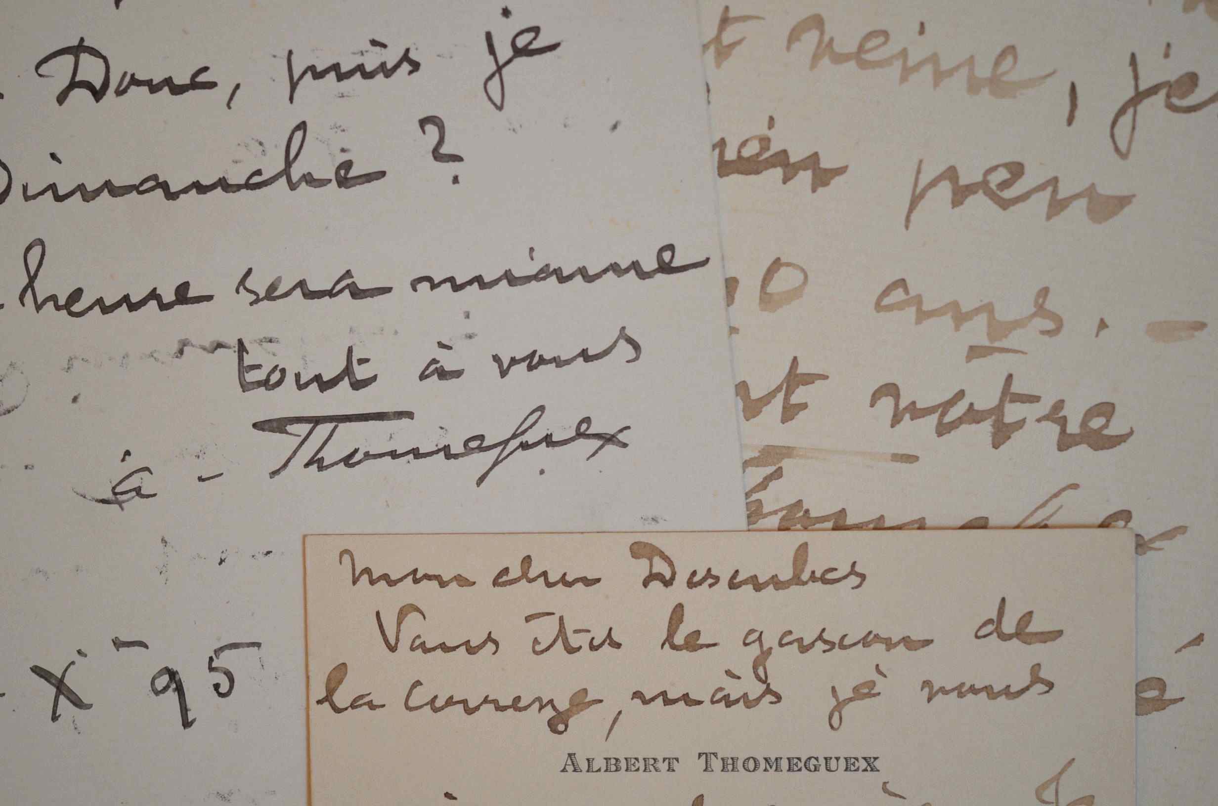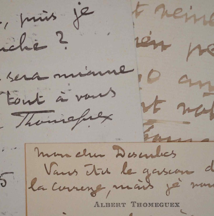 Petite correspondance de l'épéiste Albert Thomeguex (mort en 1918). «Vous êtes le Gascon de la Corrèze, mais je vous aime quand même. Je donne un dîner de pointes mercredi soir à 7h3/4 chez Lucas (Madeleine). Je ne suis pas allé vous voir attendant le signal promis [...]. Merci de coeur pour votre sollicitude dévouée. J'espère que mes voeux me porteront veine, j'en ai eu bien peu depuis 20 ans [...]».