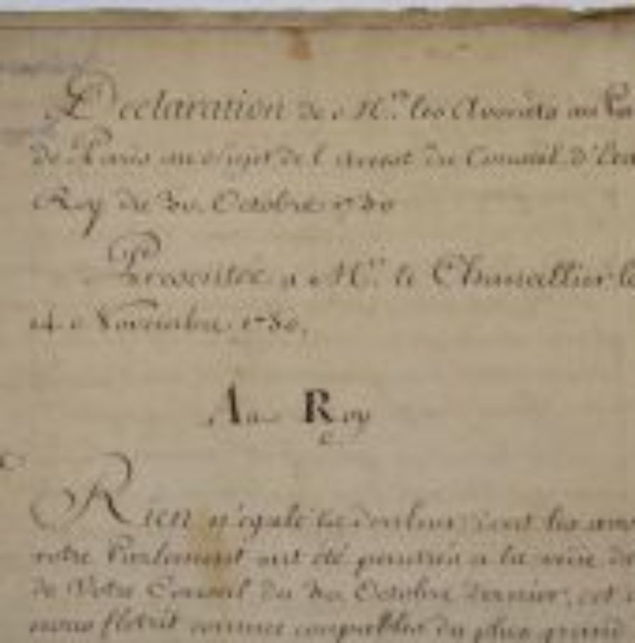Manuscrit intitulé "Déclaration de Mrs les avocats au Parlement de Paris au sujet de l'arrêt du Conseil d'Etat du Roy du 30 octobre 1730". [Les avocats protestent contre l'arrêt pris contre 40 des leurs qui avaient signé un mémoire pour le sieur Samson, curé d'Olivet, arrêt leur enjoignant de se rétracter sous un mois, le roi estimant que cette déclaration contenait des propositions contraires à son autorité et tendant à troubler la tranquillité publique]. Ce texte a été imprimé sous le titre "Requête de MM. les avocats [...]" et non "Déclaration", avec le nom des 230 signataires de la pétition. Notre manuscrit présente en outre une mention qui ne figure pas sur l'imprimé : "Présentée à Mr le Chancellier le mardy 14 novembre 1730". [Le 25 novembre suivant, le roi fit paraître un nouvel arrêt les regardant comme bons et fidèles sujets ; les avocats reprirent alors leurs fonctions].