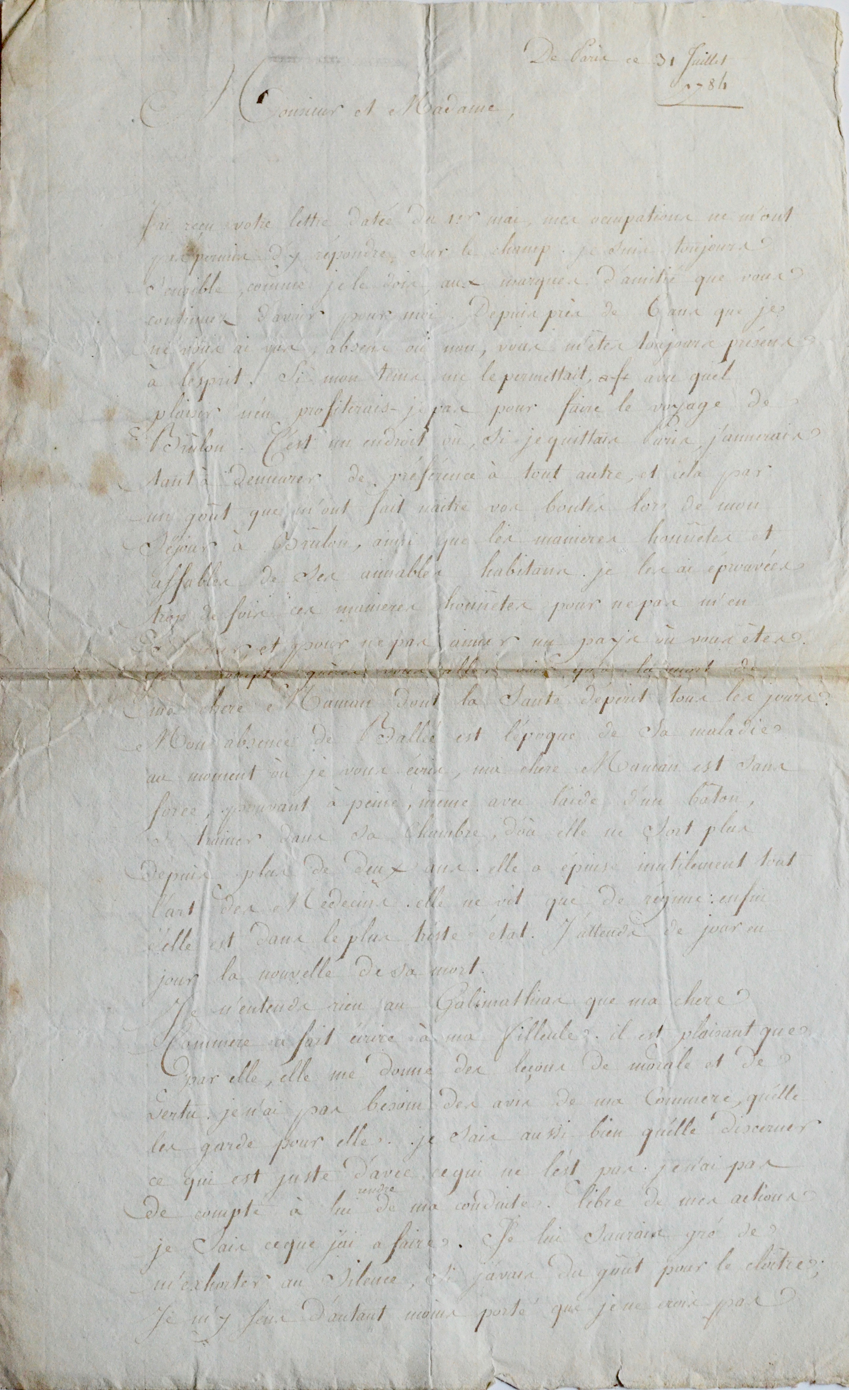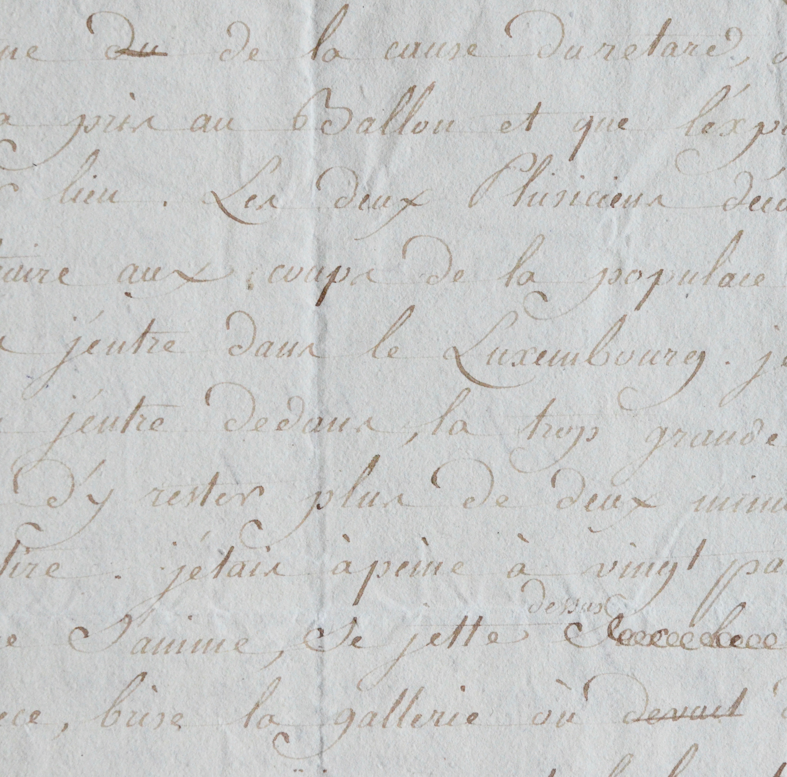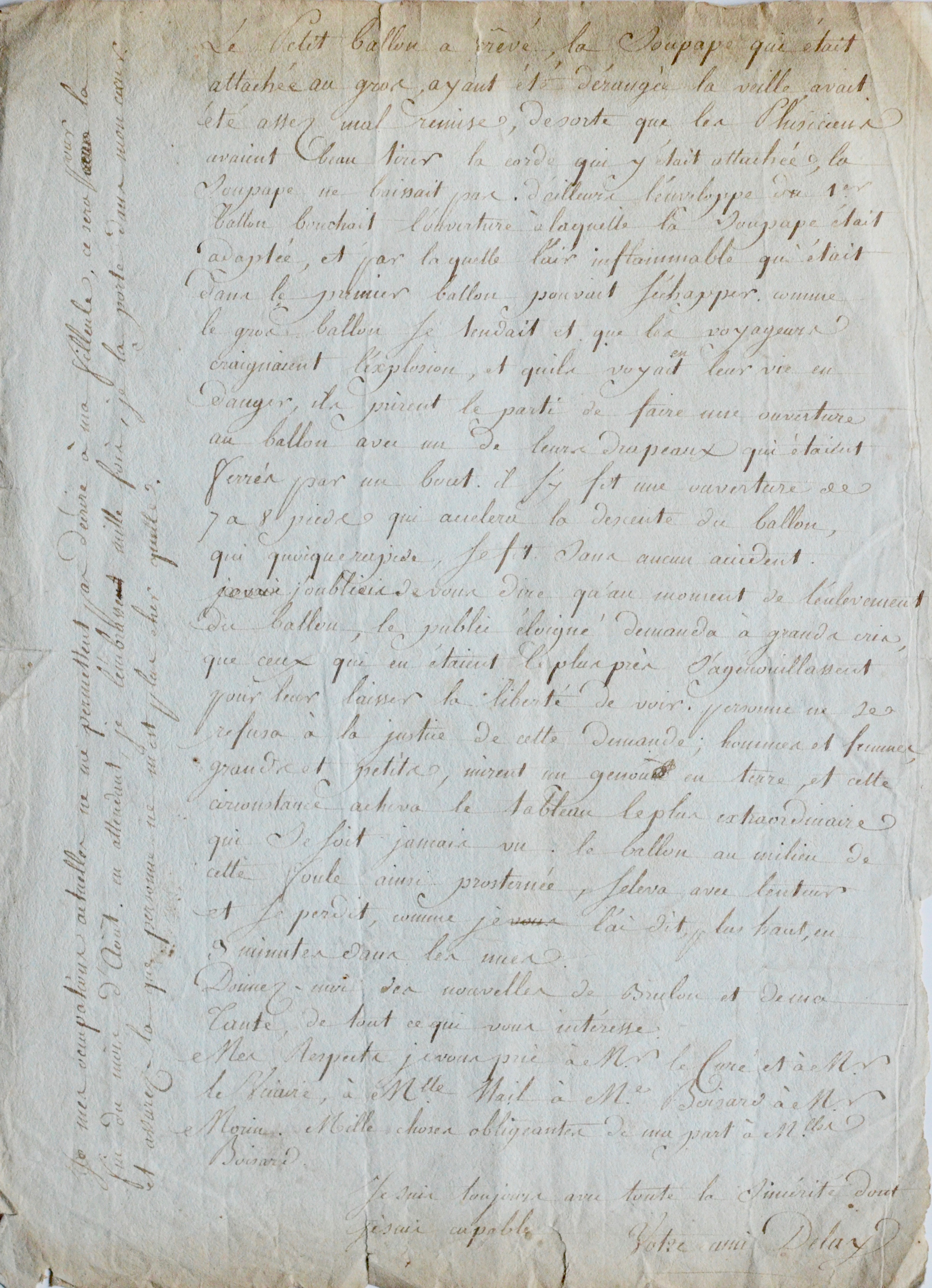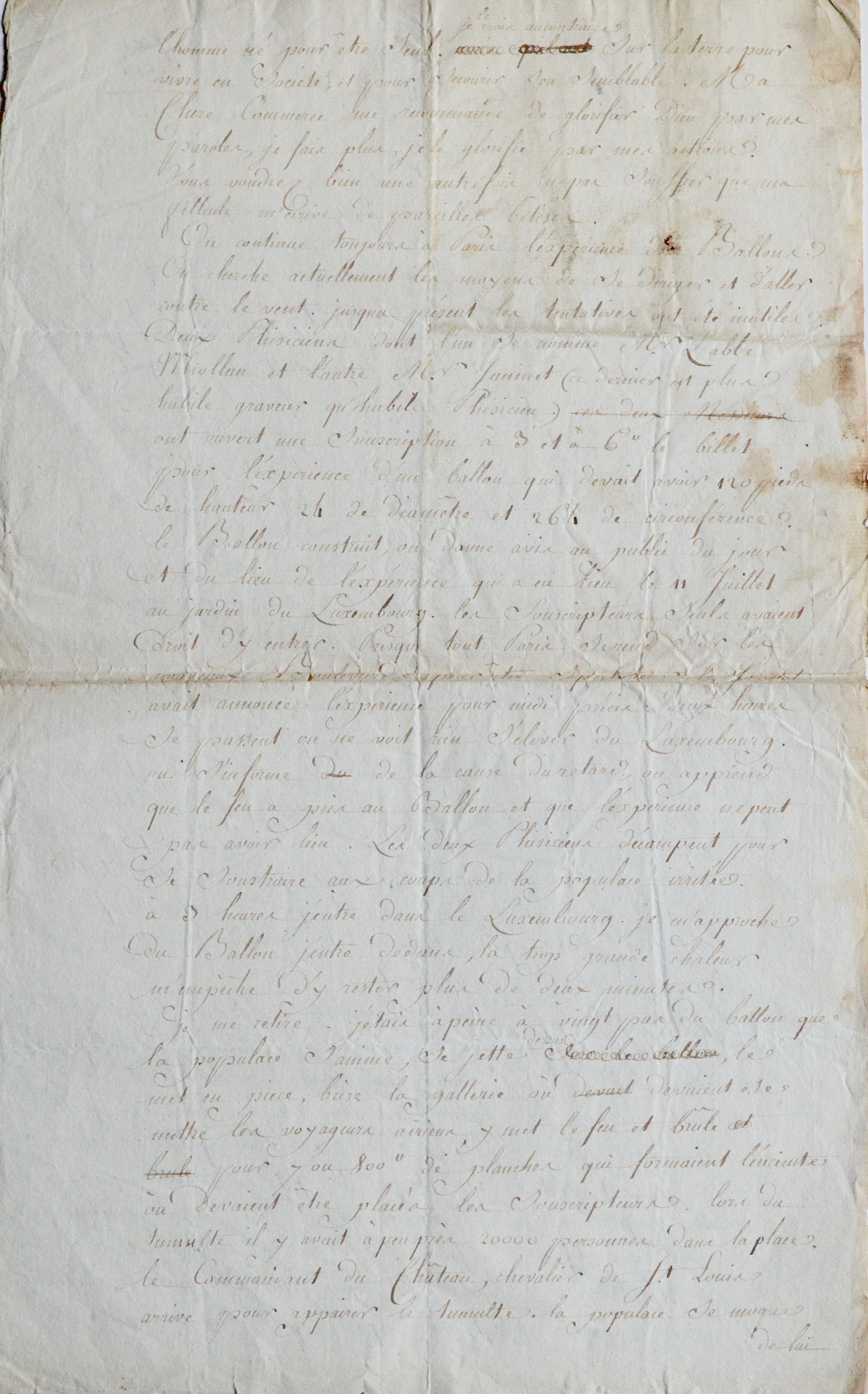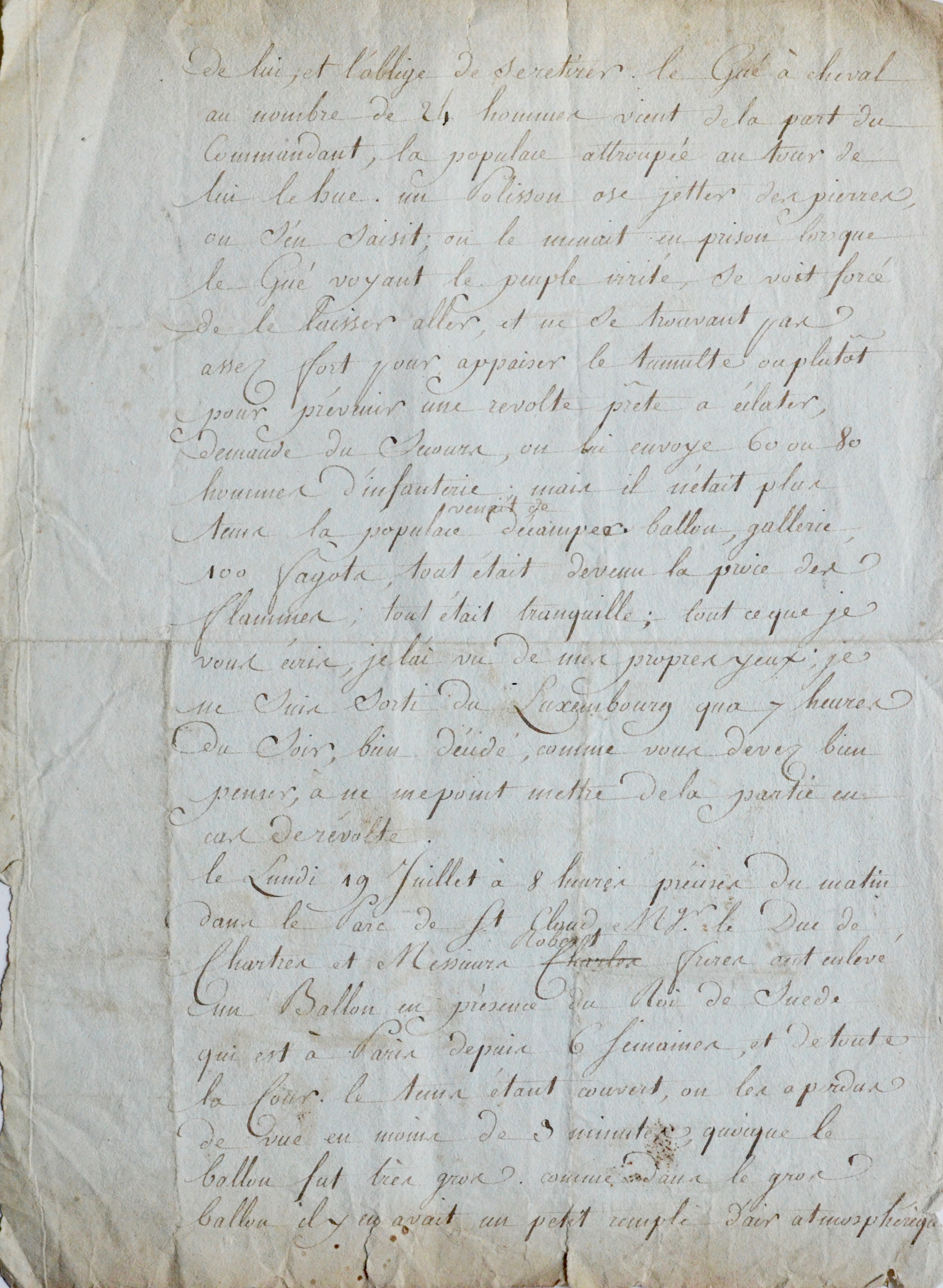 "[...] On continue toujours à Paris l’expérience des ballons. On cherche actuellement les moyens de se diriger et d’aller contre le vent. Jusqu’à présent les tentatives ont été inutiles. Deux physiciens dont l’un se nomme Mr l’Abbé Miollan [sic] et l’autre Mr Janinet (ce dernier est plus habile graveur qu’habile physicien) ont ouvert une souscription à 3 et à 6# le billet pour l’expérience d’un ballon qui devait avoir 120 pieds de hauteur 24 de diamètre et 264 de circonférence. Le ballon construit, on donne avis au public du jour et du lieu de l’expérience qui a eu lieu le 11 juillet au jardin du Luxembourg. Les souscripteurs seuls avaient droit d’y entrer. Presque tout Paris se rend sur les nouveaux boulevards pour être spectateur. Le journal avait annoncé l’expérience pour midi précise. Deux heures se passent, on ne voit rien s’élever du Luxembourg. On s’informe de la cause du retard, on apprend que le feu a pris au ballon et que l’expérience ne peut pas avoir lieu. Les deux physiciens décampent pour se soustraire aux coups de la populace irritée. A 3 heures j’entre dans le Luxembourg, je m’approche du ballon, j’entre dedans, la trop grande chaleur m’empêche d’y rester plus de deux minutes. Je me retire. J’étais à peine à vingt pas du ballon que la populace s’anime, se jette dessus, le met en pièce, brise la galerie où devaient se mettre les voyageurs aériens, y met le feu et brûle pour 7 ou 800# de planches qui formaient l’enceinte où devait être placés les souscripteurs. Lors du tumulte il y avait à peu près 20000 personnes dans la place. Le Commandant du Château, chevalier de Saint-Louis arrive pour apaiser le tumulte. La populace se moque de lui et l’oblige de se retirer. Le gué à cheval au nombre de 24 hommes vient de la part du Commandant, la populace attroupée autour de lui le hue. Un polisson ose jeter des pierres, on s’en saisit. On le menait en prison lorsque le gué voyant le peuple irrité, se voit forcé de le laisser aller, et ne se trouvant pas assez fort pour apaiser le tumulte ou plutôt pour prévenir une révolte prête à éclater, demande du secours. On lui envoie 60 ou 80 hommes d’infanterie. Mais il n’était plus temps, la populace venait de décamper : ballon, galerie, 100 fagots, tout était devenu la proie des flammes. Tout était tranquille. Tout ce que je vous écris, je l’ai vu de mes propres yeux. Je ne suis sorti du Luxembourg qu’à 7 heures du soir, bien décidé, comme vous devez bien penser, à ne me point mettre de la partie en cas de révolte. Le lundi 19 juillet à 8 heures précises du matin dans le Parc de Saint Cloud Monseigneur le Duc de Chartres et Messieurs Robert frères ont enlevé un ballon en présence du Roi de Suède qui est à Paris depuis 6 semaines, et de toute la Cour. Le tems étant couvert, on les a perdus de vue au moins de 3 minutes, quoique le ballon fût très gros. Comme dans le gros ballon il y en avait un petit rempli d’air atmosphérique, le petit ballon a crevé. La soupape qui était attachée au gros, ayant été dérangée la veille, avait été assez mal remise, de sorte que les physiciens avaient beau tirer la corde qui y était attachée, la soupape ne baissait pas. D’ailleurs l’enveloppe du 1er ballon bouchait l’ouverture à laquelle la soupape était adaptée, et par laquelle l’air inflammable qui était dans le premier ballon pouvait s’échapper. Comme le gros ballon se tendait et que les voyageurs craignaient l’explosion, et qu’ils voyaient leur vie en danger, ils prirent le parti de faire une ouverture au ballon avec un de leurs drapeaux qui étaient ferrés au bout. Il s’y fit une ouverture de 7 à 8 pieds qui accéléra la descente du ballon qui quoique rapide, se fit sans aucun accident. J’oubliai de vous dire qu’au moment de l’enlèvement du ballon, le public éloigné demanda à grands cris, que ceux qui en étaient le plus près s’agenouillassent pour leur laisser la liberté de voir. Personne ne se refusa à la justice de cette demande, hommes et femmes, grands et petits, mirent un genou en terre, et cette circonstance acheva le tableau le plus extraordinaire qui se soit jamais vu : le ballon au milieu de cette foule ainsi prosternée s’éleva avec lenteur et se perdit, comme je l’ai dit plus haut, en 3 minutes dans les airs [...]".