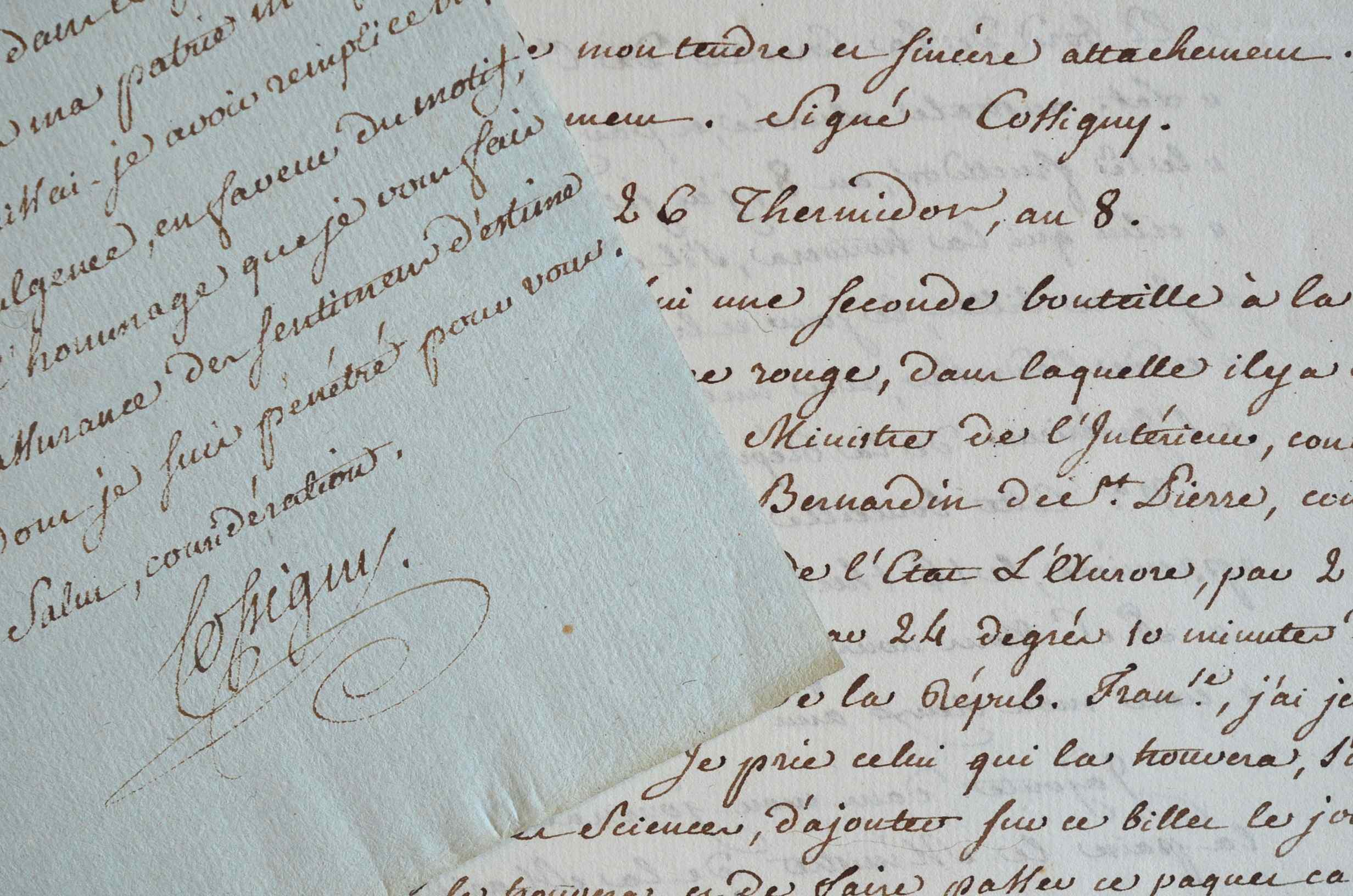 Joseph François Charpentier de Cossigny (Port-Louis (île Maurice), 1730/1809)Cossigny adresse un exemplaire de son ouvrage Voyage à Canton, paru la même année, et joint des extraits de son journal tenu à bord de la corvette Aurore, alors qu'il voyageait en Indes Orientales. La copie est écrite et certifiée conforme par Cossigny, reprend les passages où il a jeté des bouteilles à la mer. «Le 16 Thermidor an 8. J'ai jeté aujourd'hui à la mer une bouteille de verre bien embouchée et bien cachetée avec de la cire, adressée au Ministre de l'Intérieur de la Répub. Fran. à Paris, avec un billet à l'adresse du citoyen Bernardin St Pierre, Membre de l'Institut national de France, au Louvre [...]». Il prie, celui qui trouvera la bouteille, de consigner la date et le lieu où la découverte a été faite et invite tous les navigateurs à faire de même, afin de mieux cerner la direction des courants marins.