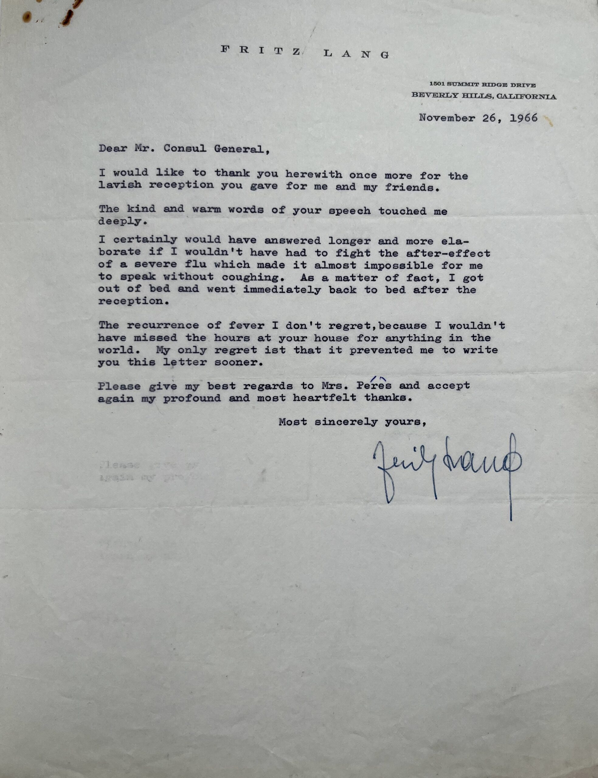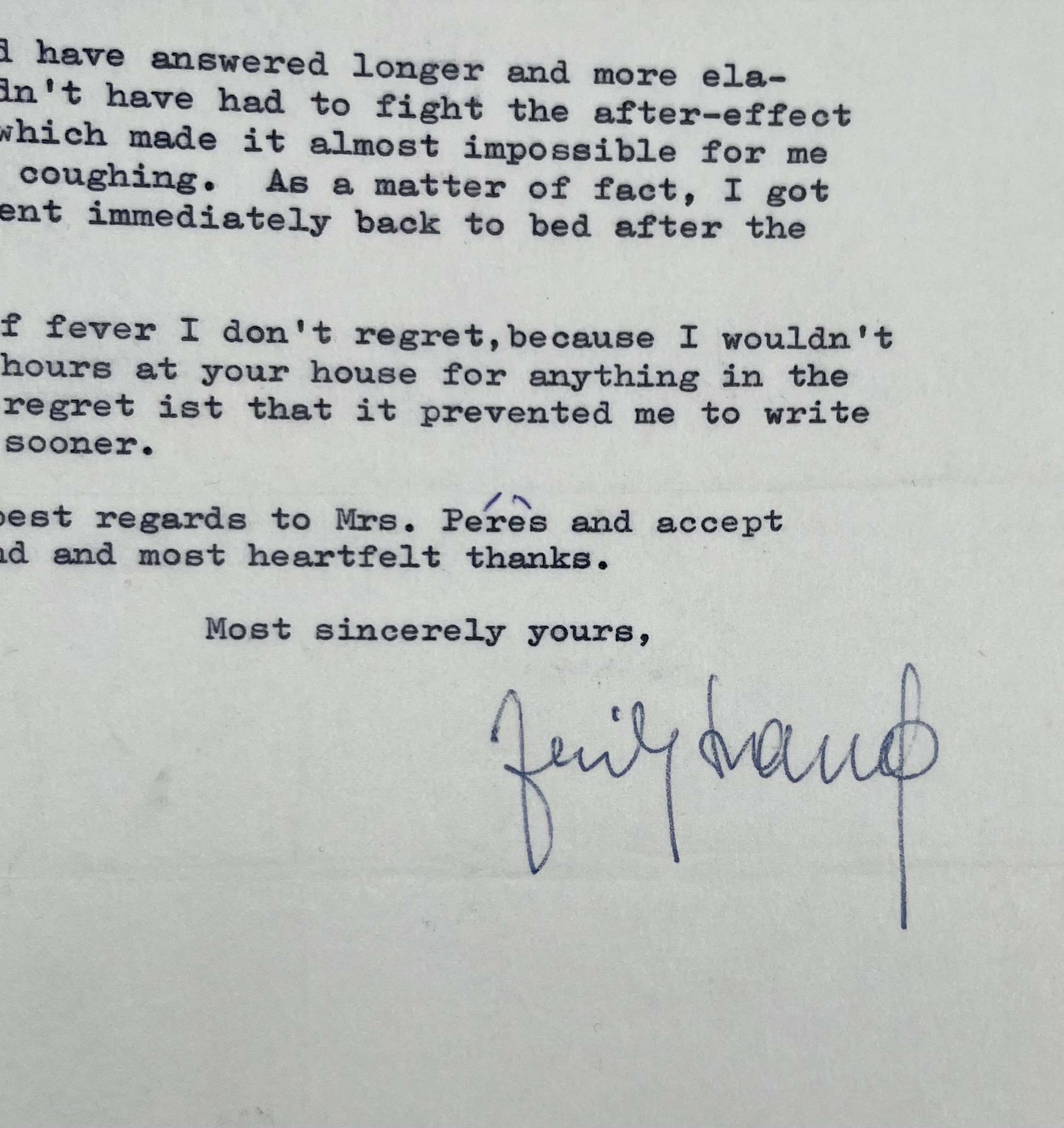 "Dear Mr. Consul General. I would like to thank you herewith once more for the lavish reception you gave for me and my friends. The kind and warm words of your speech touched me deeply. I certainly would have answered longer and more elaborate if I wouldn't have had to fight the after-effect of a severe flu which made it almost impossible for me to speak without coughing. As a matter of fact, I got out of bed and went immediately back to bed after the reception. The recurrence of fever I don't regret, because I wouldn't have missed the hours at your house for anything in the world. My only regret is that it prevented me to write you this letter sooner. Please give my best regards to Mrs. Pérès and accept again my profound and most heartfelt thanks".