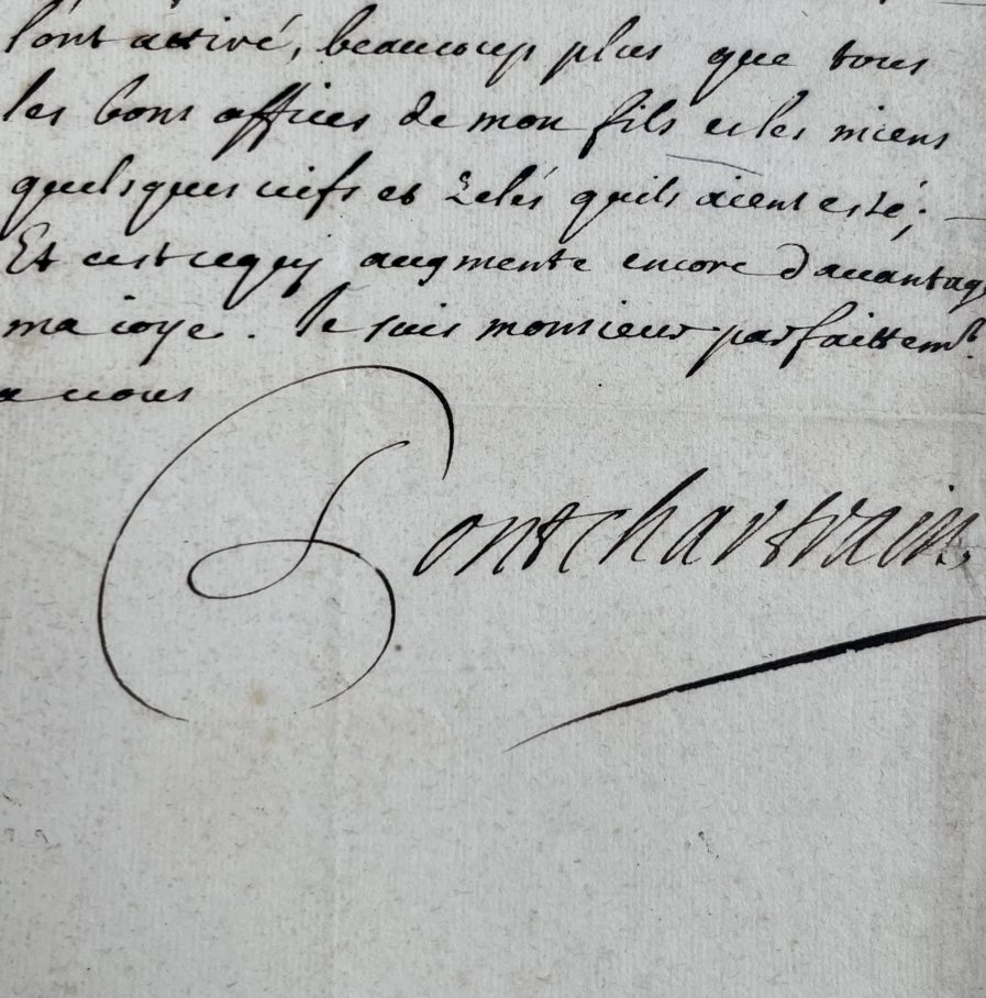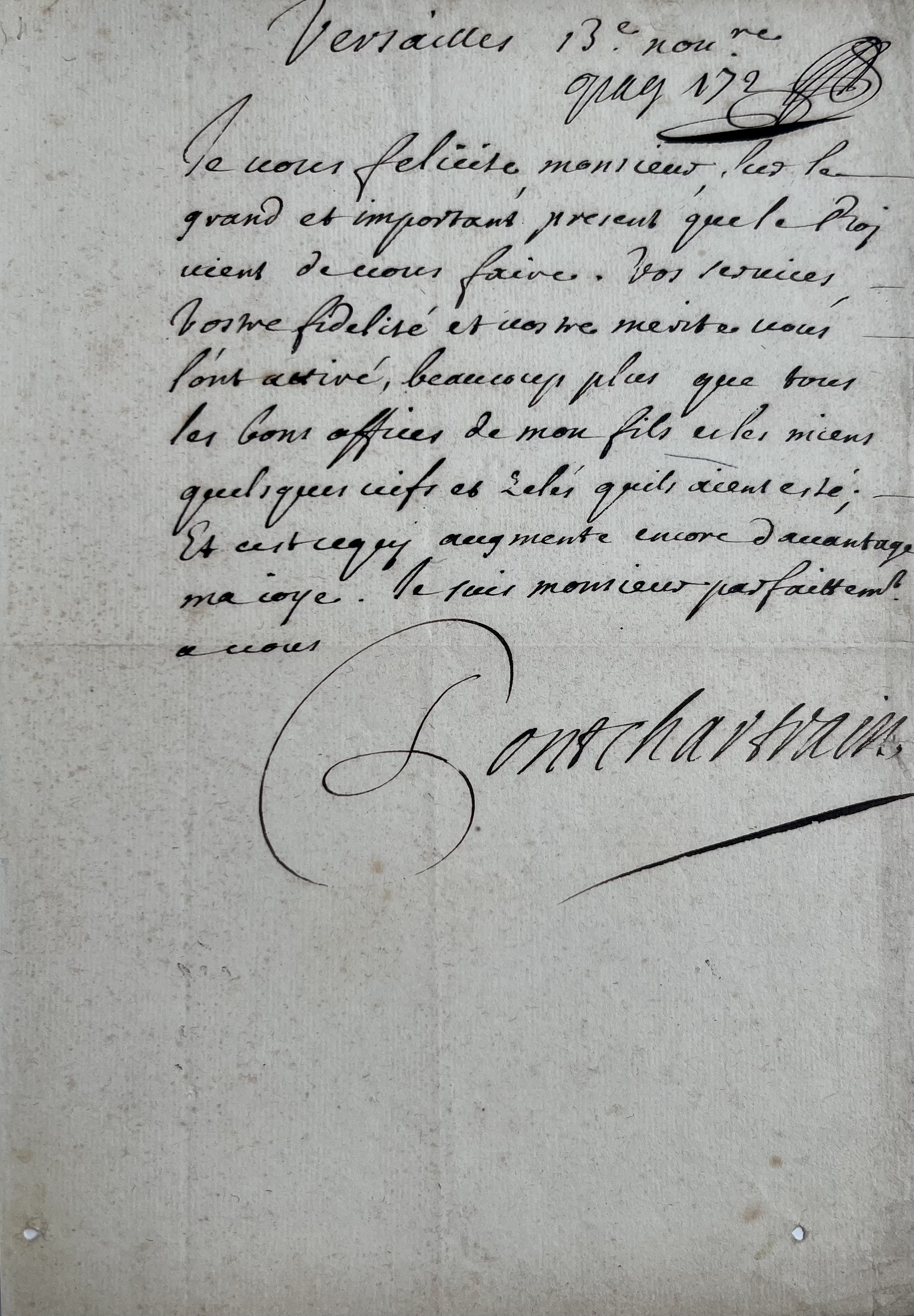 Louis Phélyppeaux de Pontchartrain, secrétaire d’Etat du Roi Louis XIV puis Chancelier de France félicite très chaleureusement son correspondant pour avoir reçu les grâces du Roi :