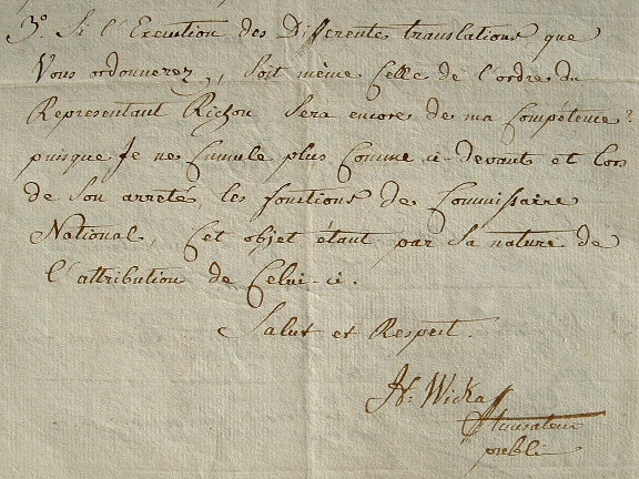 Henri Joseph Wicka (Delémont, 1753/1837)Lettre de l'accusateur public du tribunal criminel du département du Mont-Terrible, Henri Joseph Wicka, relative au lieu d'emprisonnement des condamnés du Mont-Terrible. Jusqu'à présent, tous étaient conduits dans les prisons de Besançon, mais il vient de recevoir une lettre du commissaire du pouvoir exécutif du Doubs, le priant de trouver d'autres prisons. «Je vous observe, citoyen ministre, que le tribunal criminel de ce département tient encore provisoirement ses séances dans la commune de Delémont, où il avoit été originellement fixé par les représentants du peuple en mission dans ce département lors de sa réunion. En attendant qu'une maison de justice et des prisons soient établies à Porrentruy, chef-lieu du département et que les réparations nécessaires pour y recevoir ledit tribunal soient achevées. Que la ville de Delémont, quoique placée au centre du département, est néanmoins d'un côté très voisine de la frontière, que les prisons qui se construisent à Porrentruy, quoique plus avancées dans l'intérieur, ne seront cependant pas assez éloignées des frontières pour être exemptées des dangers, que le représentant Richou a voulu écarter puisque les mêmes inconvénients se rencontrent à Besançon qui est plus dans l'intérieur que Porrentruy [...]. Wicka demande au ministre des directives pour trois cas de figure.