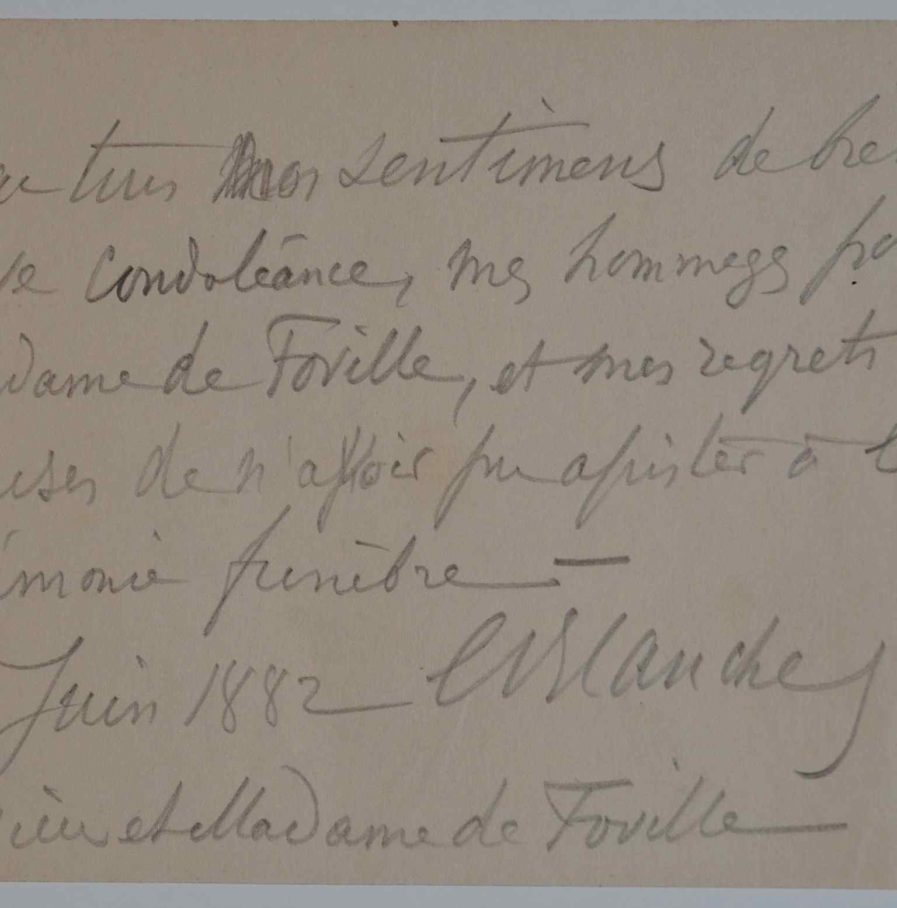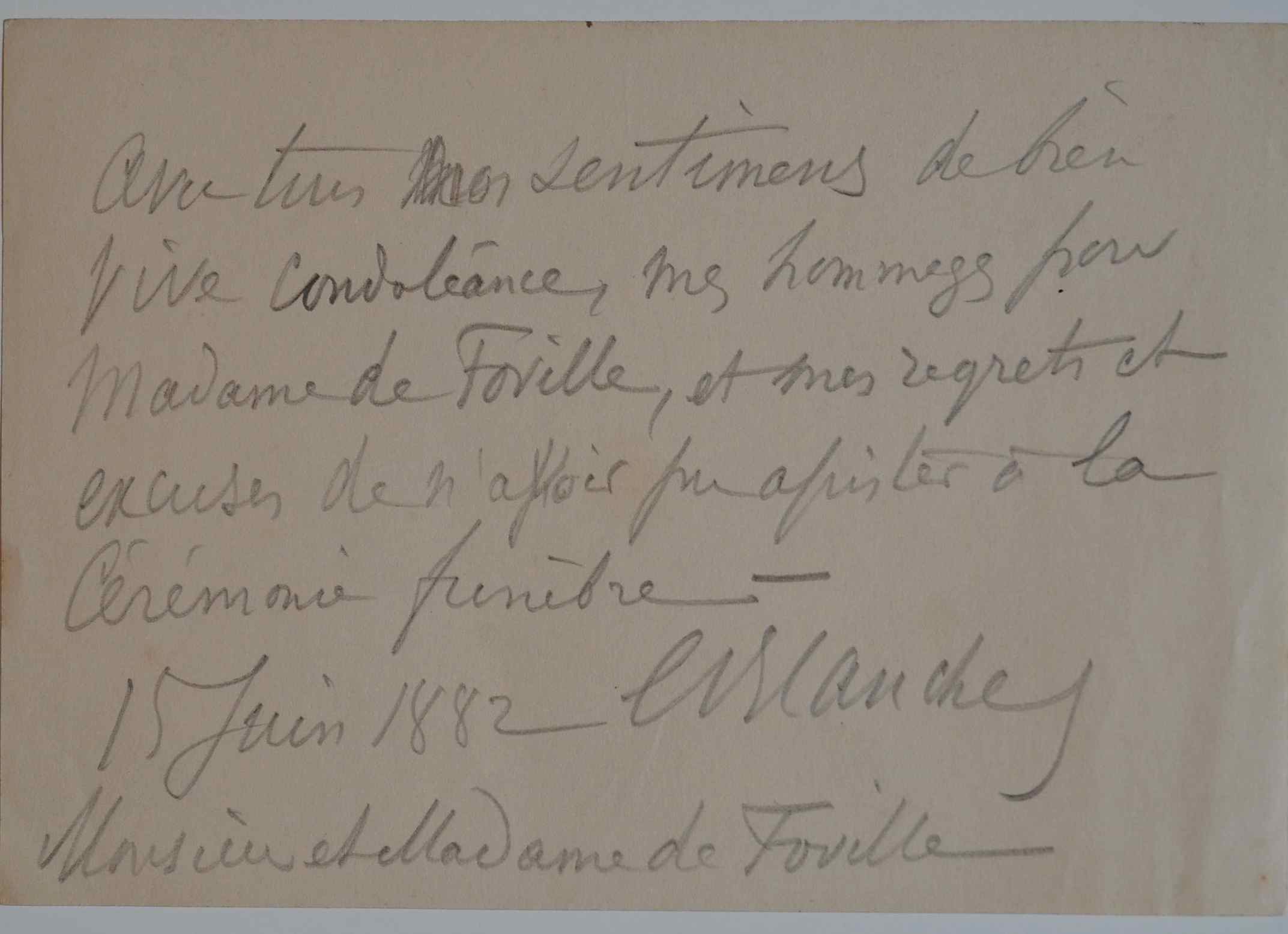 Billet de condoléances adressé à l'aliéniste Achille de Foville (ou à son fils l'économiste Alfred de Foville). «Avec tous nos sentiments de bien vive condoléance, mes hommages pour madame de Foville, et mes regrets et excuses de n'avoir pu assister à la cérémonie funèbre».