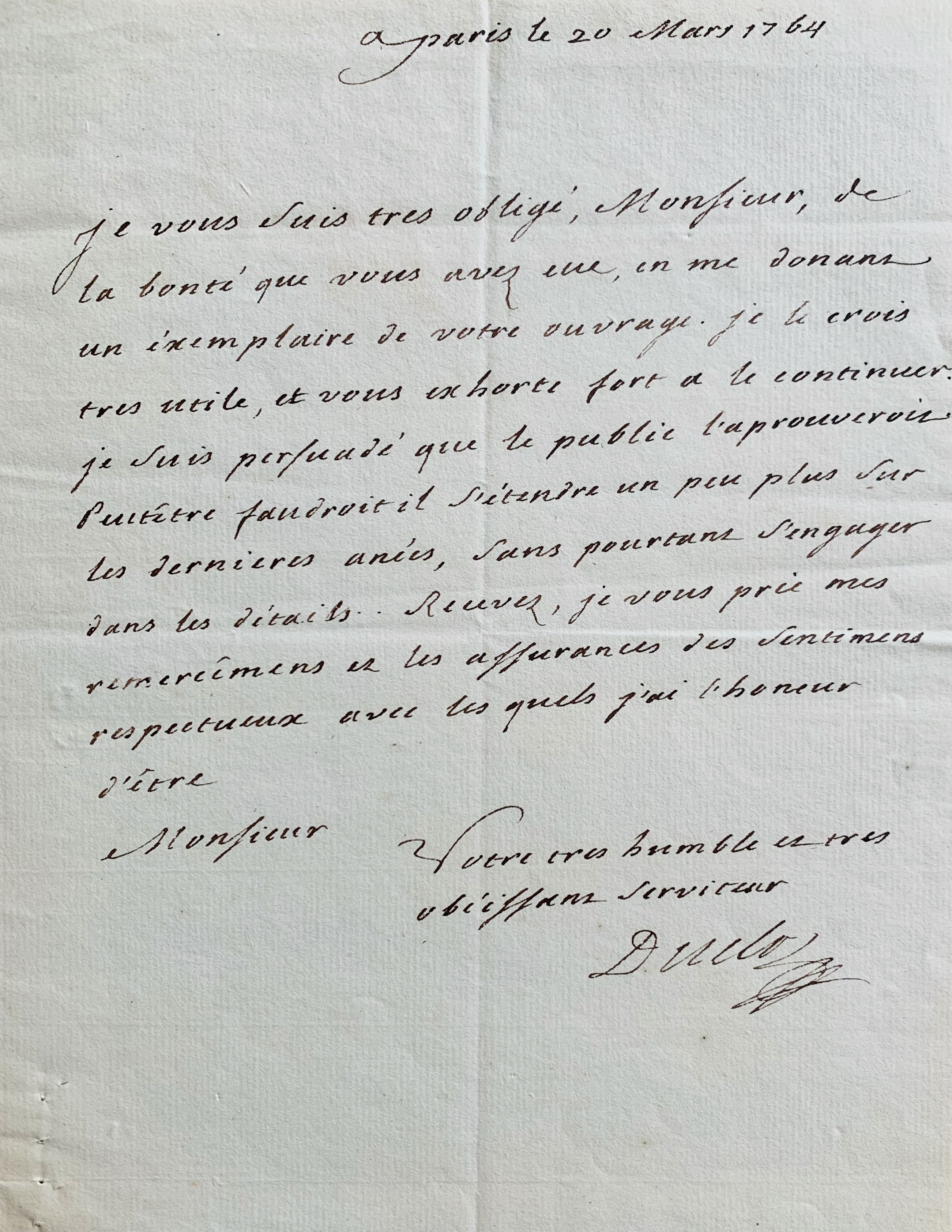 "Je vous suis très obligé, Monsieur, de la bonté que vous avez eue, en me donant [sic] un exemplaire de votre ouvrage. Je le crois très utile, et vous exhorte fort à le continuer. Je suis persuadé que le public l'aprouveroit. Peut-être faudoit il s'étendre un peu plus sur les dernières anées, sans pourtant s'engager dans les détails [...]".