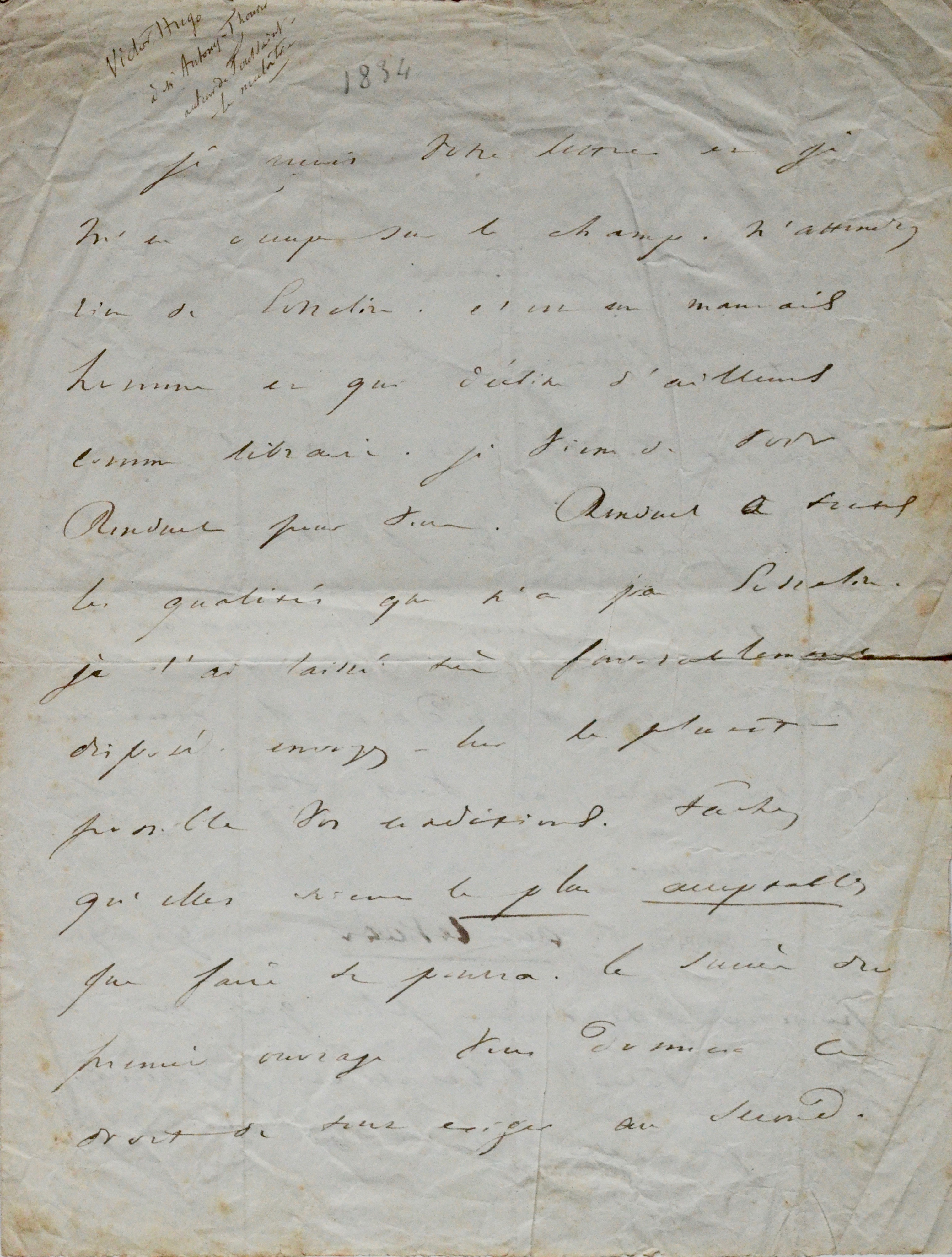 A propos de son éditeur « N’attendez rien de Gosselin. C’est un mauvais homme et qui décline d’ailleurs comme libraire. Je viens de voir Renduel pour vous. Renduel a toutes les qualités que n’a pas Gosselin. Je l’ai laissé très favorablement disposé. Envoyez-lui le plus tôt possible vos conditions. Tâchez qu’elles soient les plus acceptables que faire se pourra. Le succès du premier ouvrage vous donnera le droit de tout exiger au second. Je n’ai pas sous la main en ce moment ma petite correspondance avec le petit Thiers à votre sujet. Il faudrait fouiller des cartons qui m’aveugleraient de poussière et j’ai les yeux toujours bien malades [...] ».